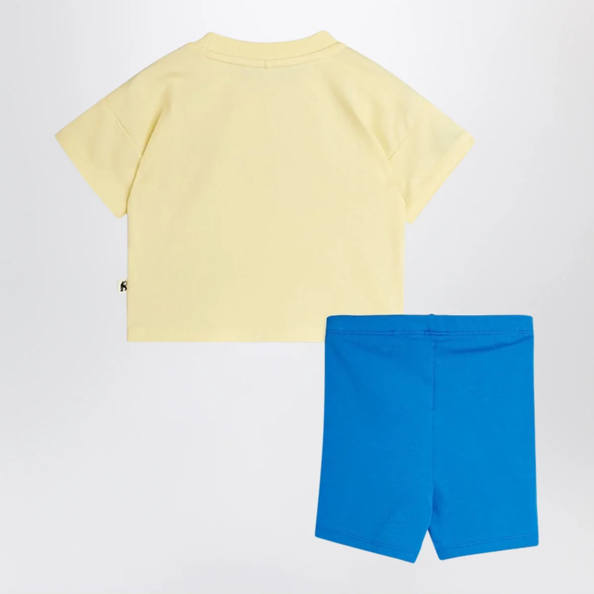 Competo due pezzi di Mini Rodini in cotone organico• Colore: Giallo/Blu• Una T-shirt girocollo con maniche corte e stampa To the Moon and Back su petto• Short con vita elasticizzata