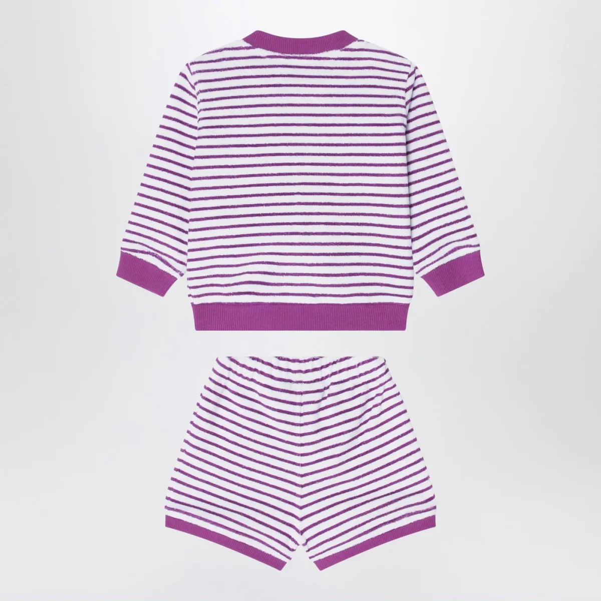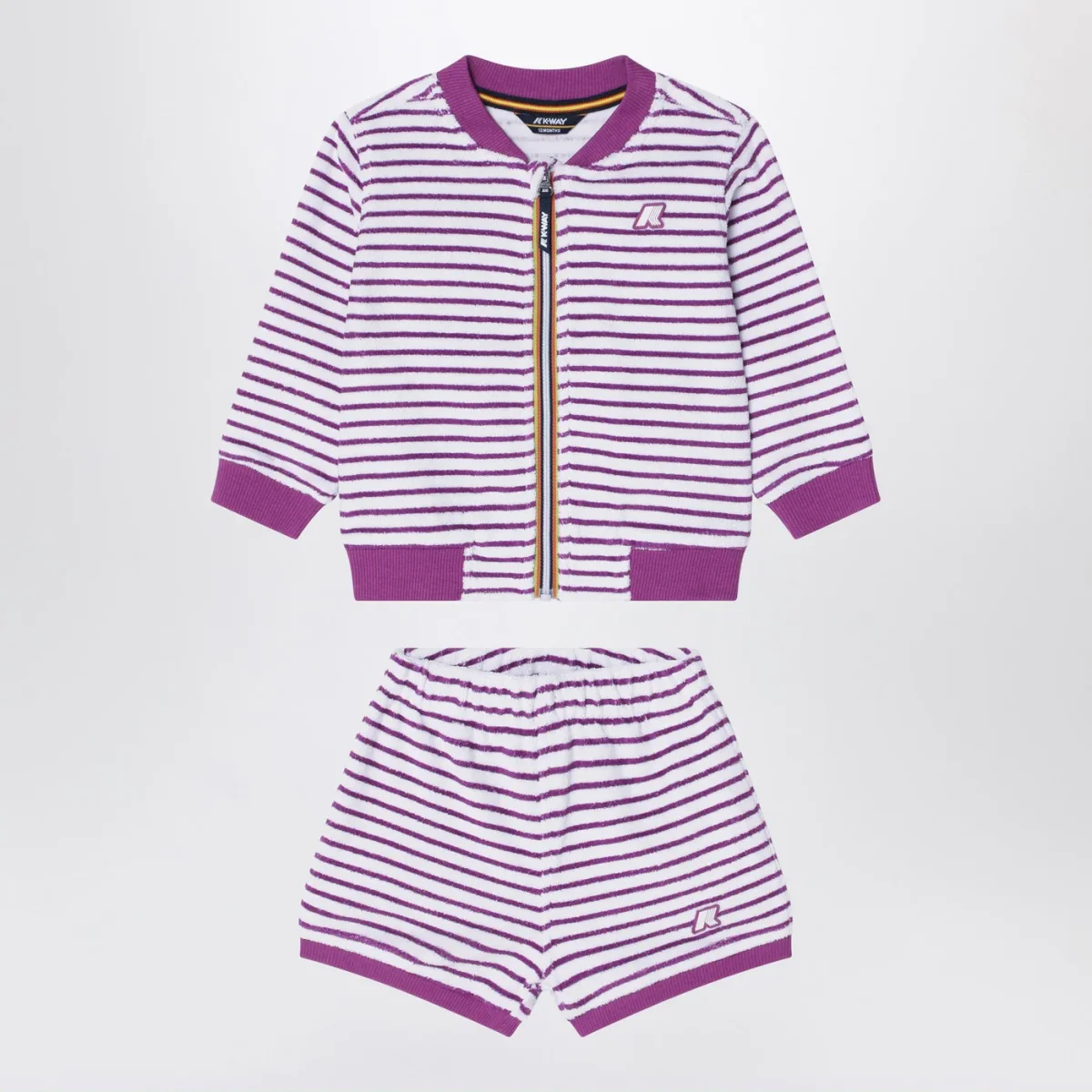 Completo due pezzi di K-Way in spugna di cotone a righe bianco e viola, composto da felpa con zip, manica lunga, bordi a costine e patch logo in silicone sul petto e short con vita elasticizzata e bordi a costine.