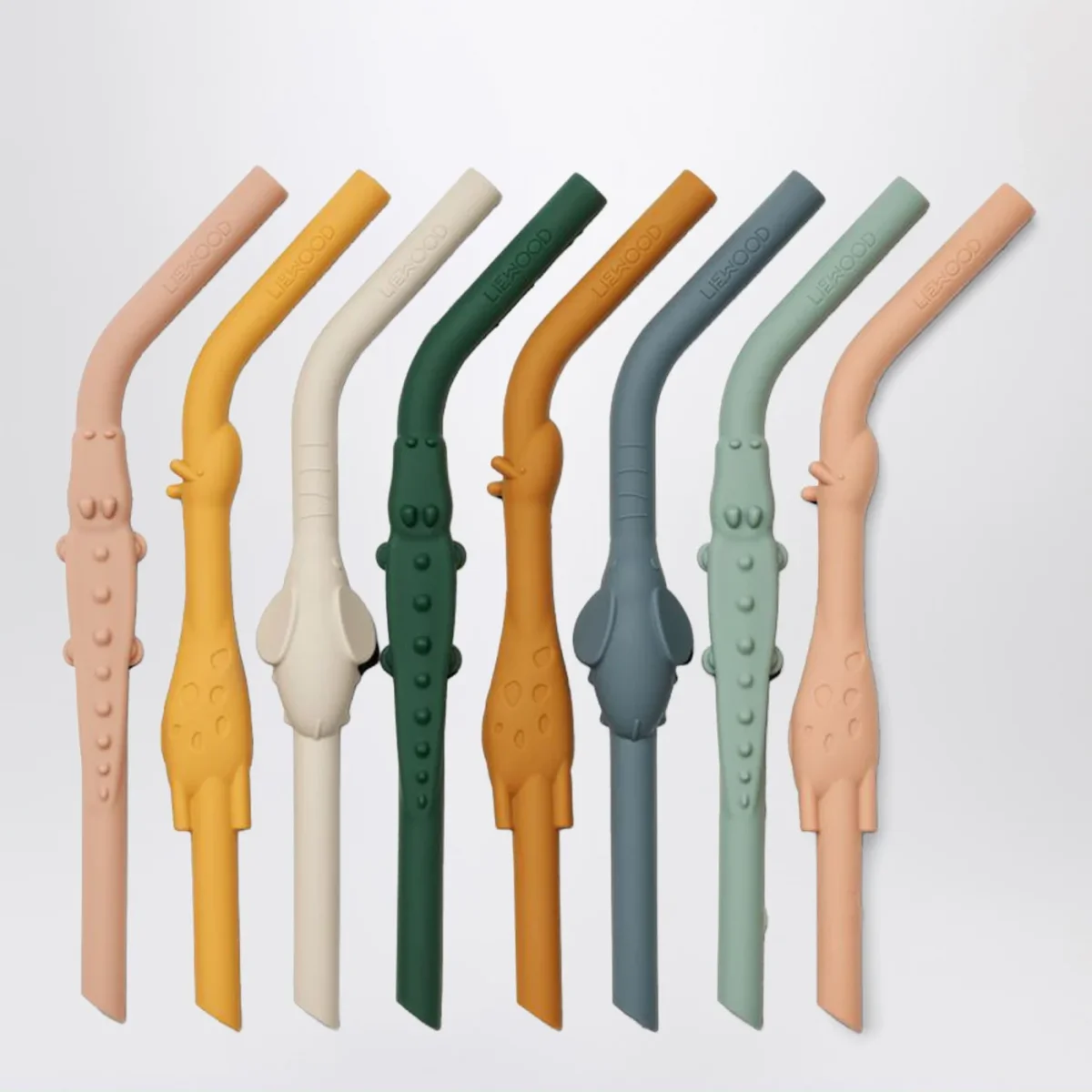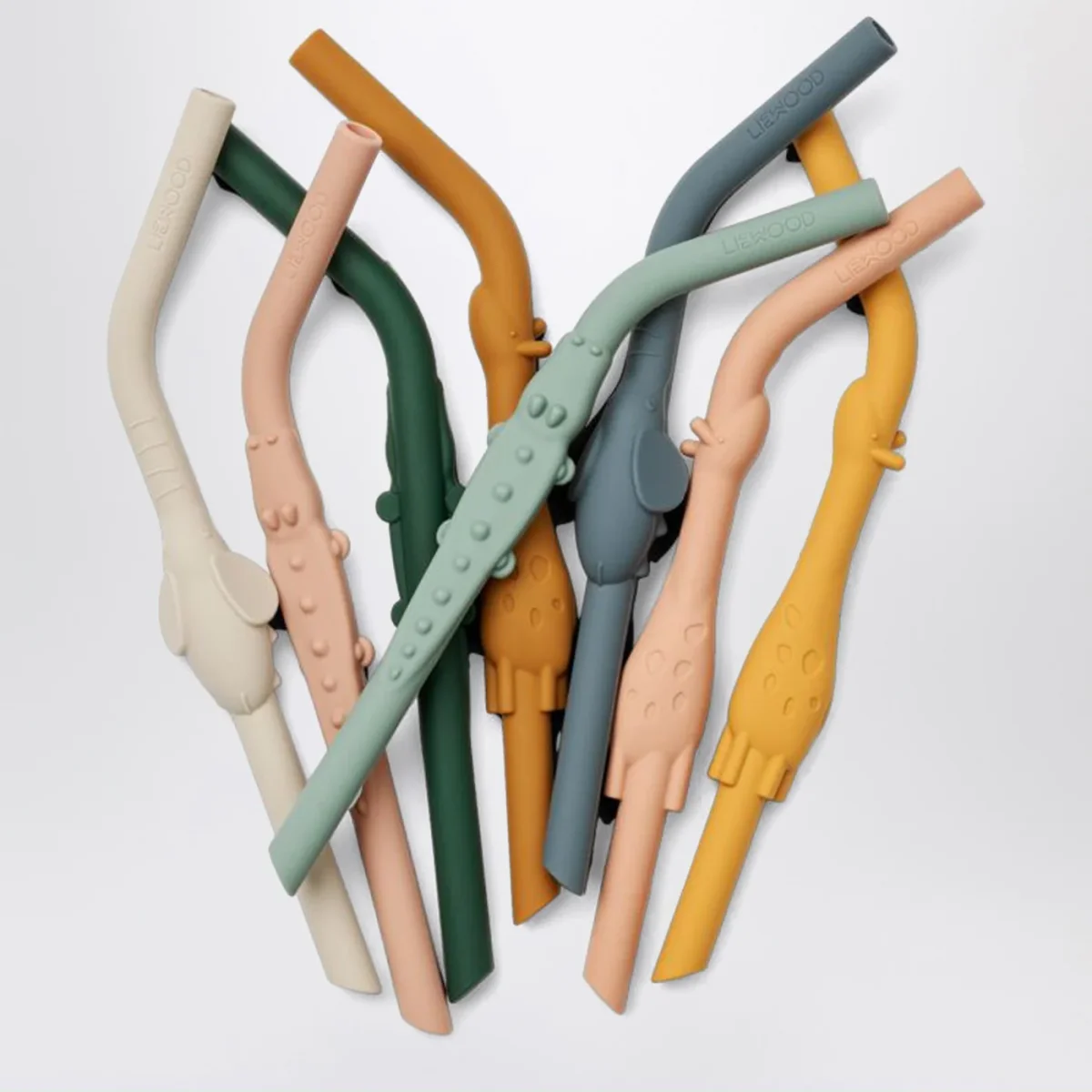 Confezione di Liewood da otto cannucce colorate riutilizzabili in silicone morbide e flessibili a forma di animaletti.