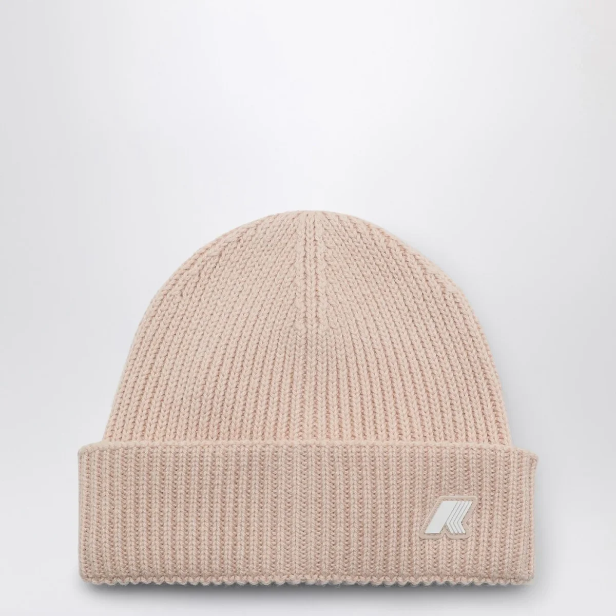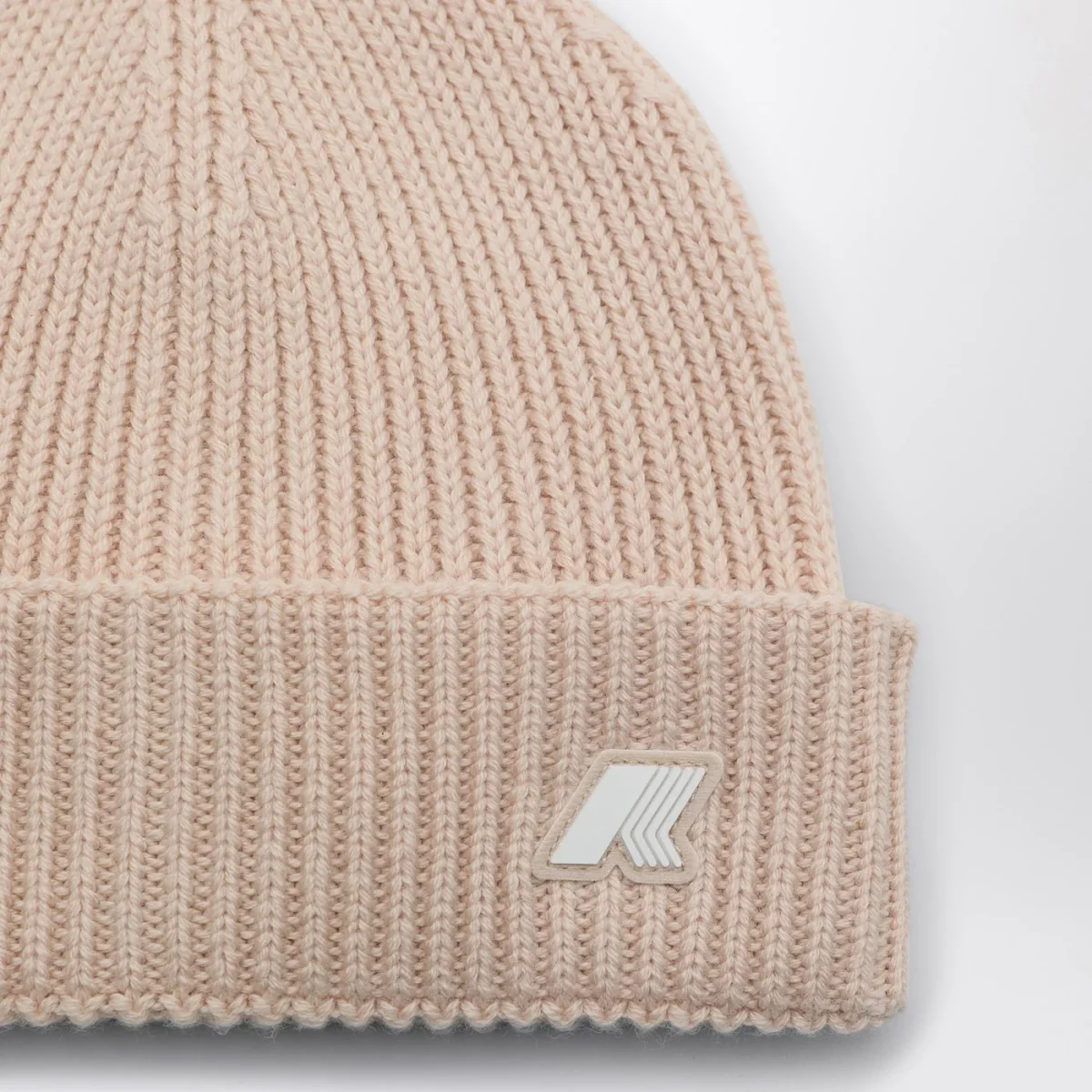 Cuffia di K-Way in lana e cotone rosa chiara, caratterizzata da trama a costine e orlo con risvolto con patch logo.