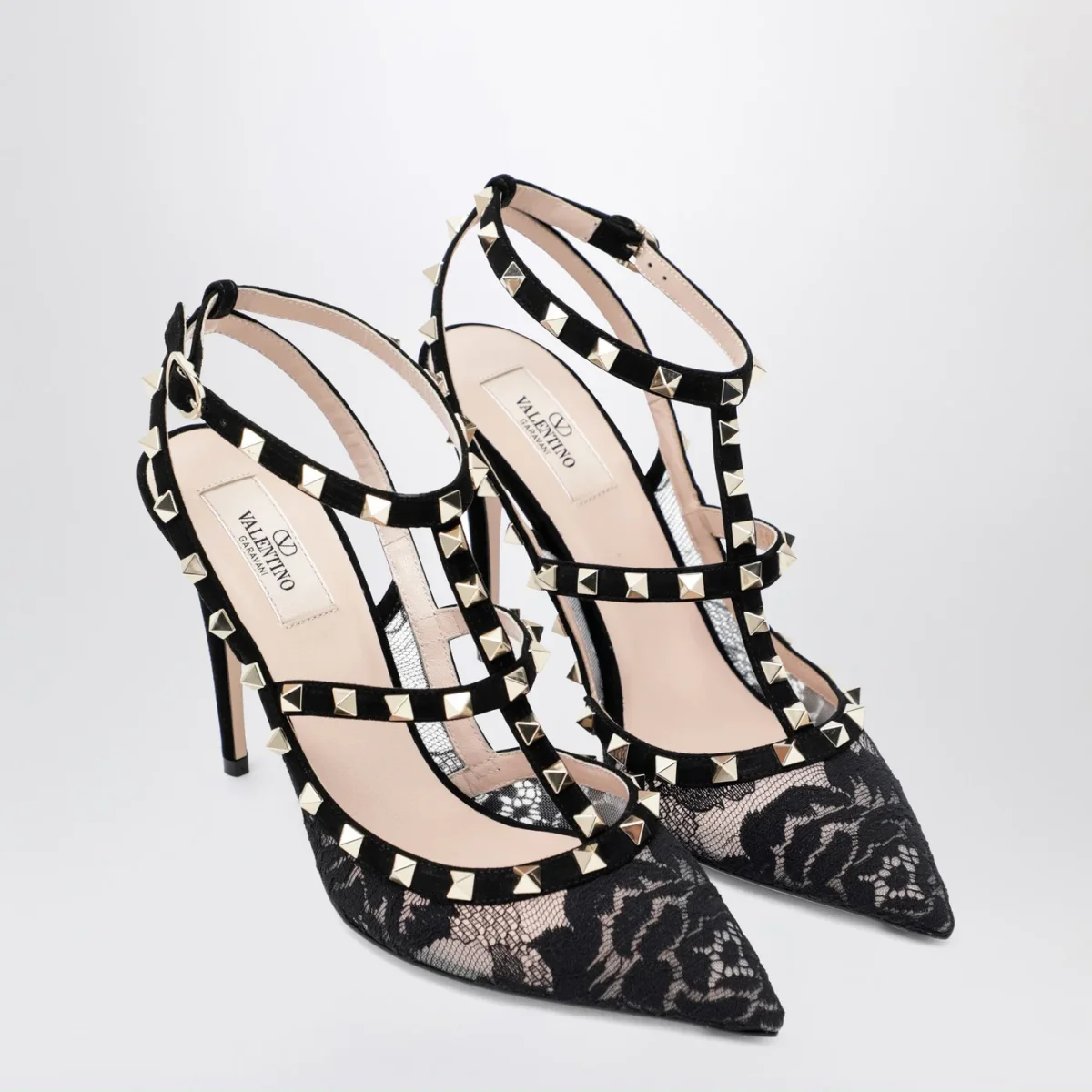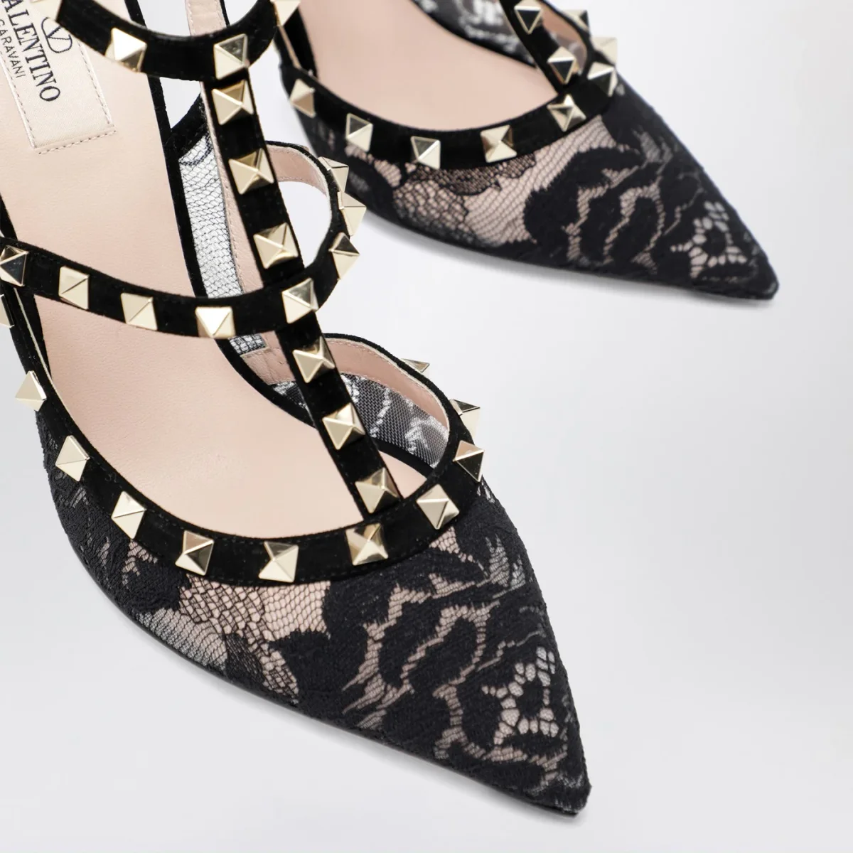Décolleté di Valentino Garavani con tomaia in pizzo nera, caratterizzata da cinturini regolabili alla caviglia, borchie finitura platino, profili in camoscio, design a punta, tacco alto e suola in cuoio.