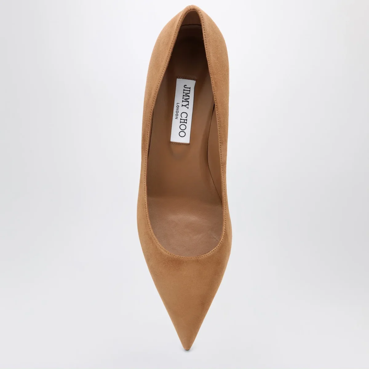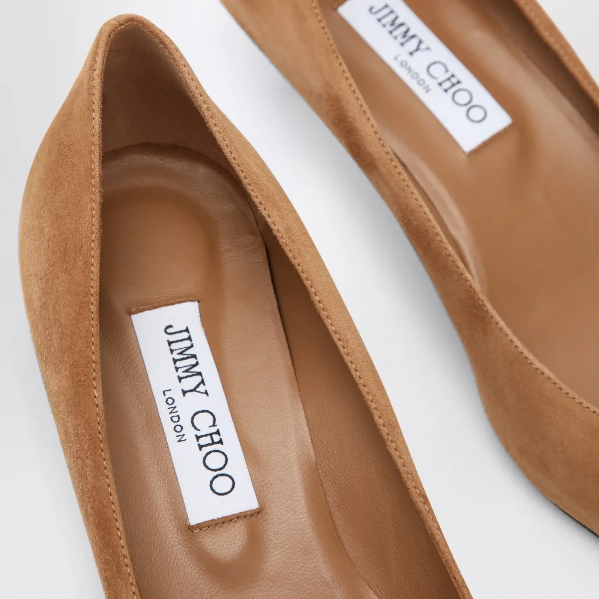 Décolleté di Jimmy Choo in pelle scamosciata color Toffee, caratterizzata da design a punta, tacco basso a stiletto e suola in cuoio.