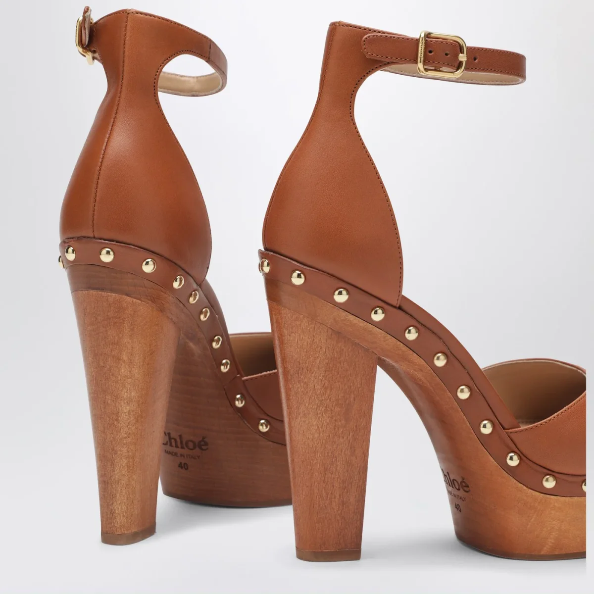 Décolleté di Chloé in pelle marrone• punta tonda• tacco alto e plateau• dettagli con piccole borchie dorate• chiusura con cinturino regolabile alla caviglia• suola in cuoio