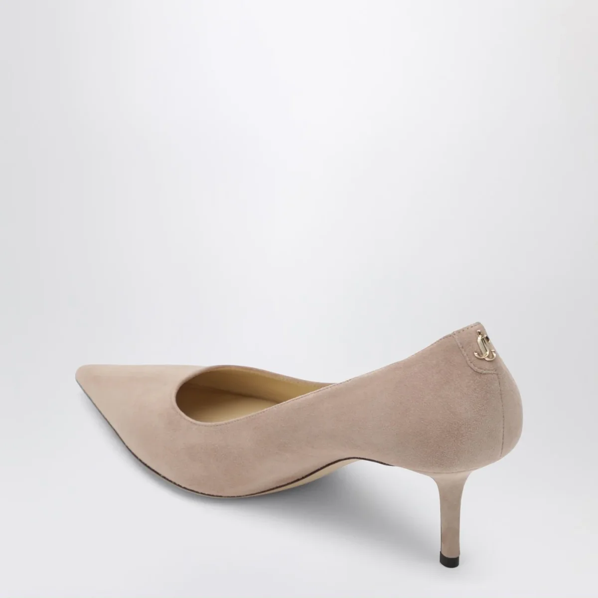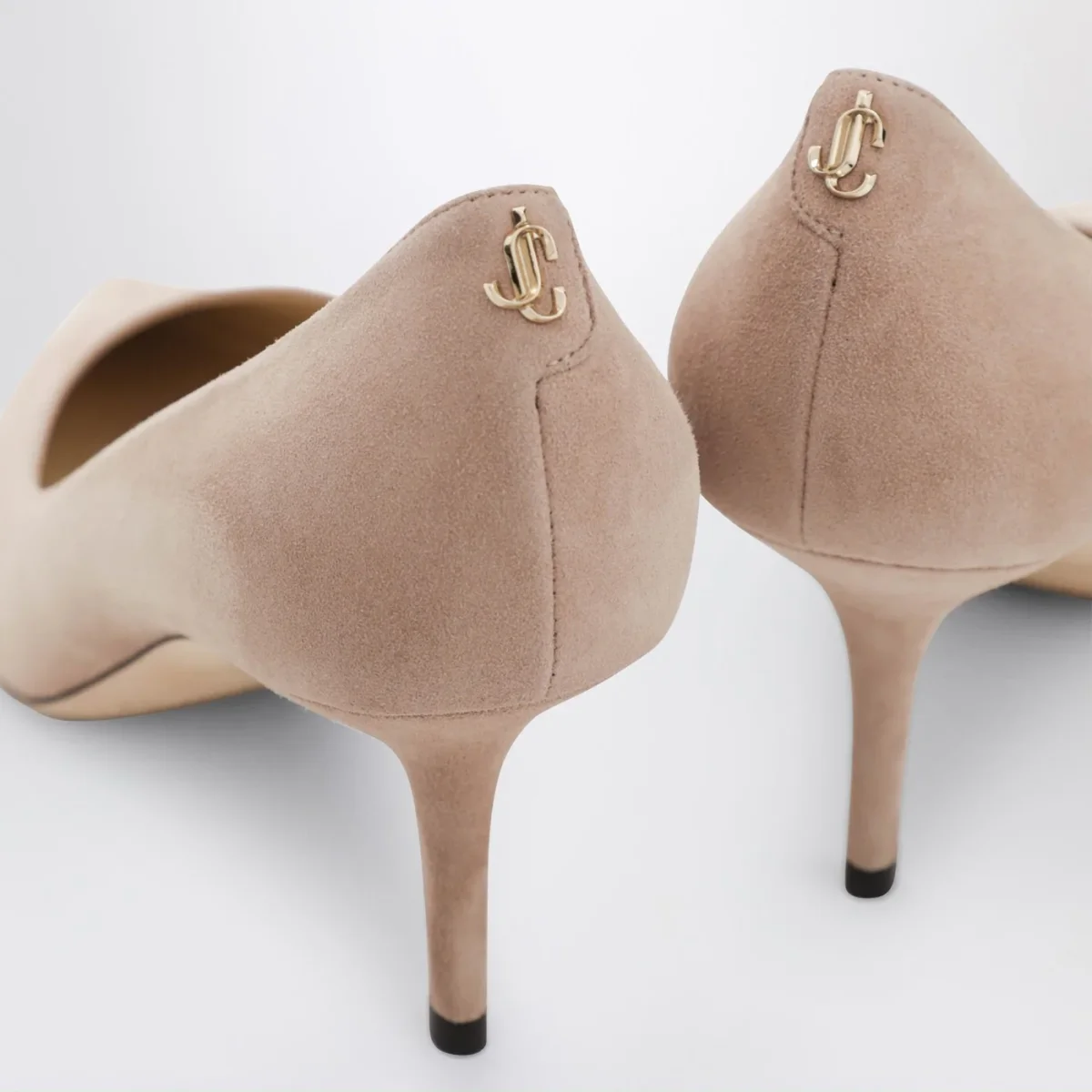 Décolleté di Jimmy Choo in pelle scamosciata rosa chiara• design a punta• tacco alto a stiletto• logo oro sul tallone• suola in cuoio