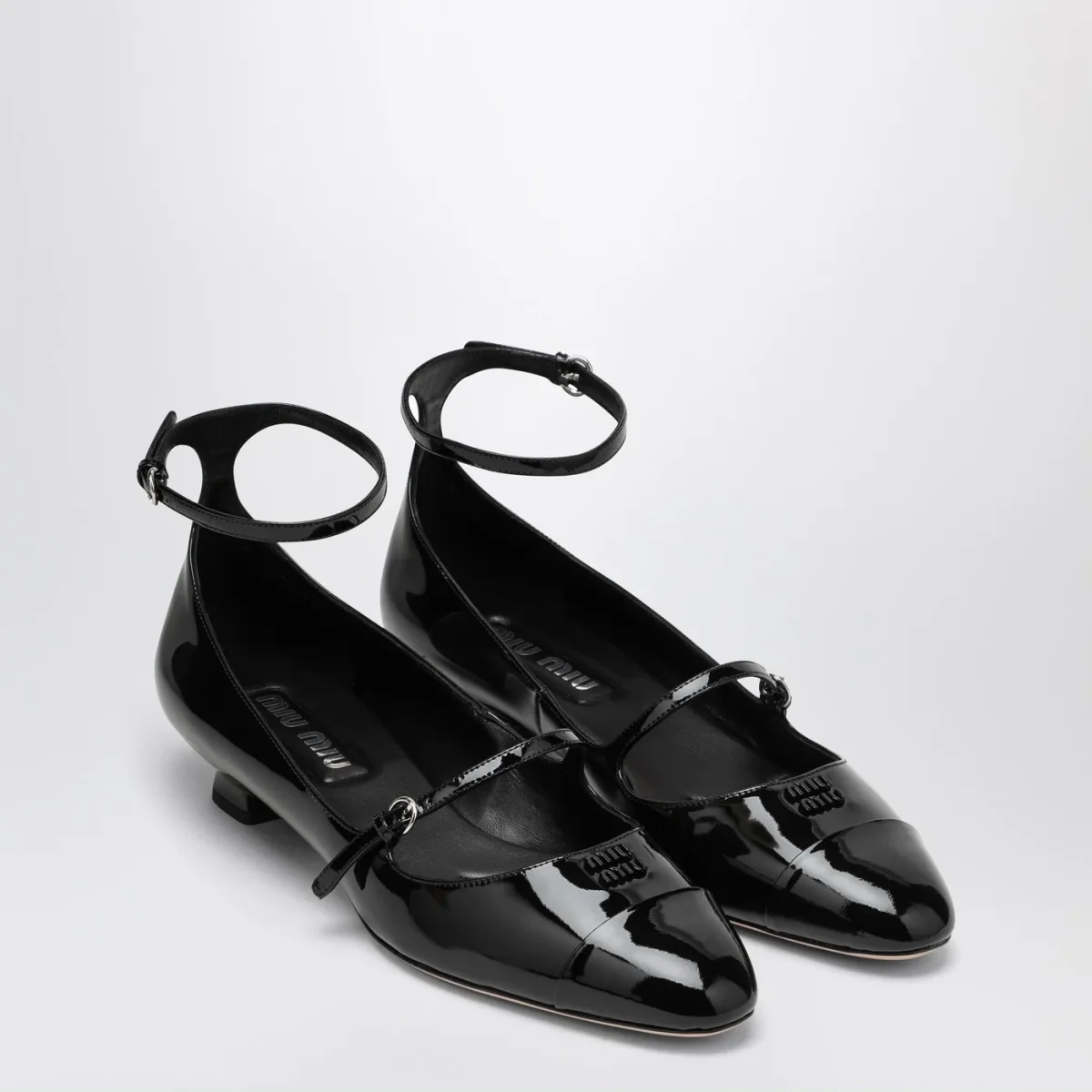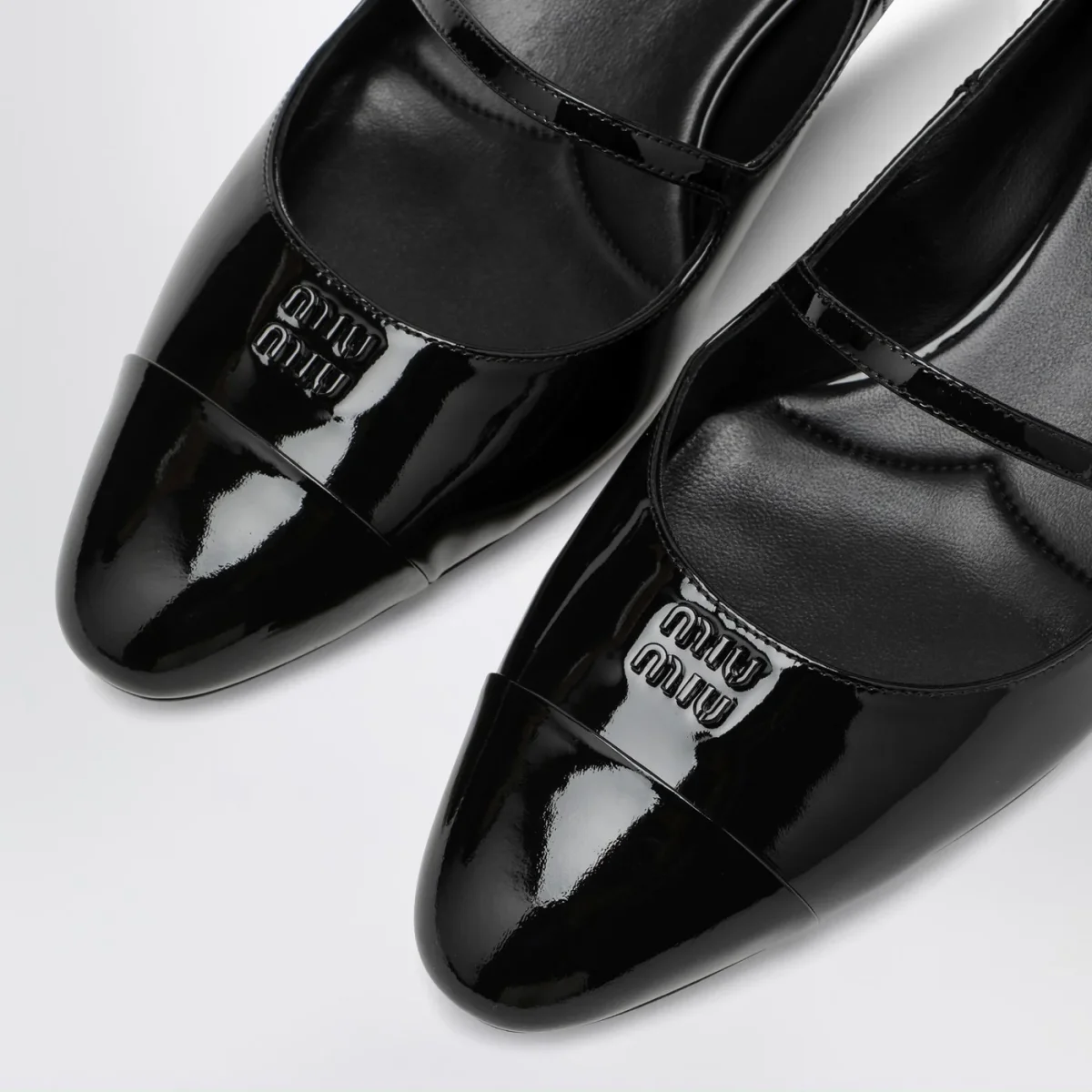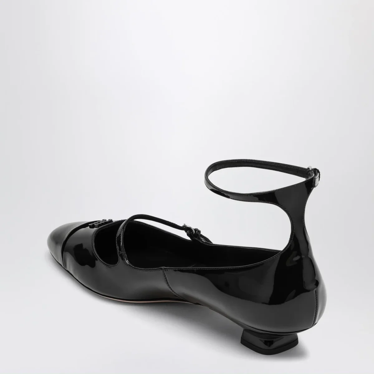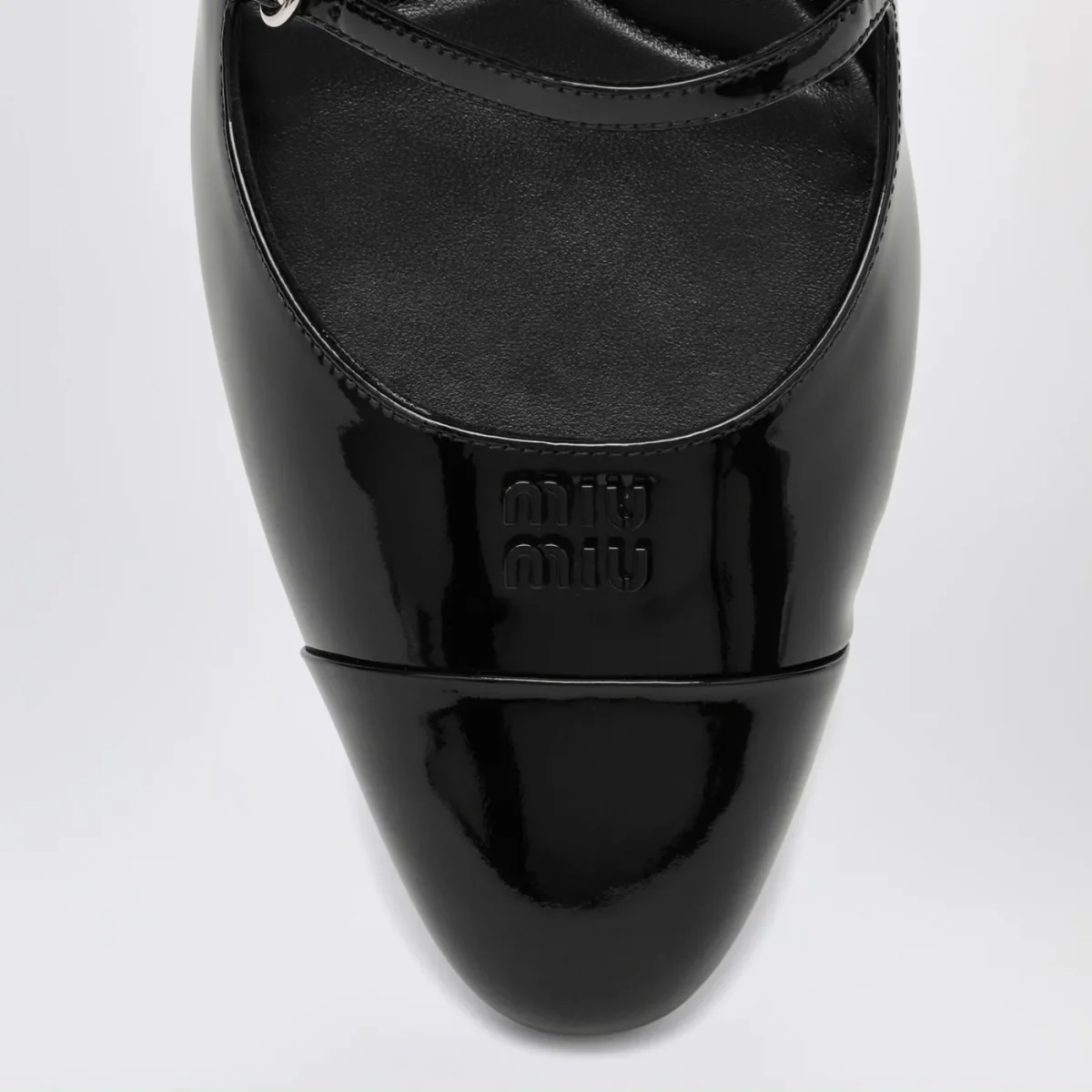 Decolletè di Miu Miu in vernice nero, caratterizzato da punta tonda, logo lettering frontale tono su tono, cinturini con fibbie alla caviglia e sul davanti e suola in cuoio.