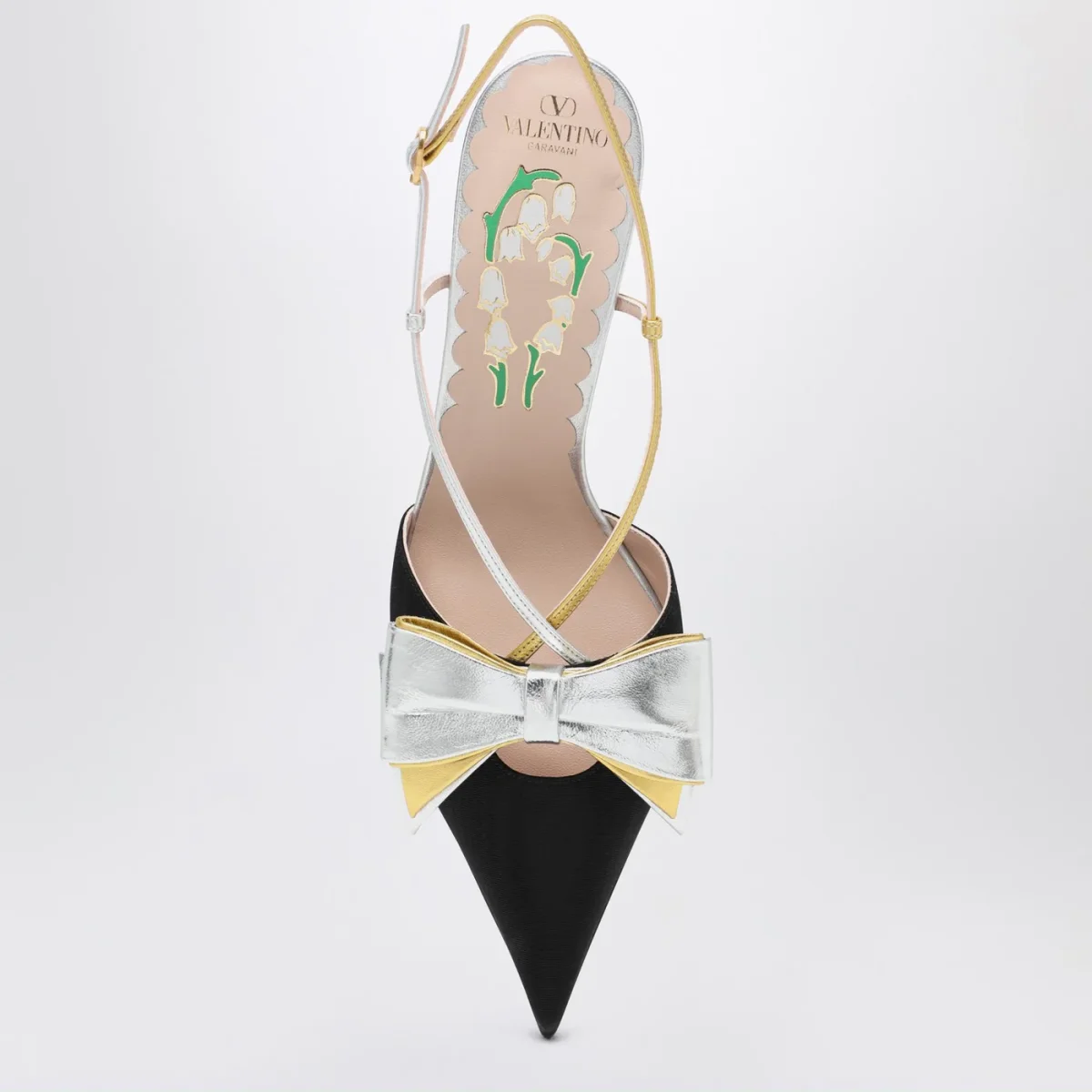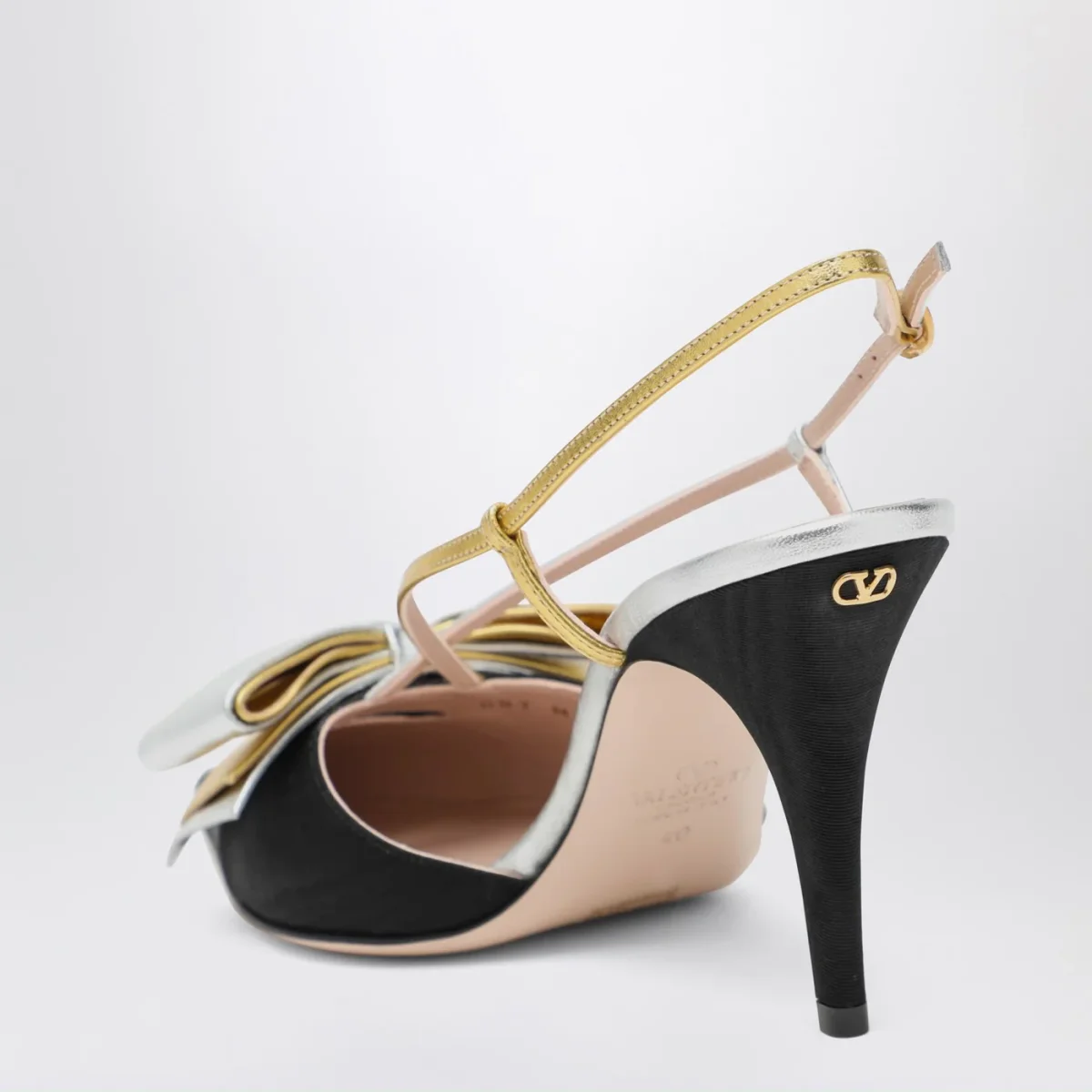 Décolleté Slingback di Valentino Garavani in tessuto moiré nera con dettaglio fiocco in nappa laminata oro e argento, caratterizzata da design a punta, chiusura con cinturino regolabile sul retro, dettaglio VLogo Signature sul tacco e suola in cuoio.