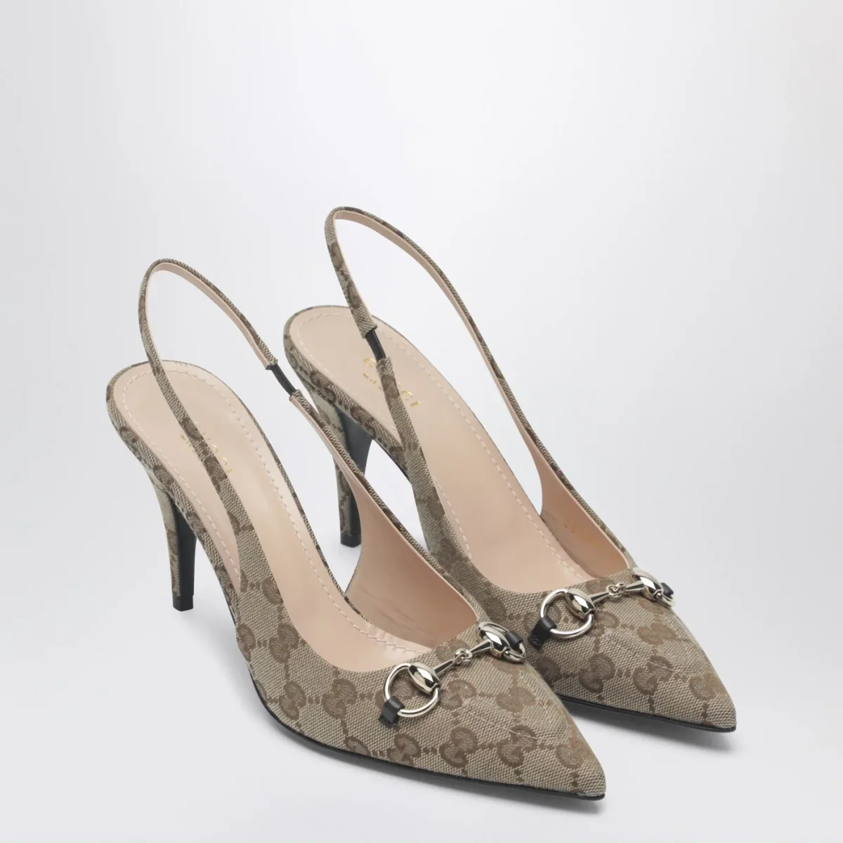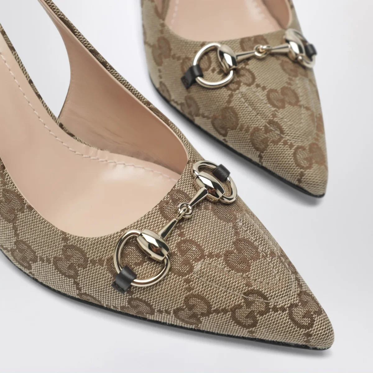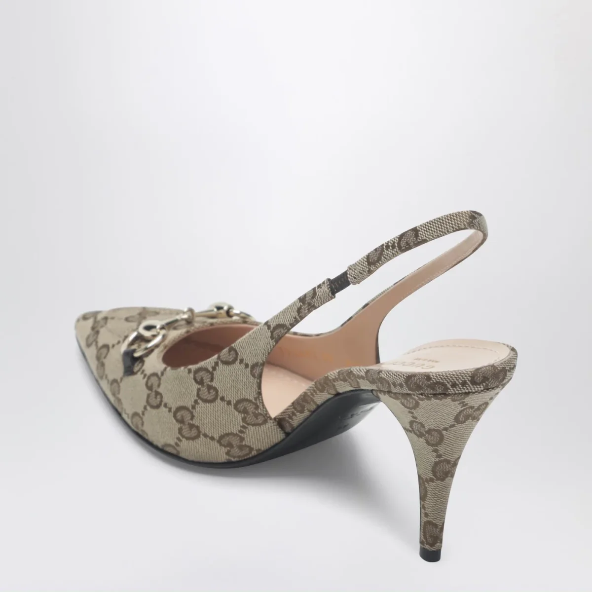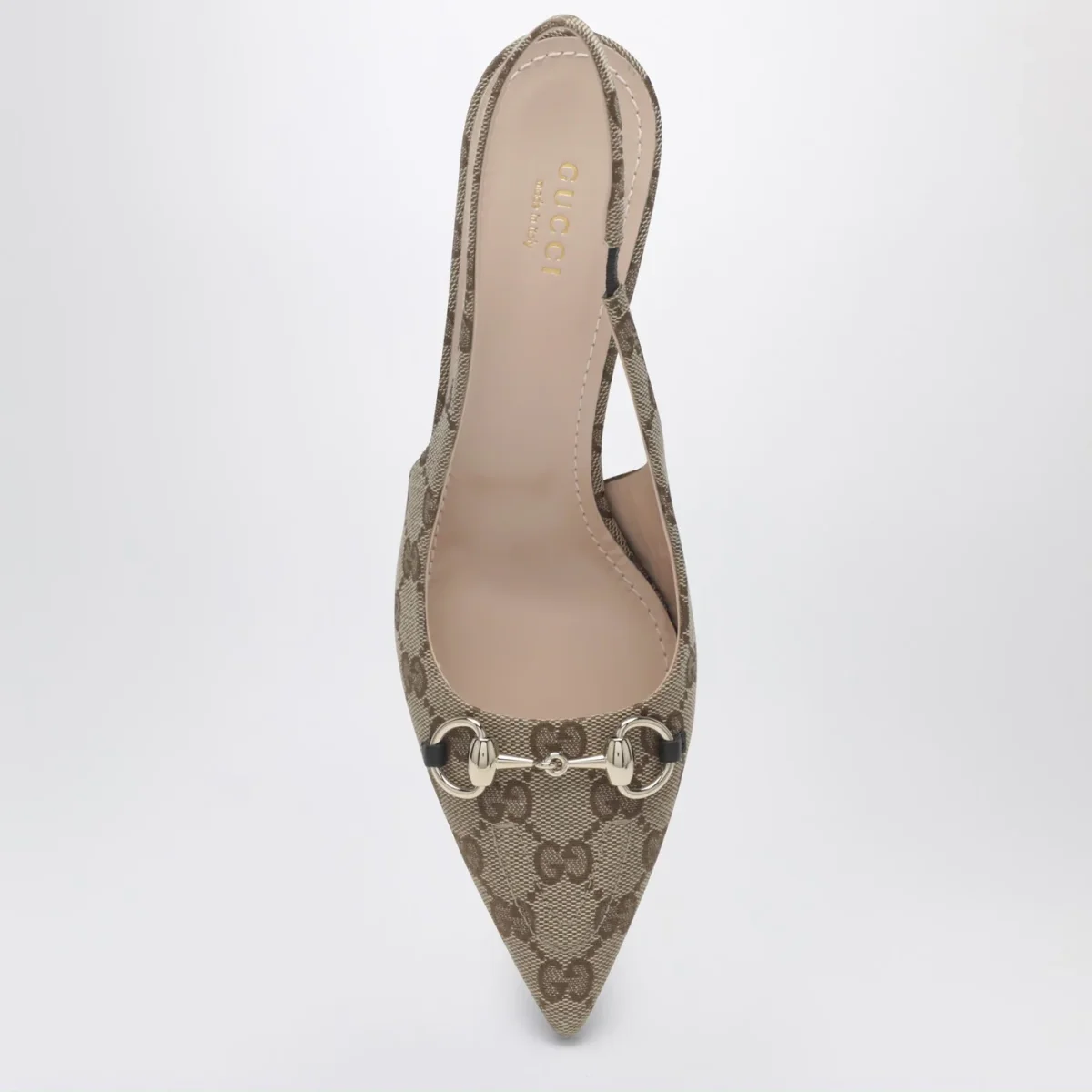 Décolleté di Gucci in tessuto Original GG beige/ebano• dettaglio Morsetto in metallo con finitura color oro chiaro• design a punta• cinturino elasticizzato• tacco medio• suola in cuoio