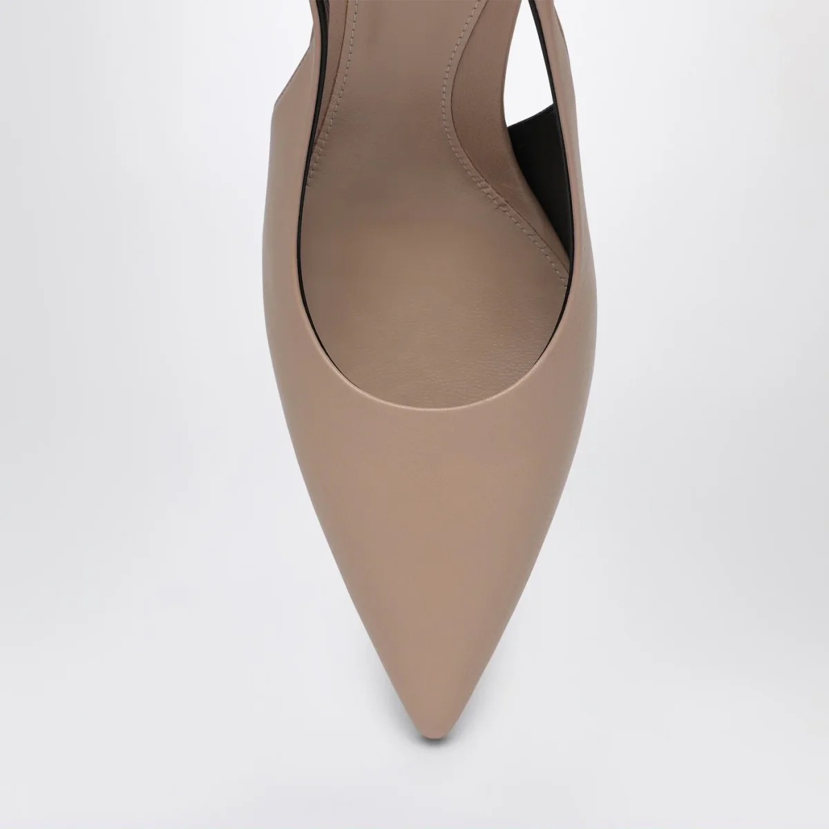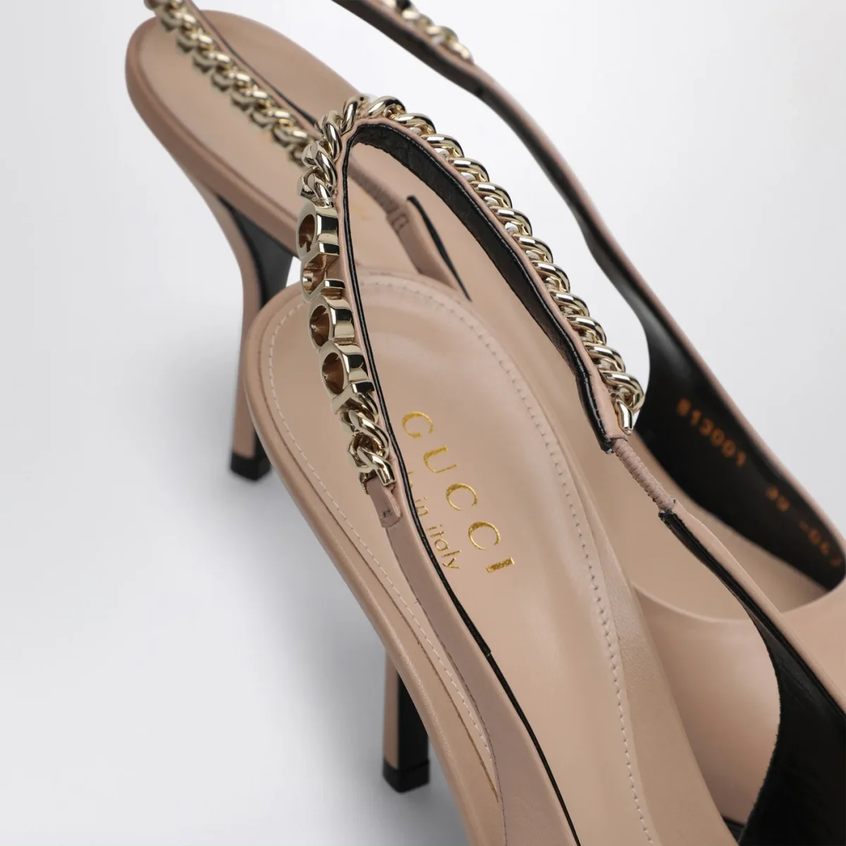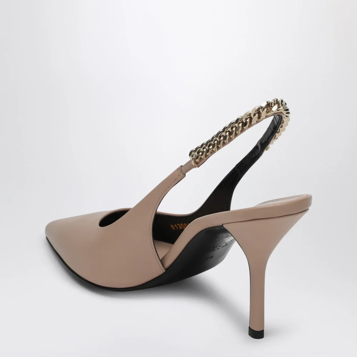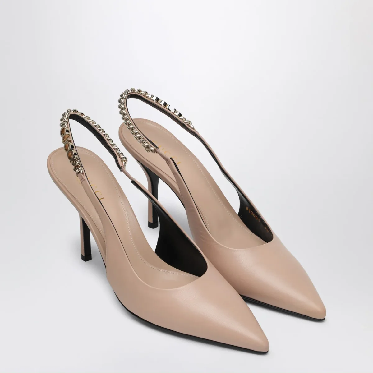 Décolleté slingback di Gucci in pelle liscia rosa chiaro, caratterizzato da design a punta, chiusura con cinturino posteriore elasticizzato con catena con logo, tacco alto e suola in cuoio.