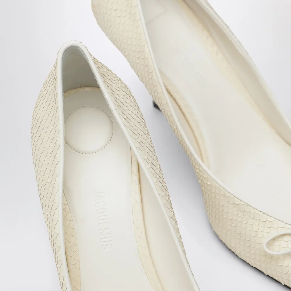 Décolleté di Jacquemus in pelle goffrata effetto pitone avorio, caratterizzate da design a punta, piccolo fiocco fisso sul davanti, soletta e fodera in pelle di agnello, tacco intrecciato asimmetrico con finitura laccata e suola in cuoio a contrasto.
