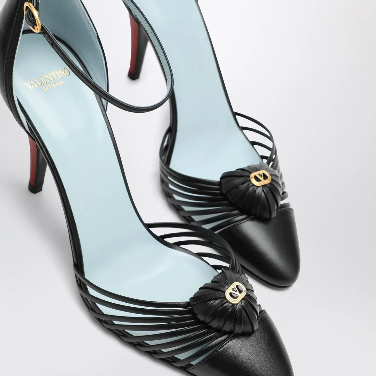 Décolleté di Valentino Garavani in pelle nero, caratterizzata da punta a gabbia con dettaglio cuore, cinturino con fibbia alla caviglia, tacco alto a stiletto e suola in cuoio.
