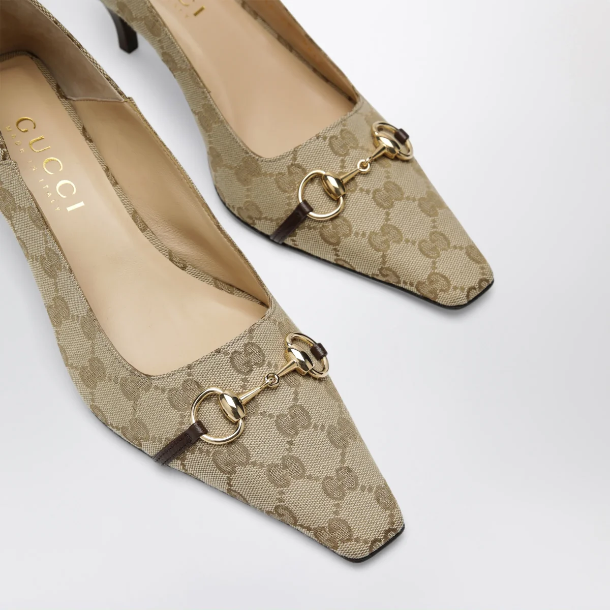 Décolleté in pelle e tessuto GG di Gucci• Colore: Vintage Sand/Dark Brown• Punta allungata leggermente squadrata con Morsetto• Modello flessibile indossabile con parte posteriore ripiegata• Finiture in pelle e hardware color oro• Fodera in pelle beige e suola in pelle• Tacco a cono ricoperto in pelle con targhetta in metallo