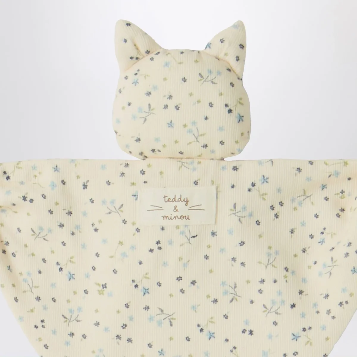 Doudou di Teddy & Minou in garza di cotone color avio con stampa a fiori azzurri all over, caratterizzato da design triangolare con bordi annodati, testa con gattino e patch logo.