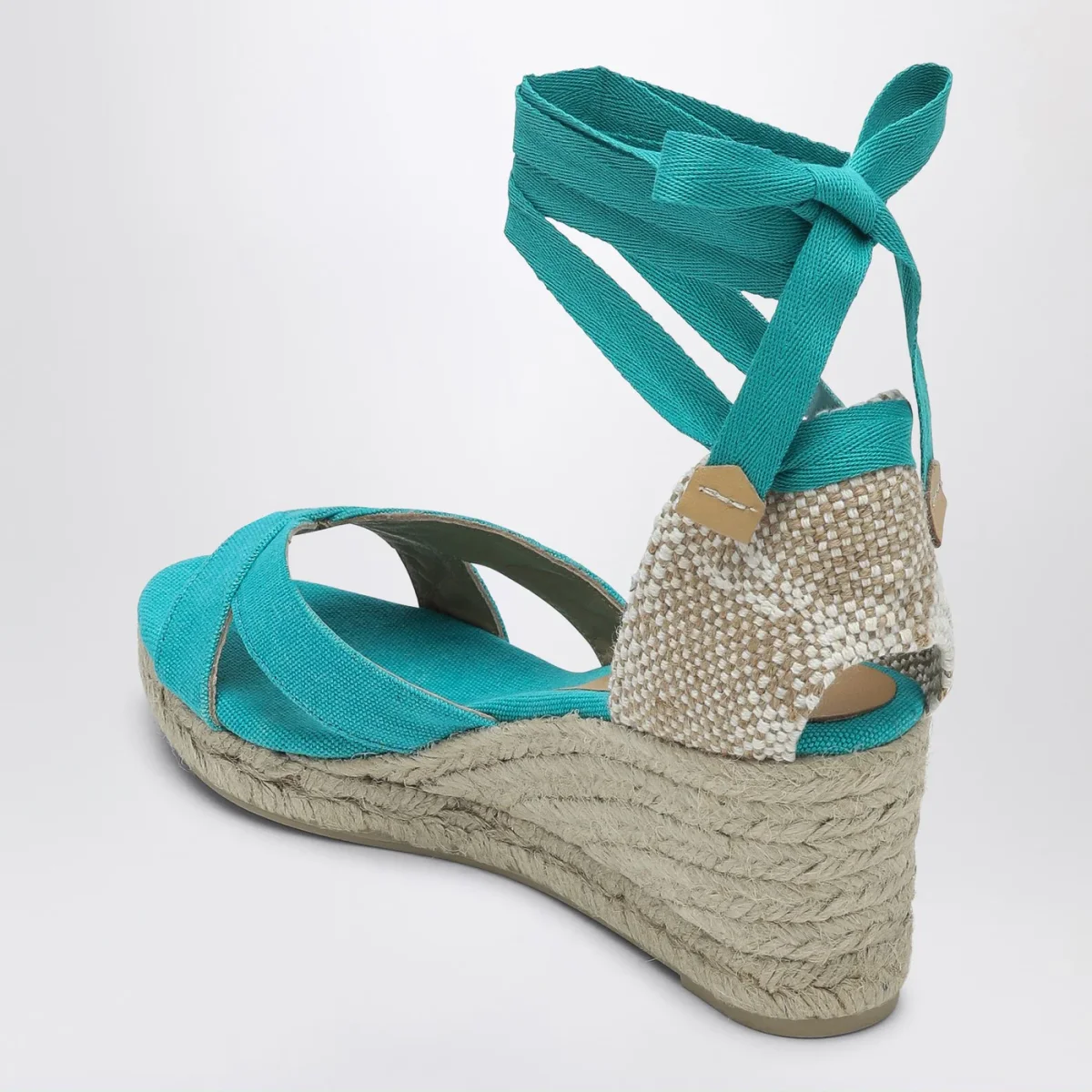 Zeppa di Castañer in tessuto color acquamarina caratterizzata da tomaia con fasce incrociate, punta aperta, soletta con stampa logo, chiusura alla caviglia con lacci, tacco a zeppa in raffia e suola juta e gomma.
