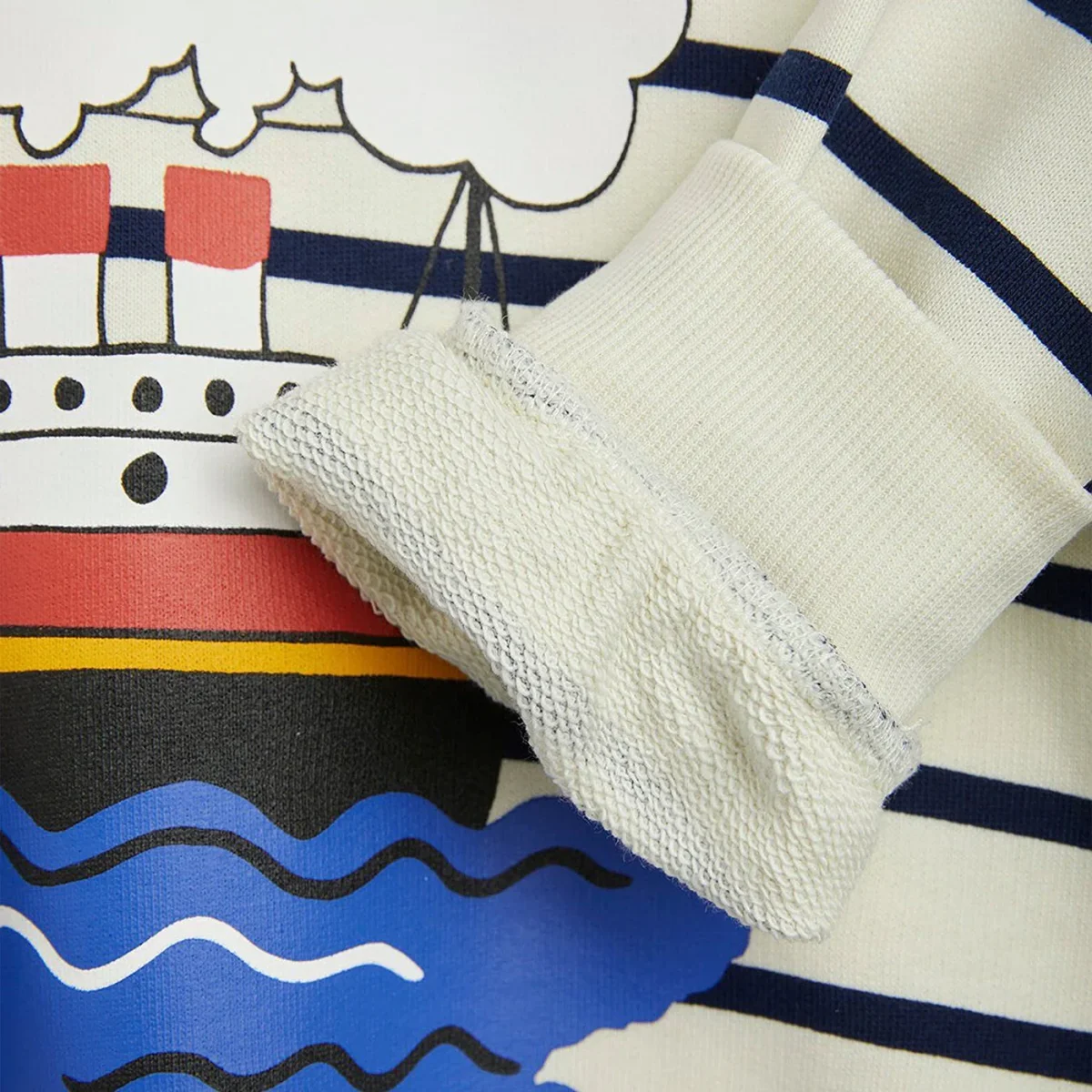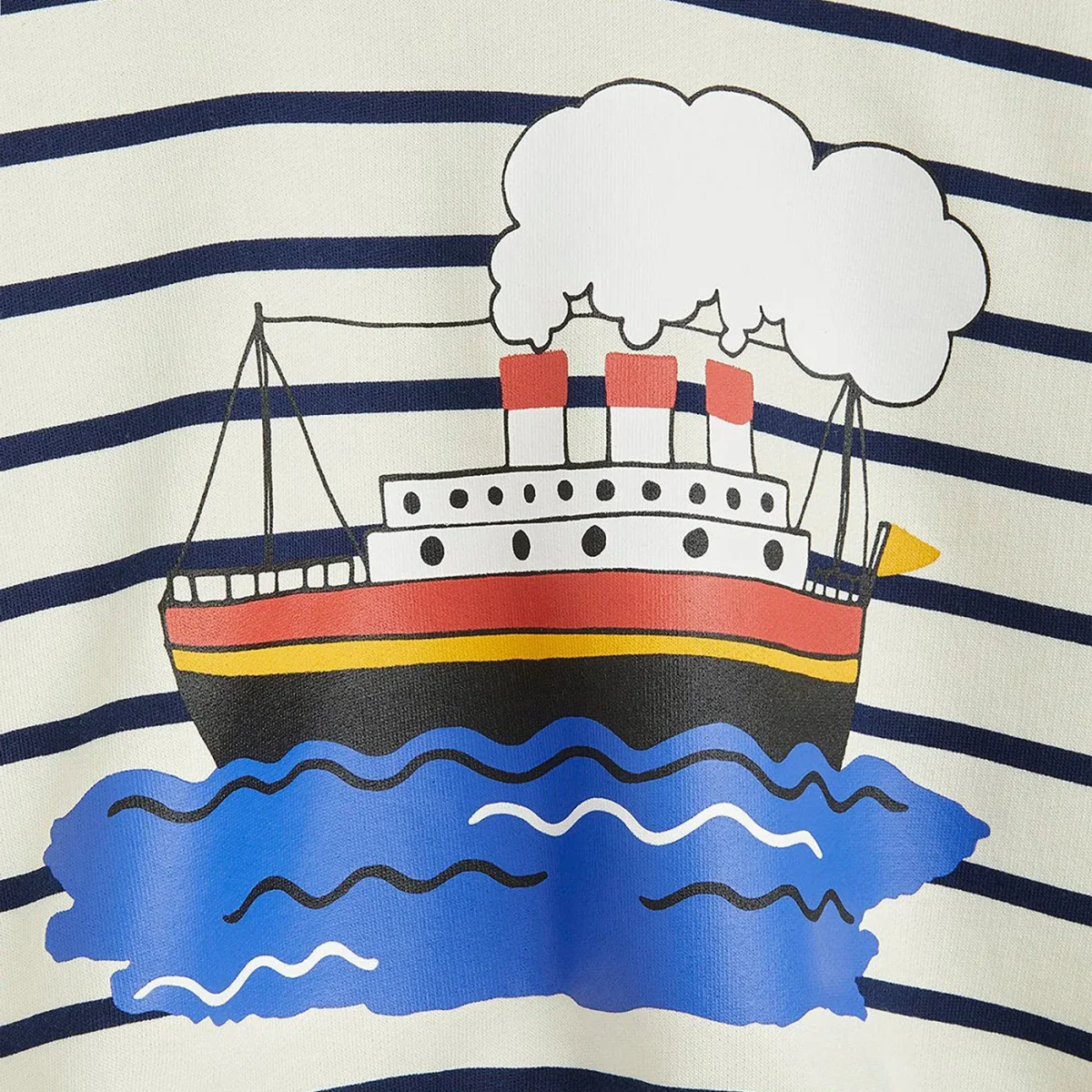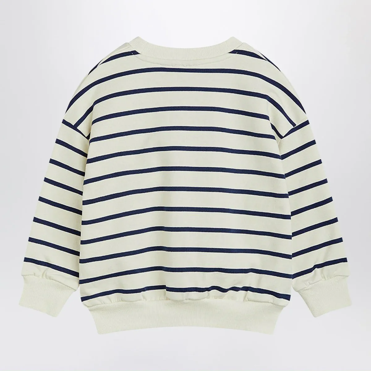 Felpa girocollo di Mini Rodini in cotone organico bianca a righe blu, caratterizzata da manica lunga, stampa sul davanti e bordi a costine.