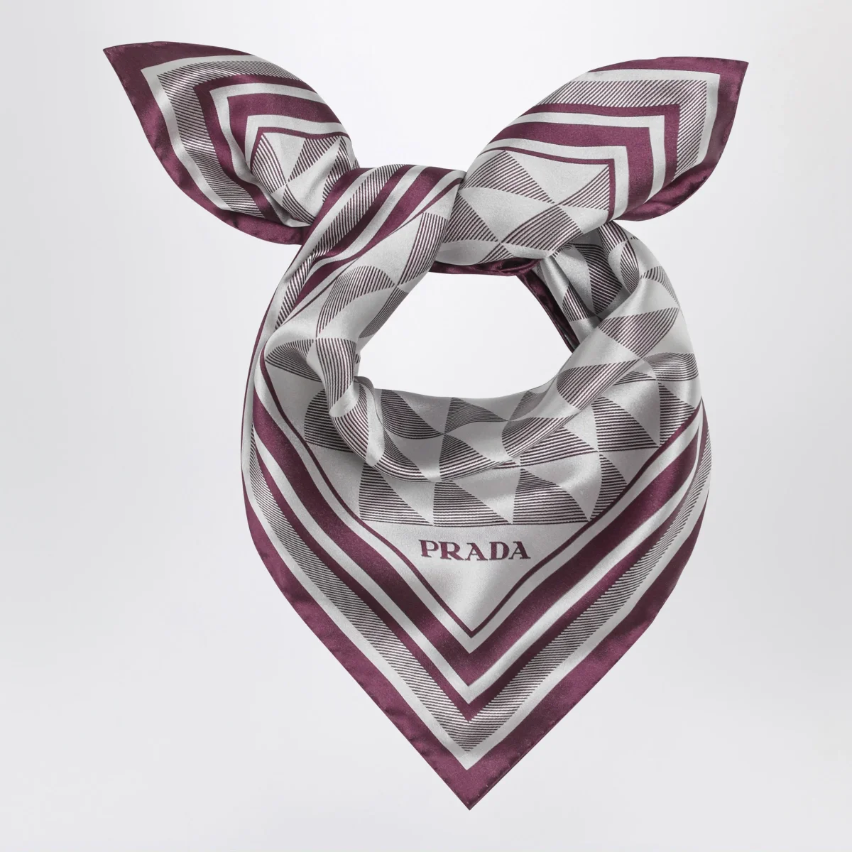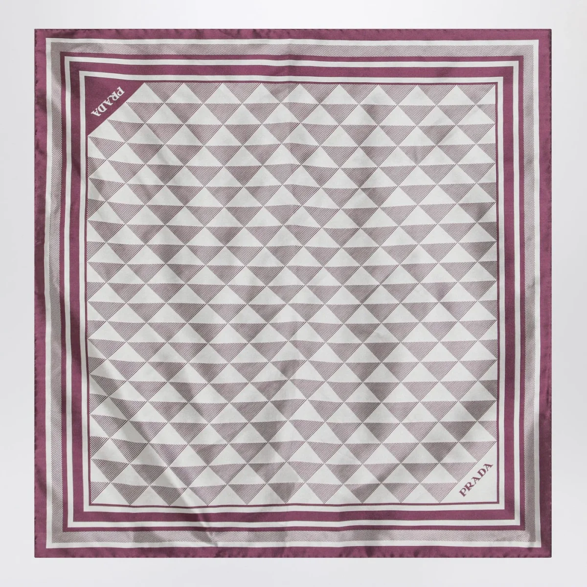 Foulard di Prada in twill di seta con motivo geometrico color malva e bianco con logo lettering sull’angolo.