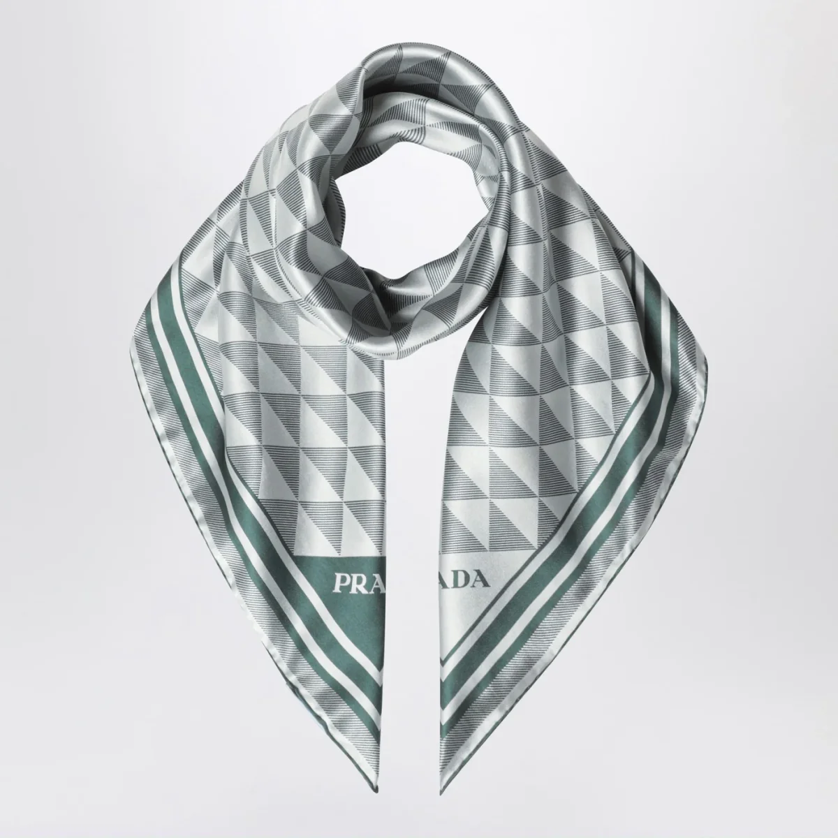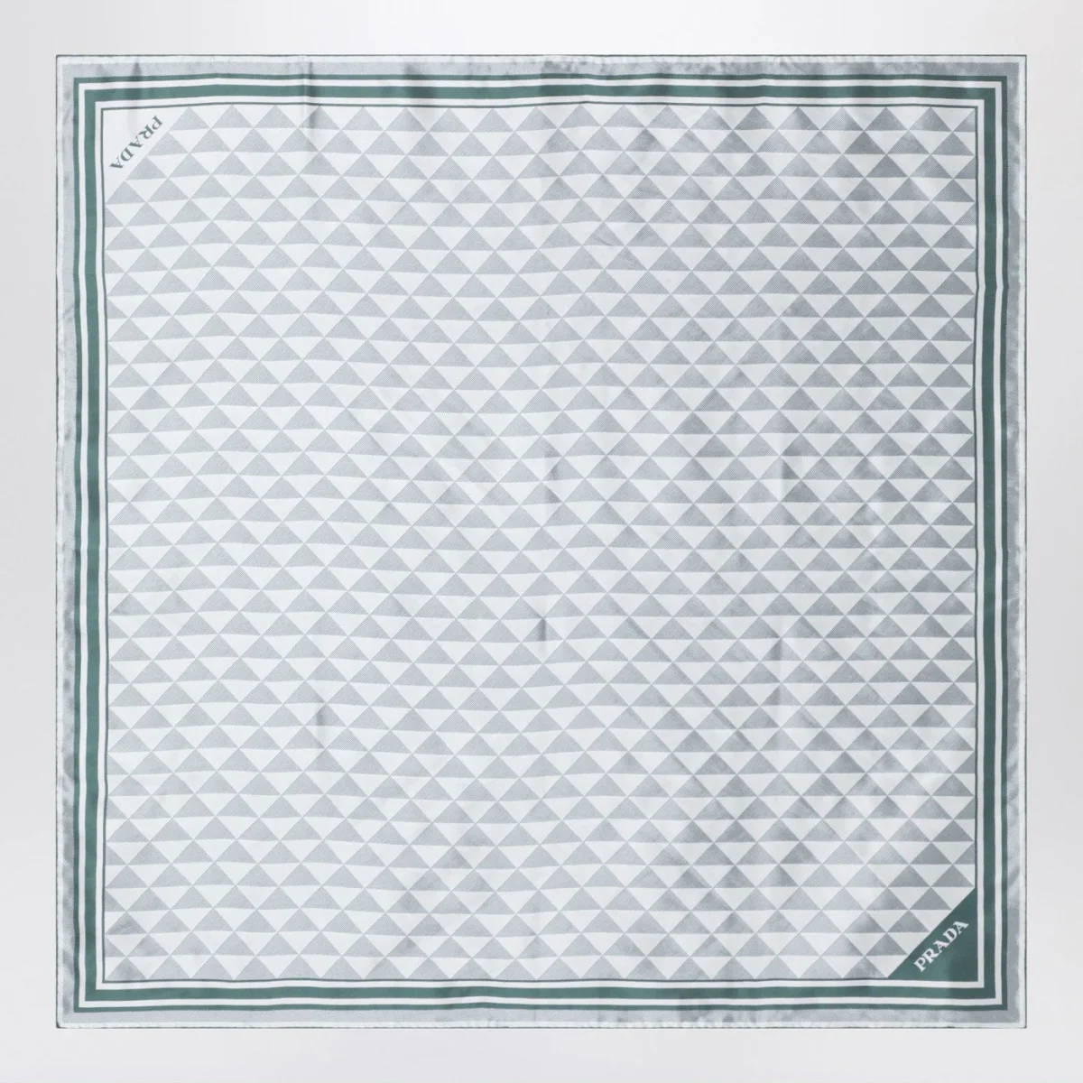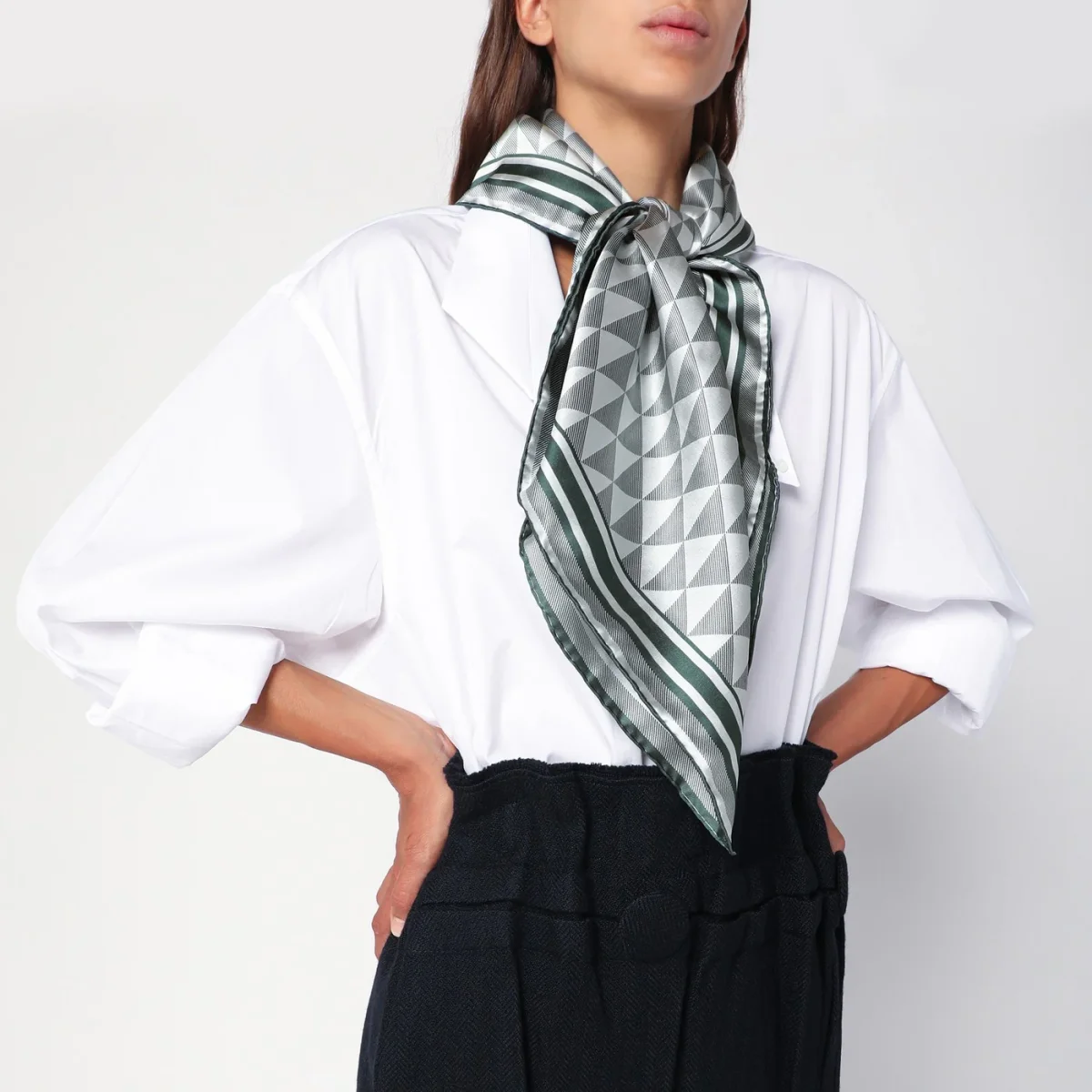 Foulard di Prada in twill di seta con motivo geometrico color smeraldo e bianco con logo lettering sull’angolo.