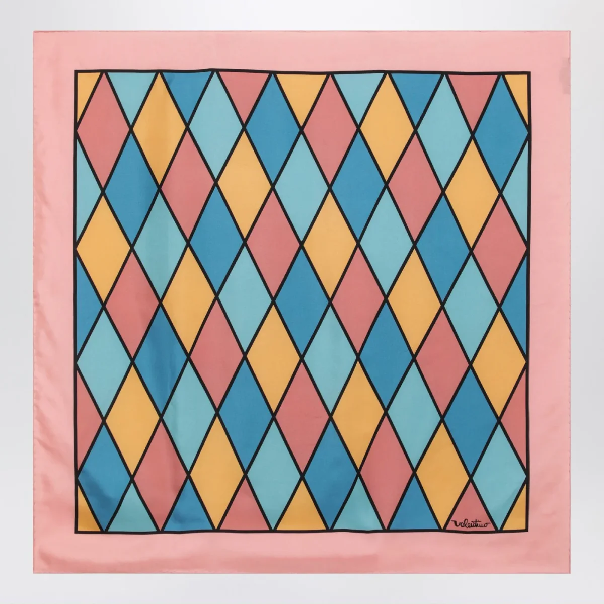 Foulard di Valentino Garavani in seta con rombi colorati, caratterizzato da bordo rosa e logo lettering a contrasto.