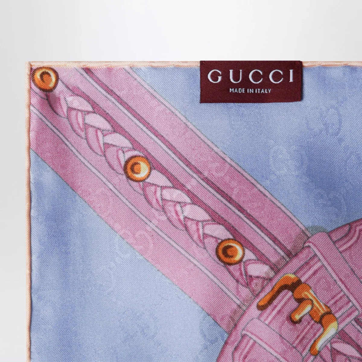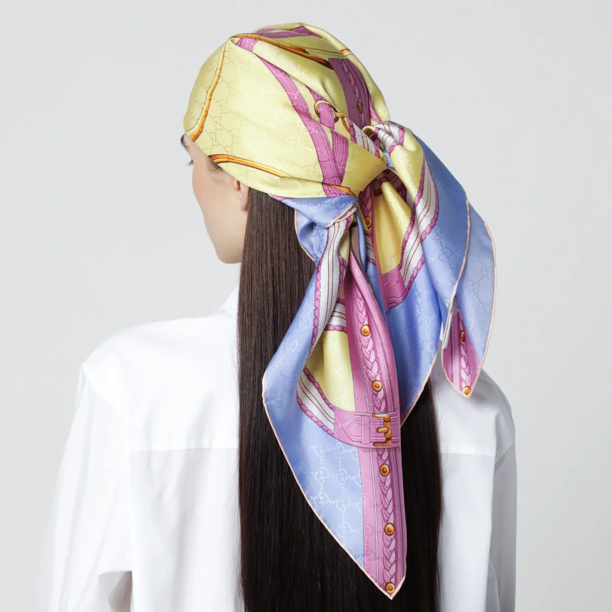 Foulard quadrato di Gucci in seta jacquard GG sui toni del lilla, del giallo chiaro e del rosa