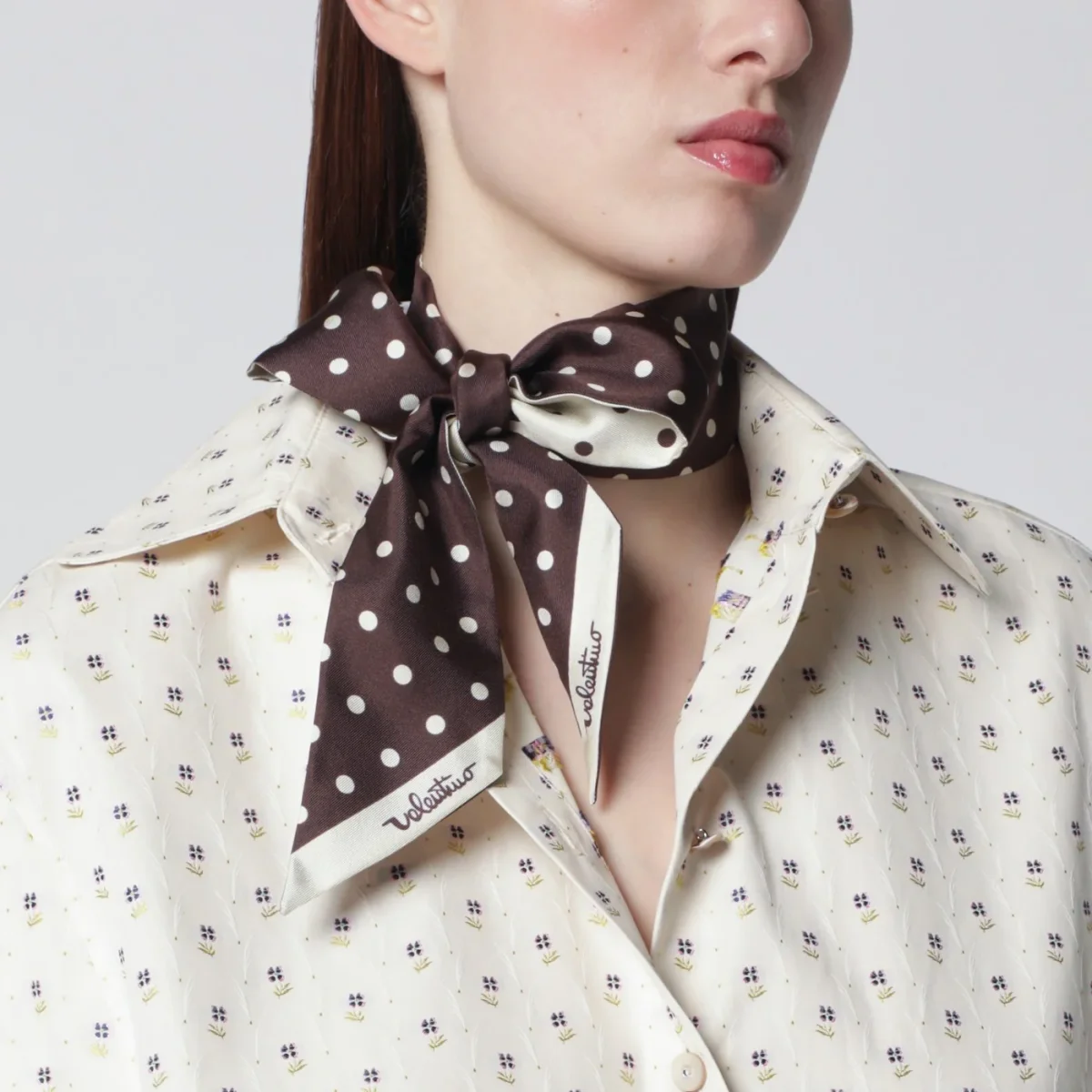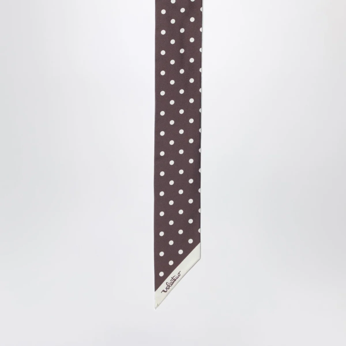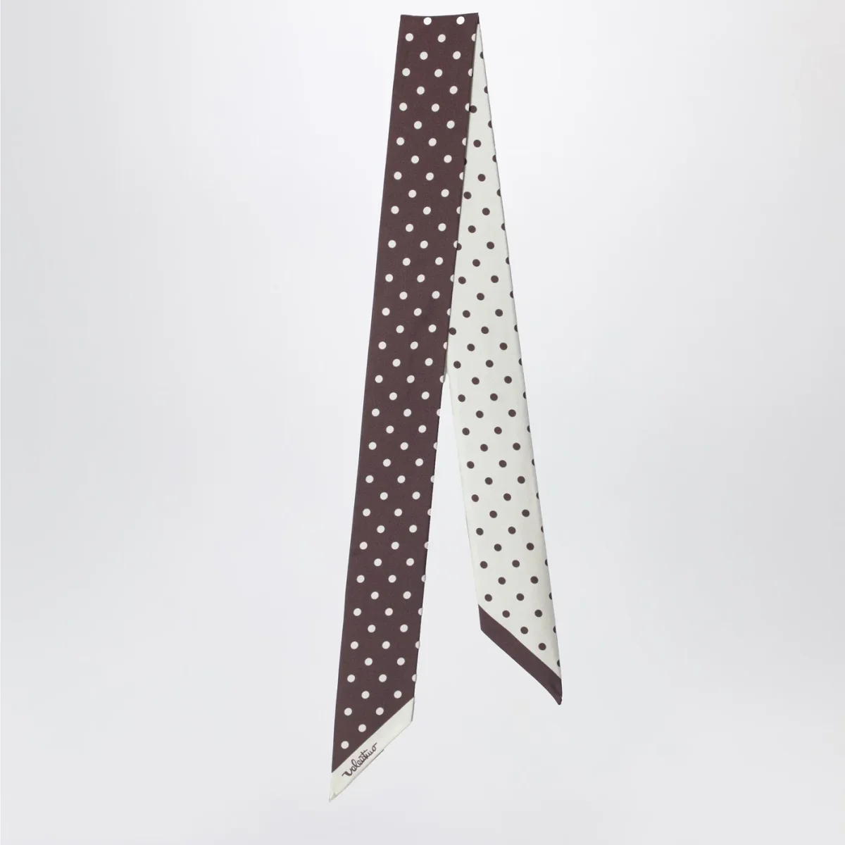 Foulard di Valentino Garavani in seta marrone a pois color burro da un lato