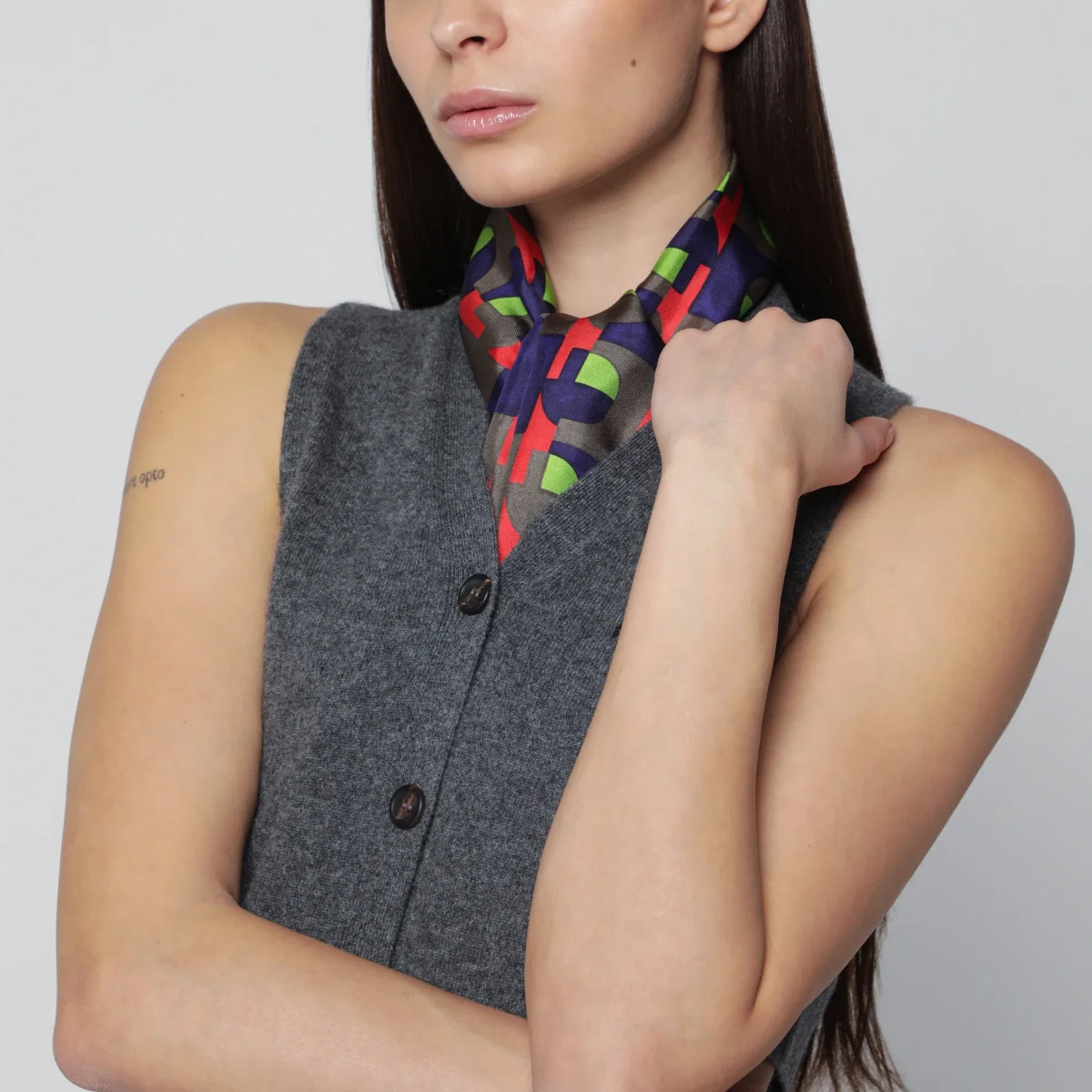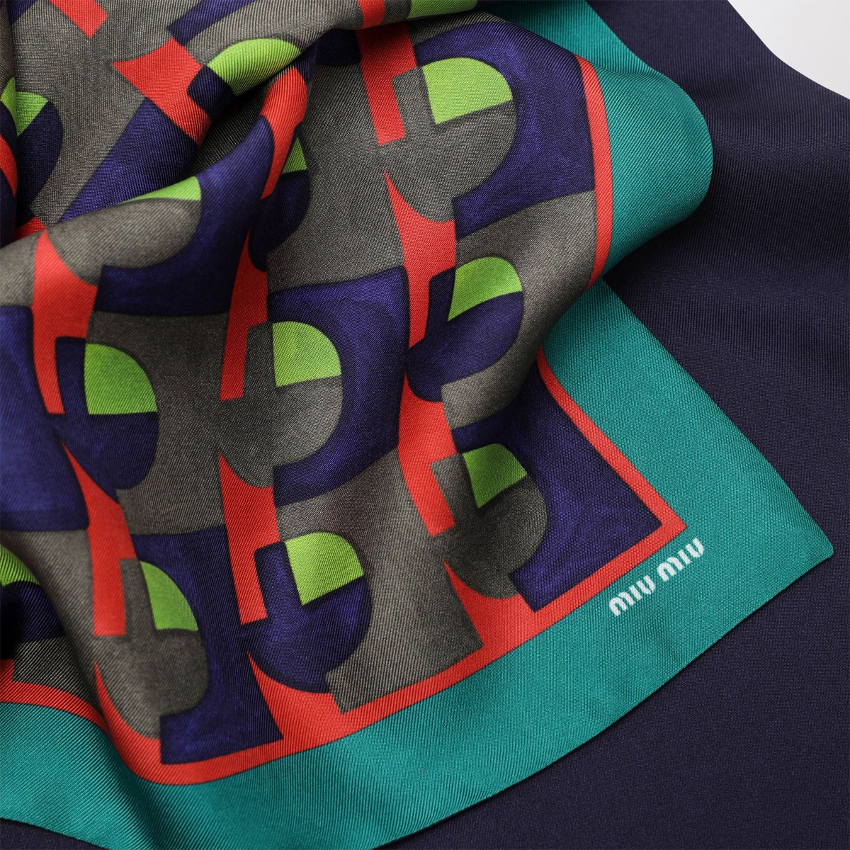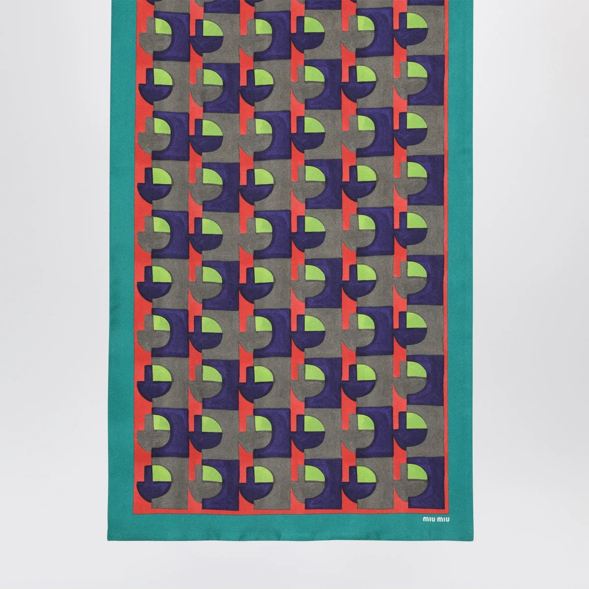 Foulard in twill di seta di Miu Miu• Colore: Assenzio/Begonia• Colorati motivi geometrici dal gusto vintage