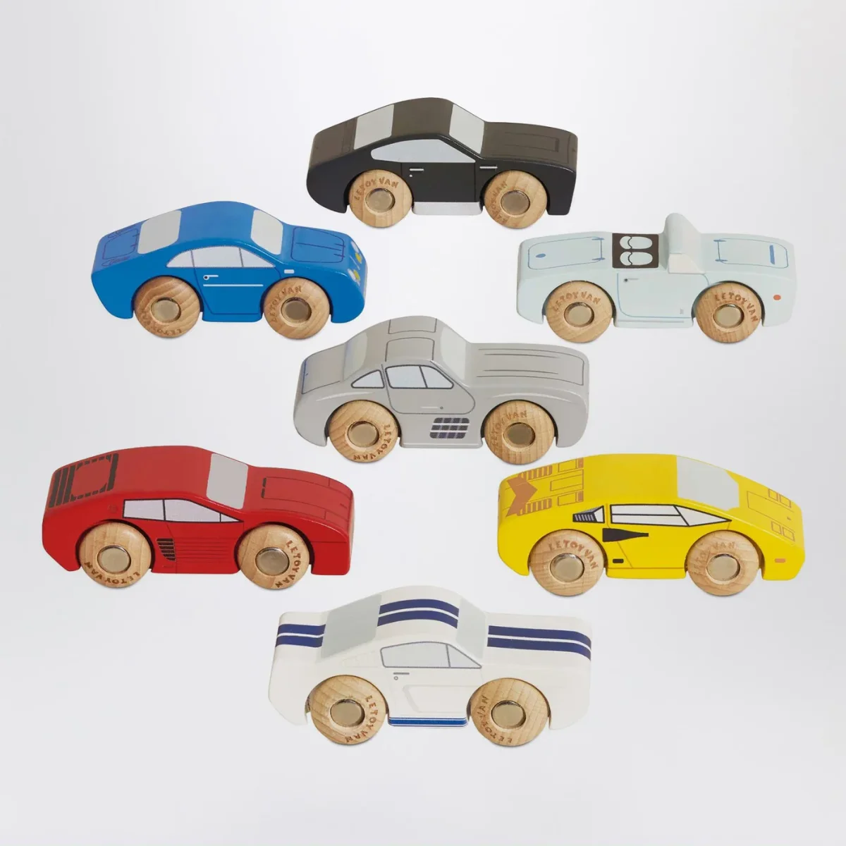 Gioco educativo di Le Toy Van in legno certificato dipinto con colori a base d’acqua sicuri per il bambino, composto da una cassa di legno con frutta tra cui banane, fragole, una pesca e una fetta di anguria.