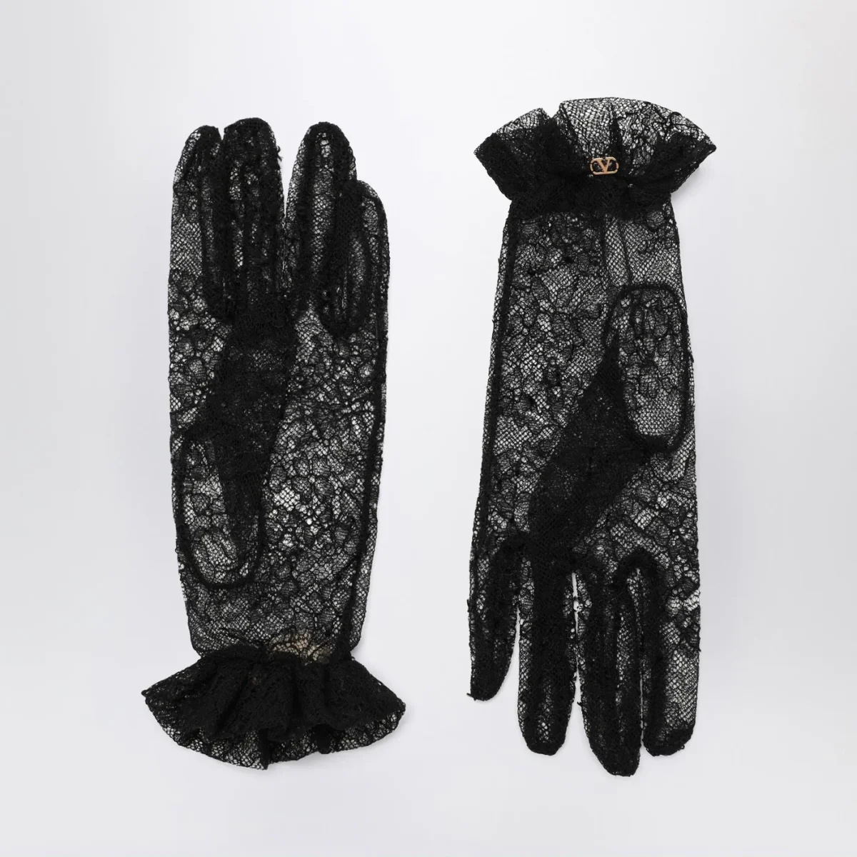 Guanti di Valentino Gravani neri in pizzo, caratterizzati da profilo con rouches e dettaglio Vlogo Signature in metallo con finitura in colore oro.