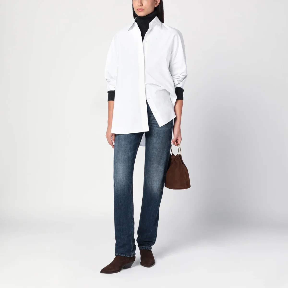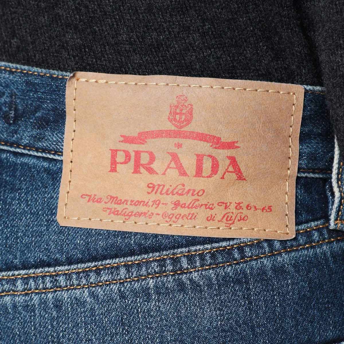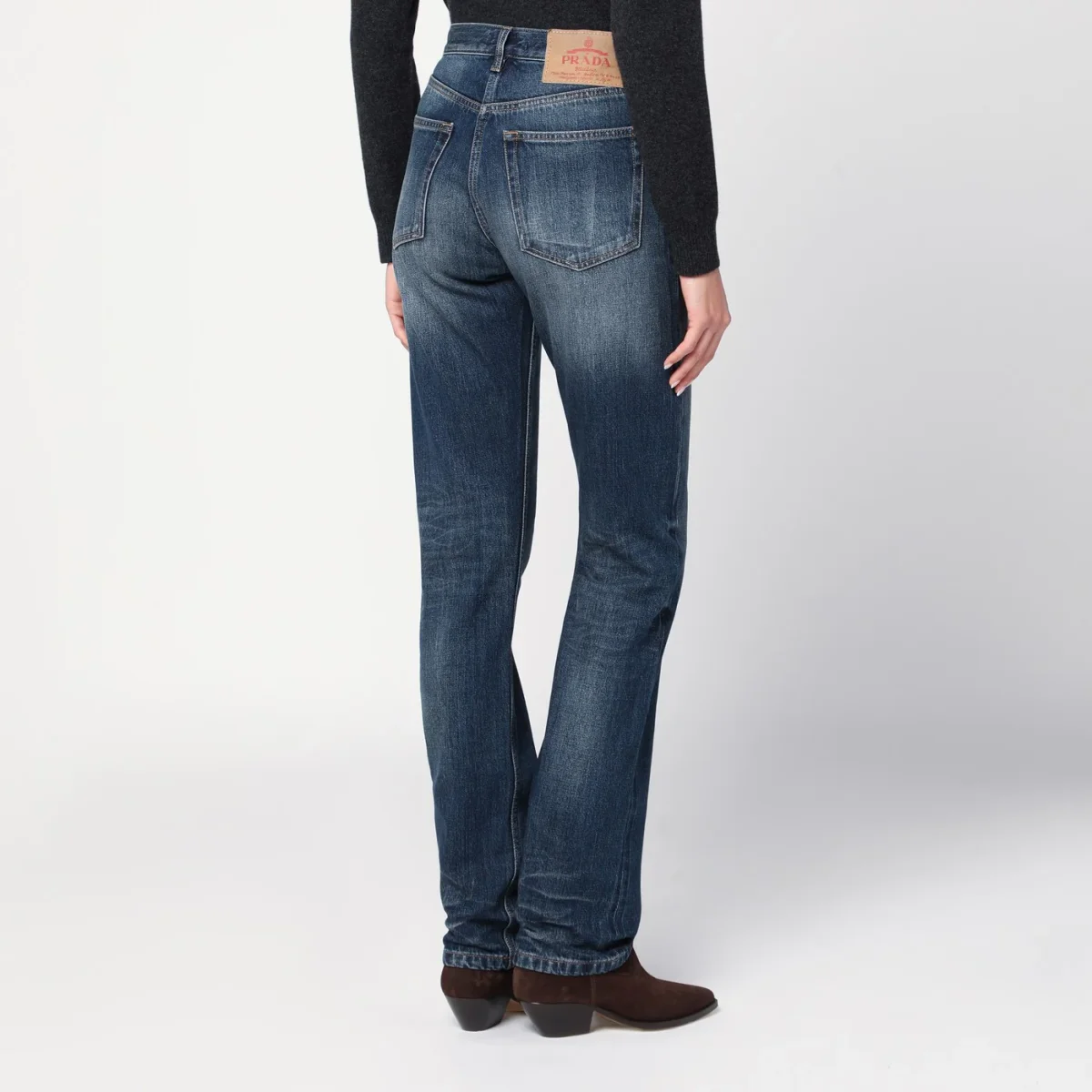Jeans di Prada in denim di cotone blu effetto slavato, caratterizzato da chiusura frontale con zip e bottone, passanti in vita, patch logo sul retro e cinque tasche classiche.