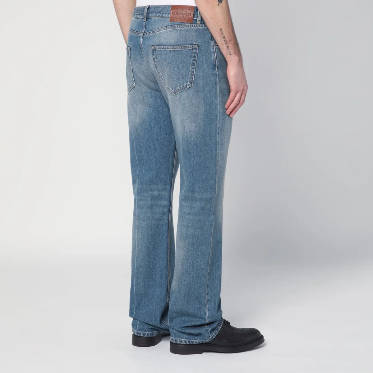 Jeans di Alexander McQueen in denim di cotone blu effetto slavato, caratterizzato da chiusura frontale con zip e bottone, passanti in vita con dettaglio logo metallico, cinque tacche classiche e patch logo posteriore.