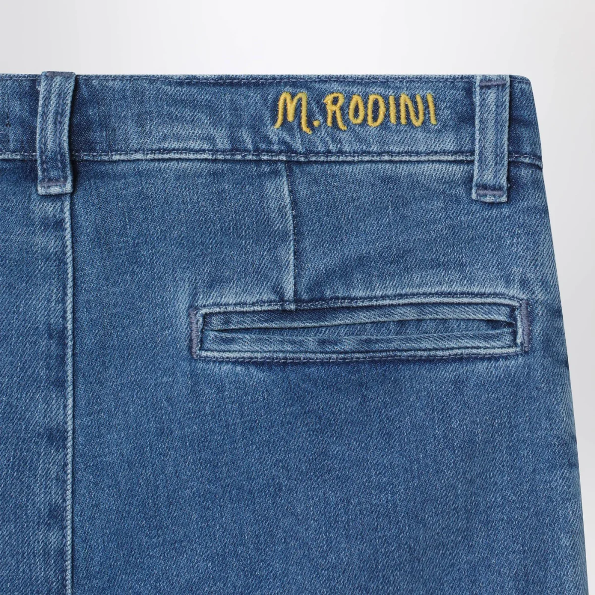 Jeans di Mini Rodini in denim di cotone organico blu, caratterizzato da chiusura frontale con zip e bottone, due tasche a filetto laterali, una tasca a filetto posteriore, risvolto a fondo gamba e ricamo logo lettering sul retro in vita.