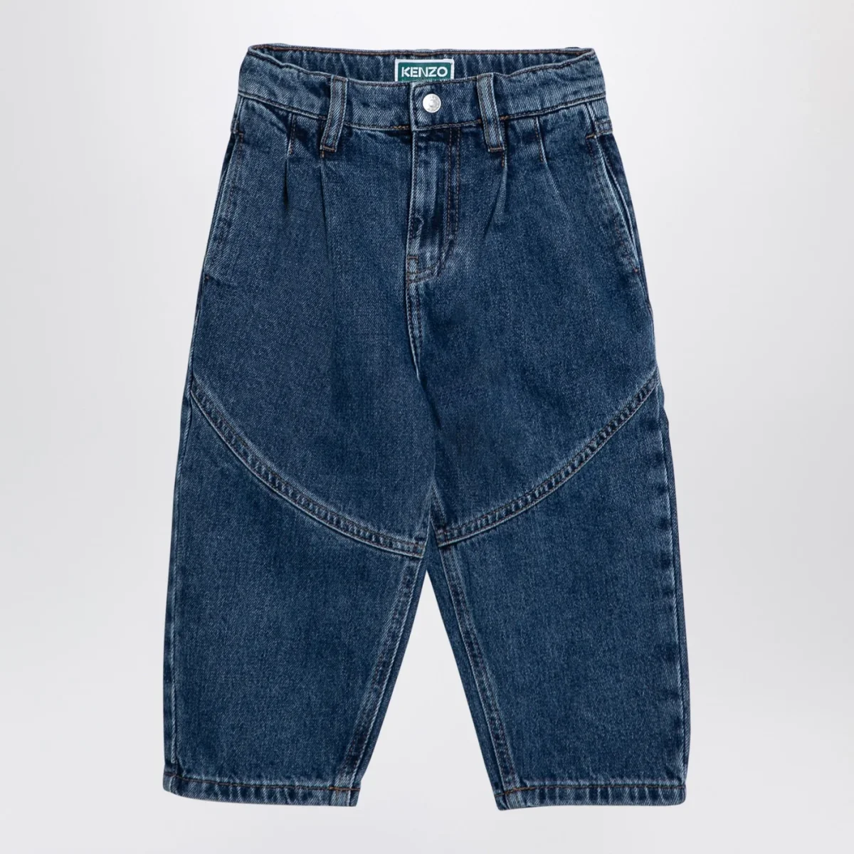 Jeans di Kenzo in denim di cotone blu, caratterizzato da chiusura frontale con zip e bottone, passanti in vita, due tasche a filetto laterali, due tasche applicate sul retro e patch logo posteriore.
