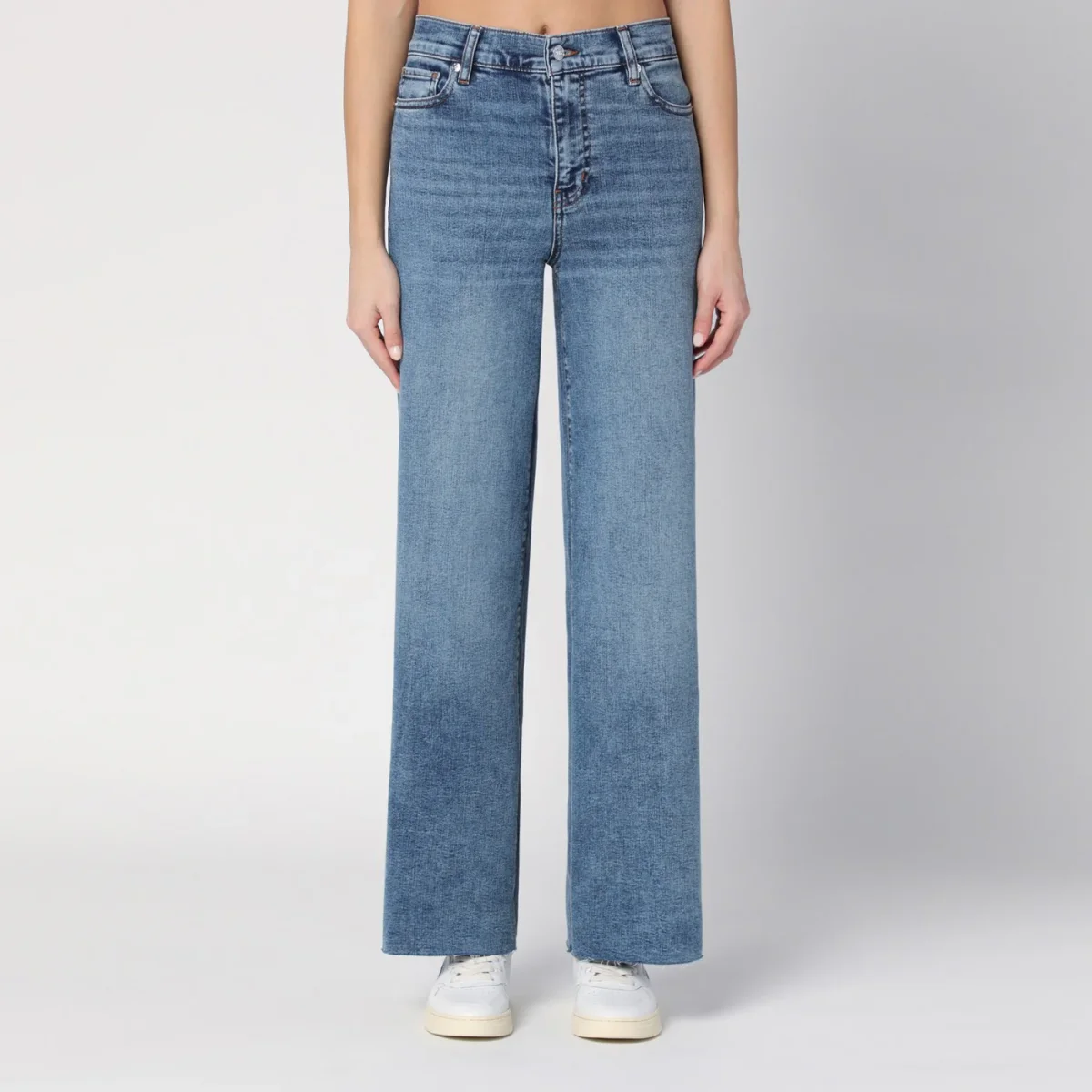 Jeans di Frame in denim super stretch blu, caratterizzato da chiusura frontale con zip e bottone, passanti per cintura, cinque tasche classiche, orlo a taglio vivo e vita alta.