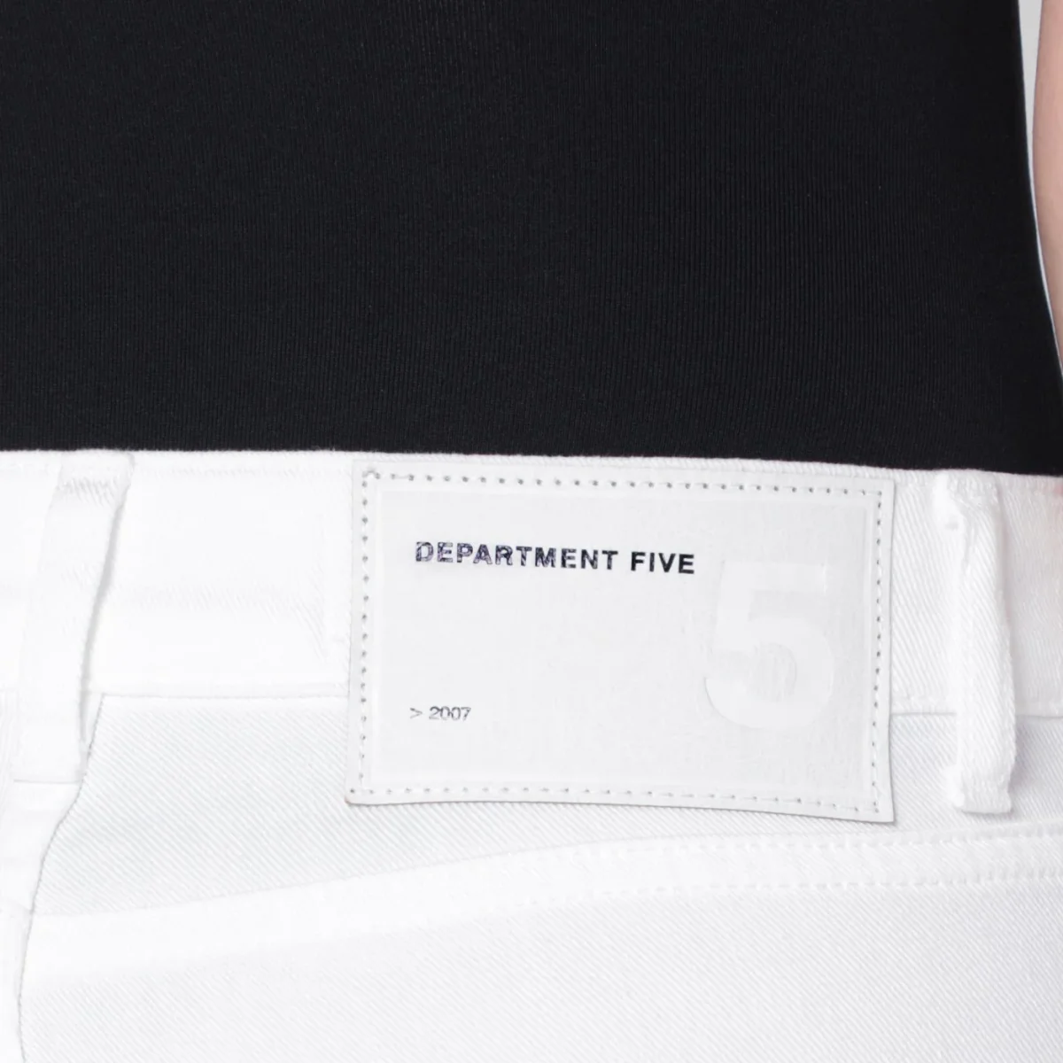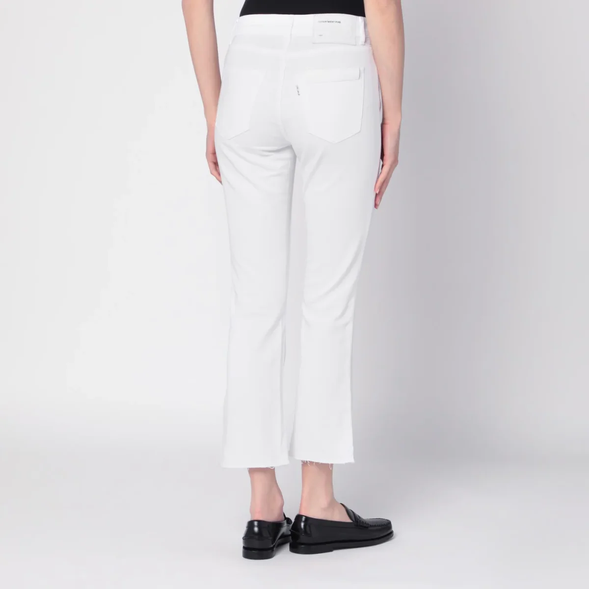 Jeans a trombetta di Department 5 in denim di cotone elasticizzato bianco, caratterizzato da chiusura con zip e bottone, passanti in vita, cinque tasche classiche, patch logo posteriore e orlo a taglio vivo.
