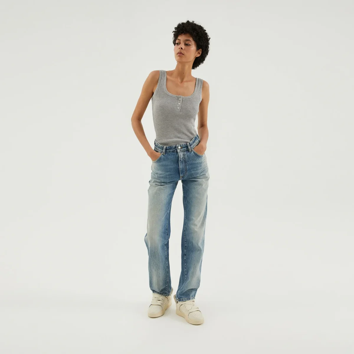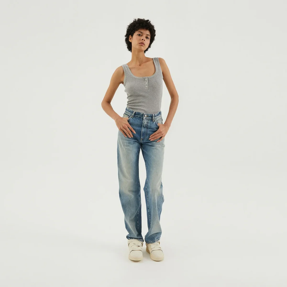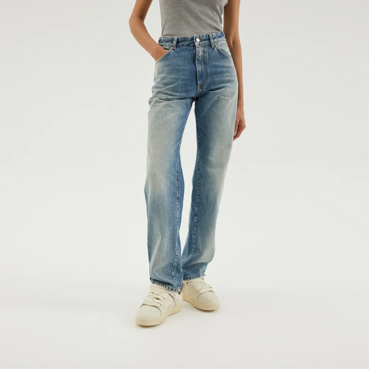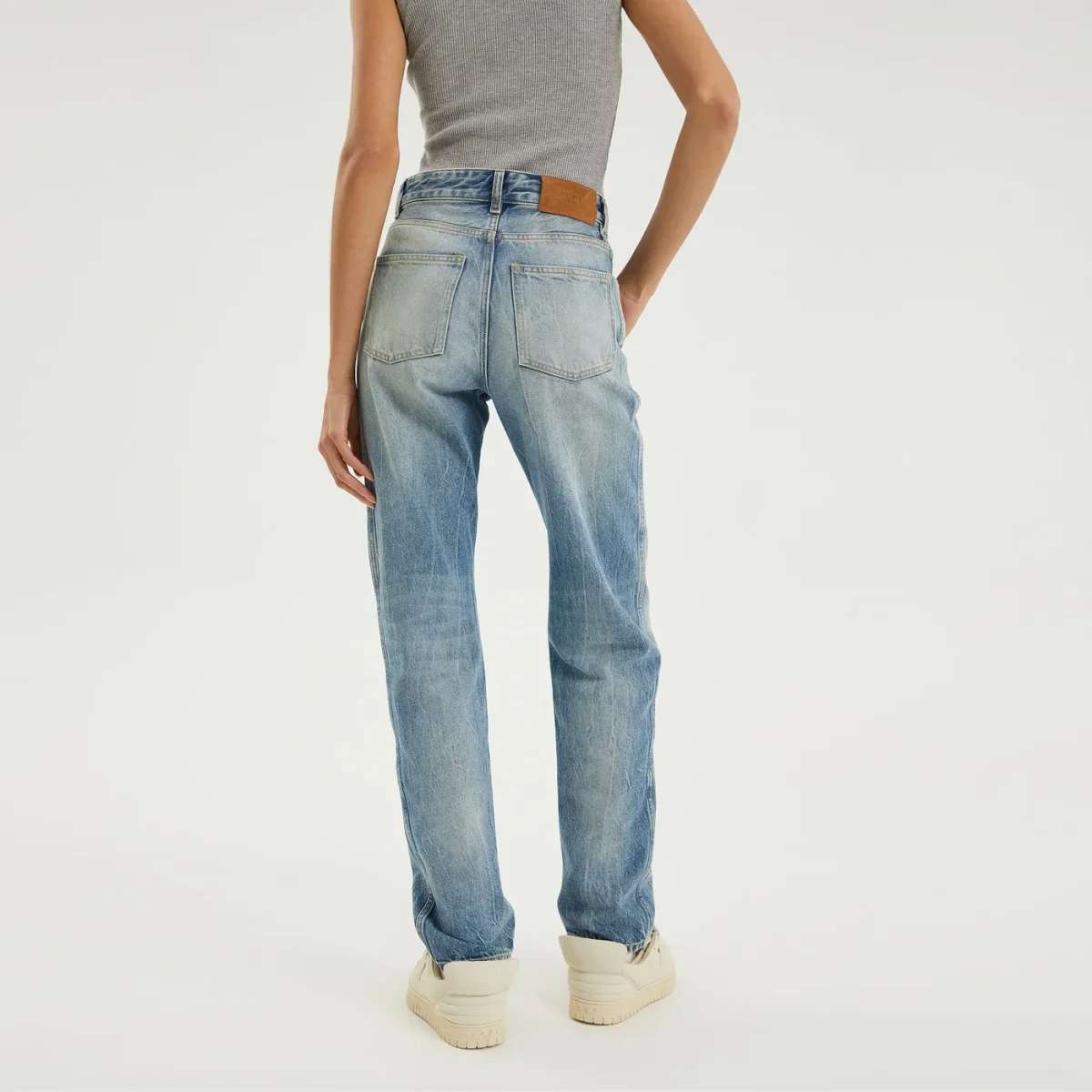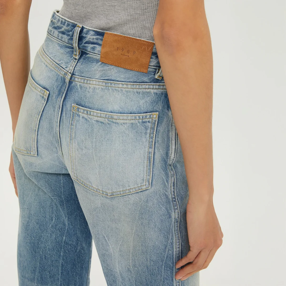 Jeans regular di 1989 Studio con effetto lavato, vita alta, passanti per cintura, chiusura con zip e bottone, design a cinque tasche, pieghe al ginocchio e etichetta con logo sul retro.