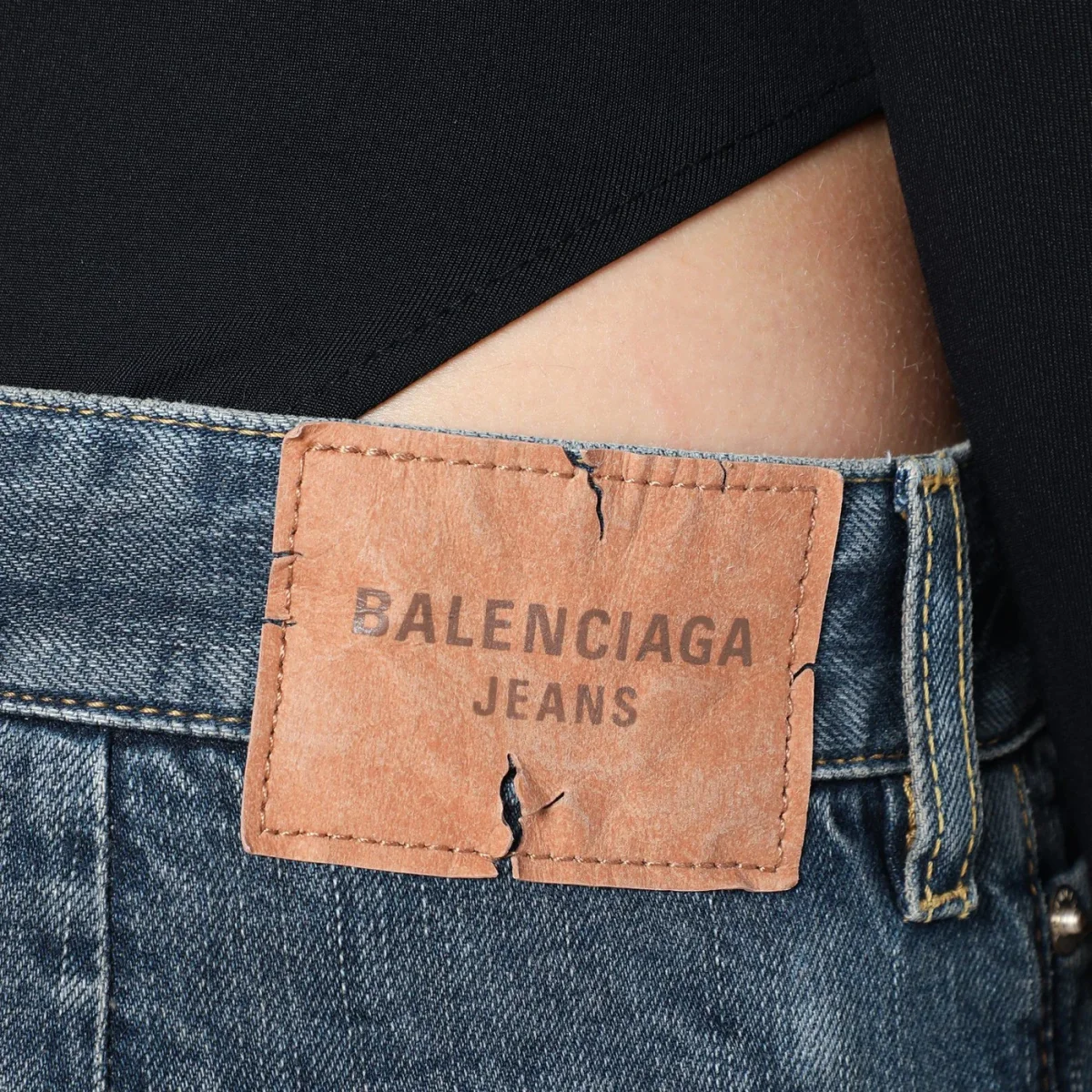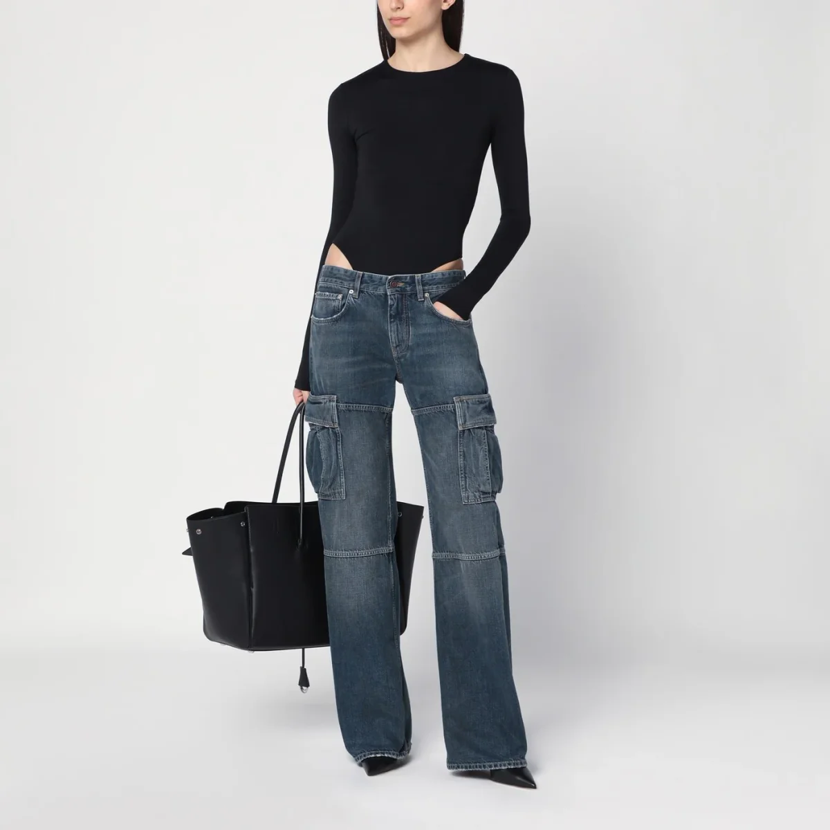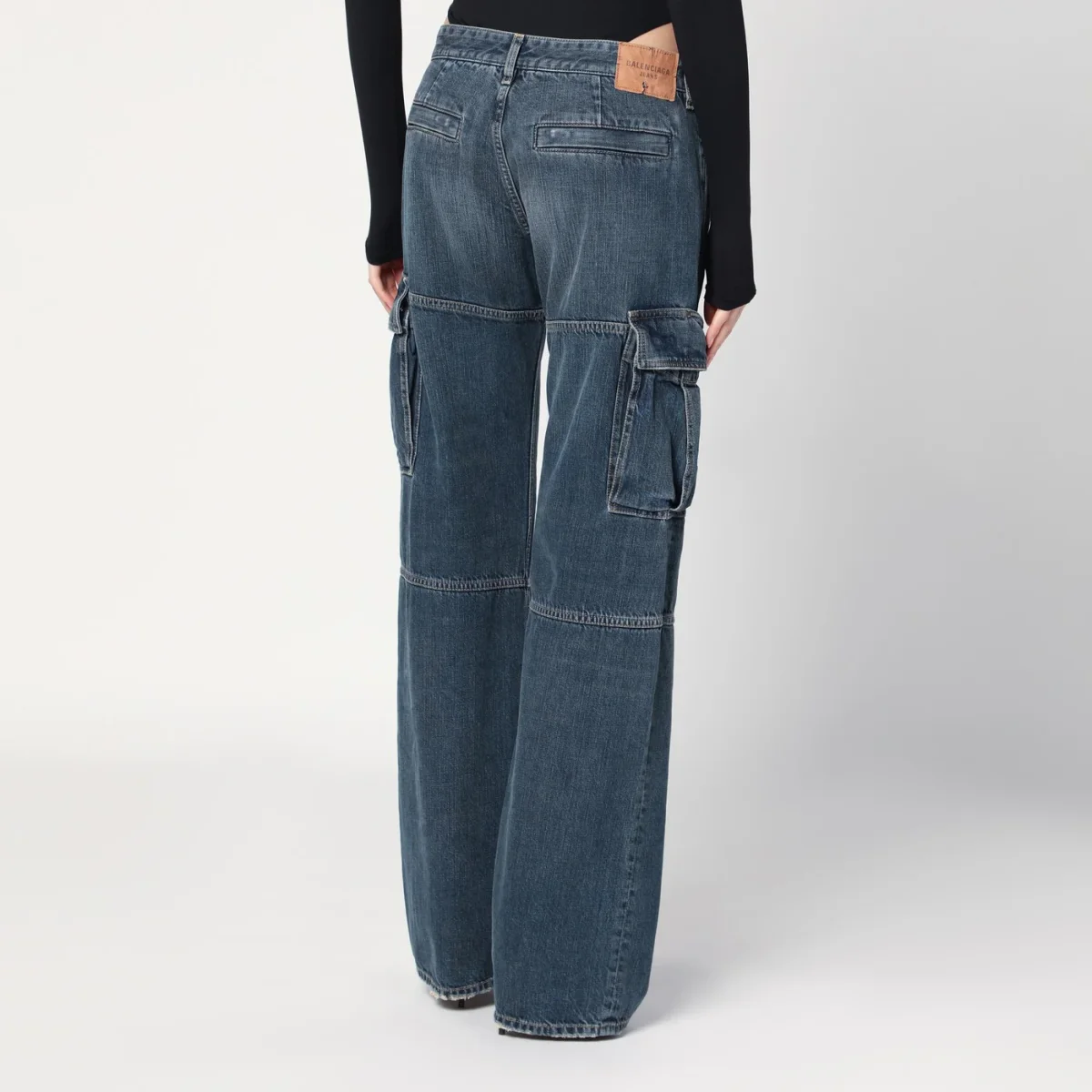 Jeans ampio di Balenciaga in denim di cotone blu effetto slavato, caratterizzato da chiusura frontale con zip e bottone, passanti in vita, tra tasche sul davanti, due tasche a filetto posteriori, patch logo sul retro, due tasche cargo laterali e orlo con dettagli strappati.