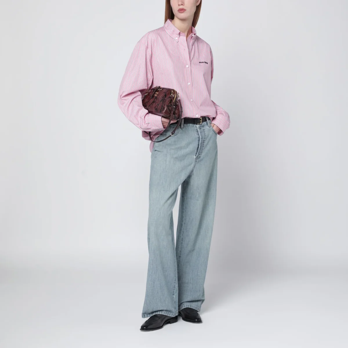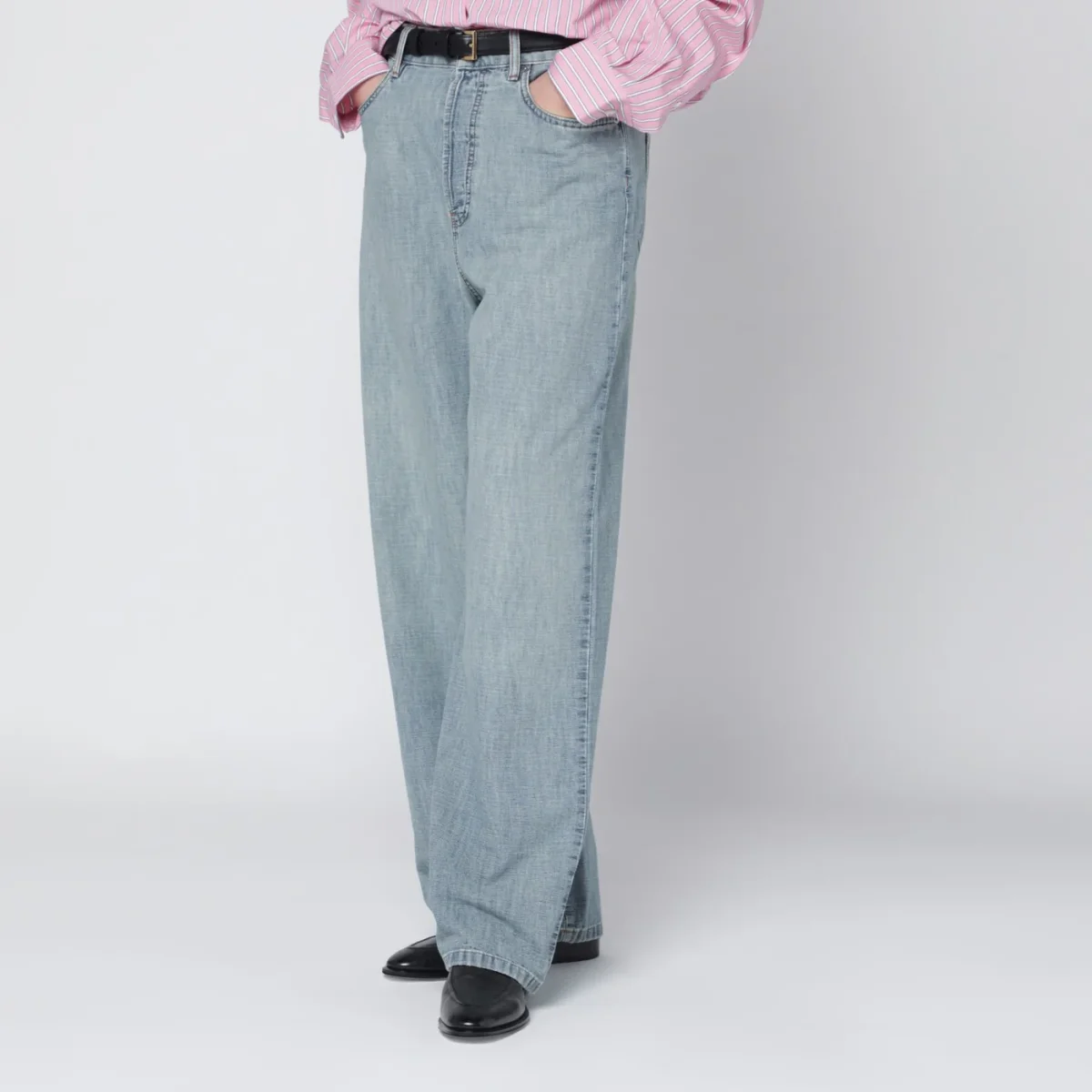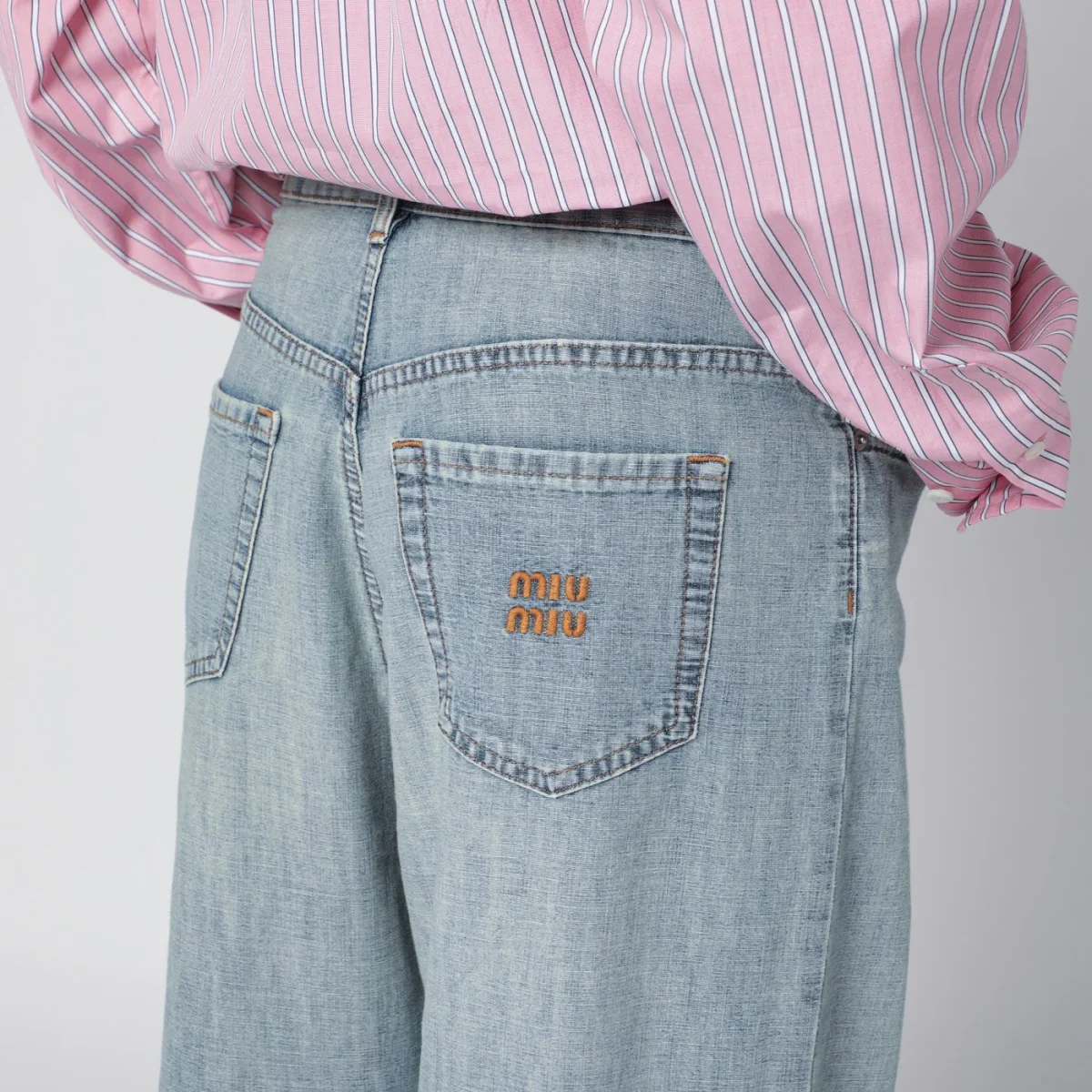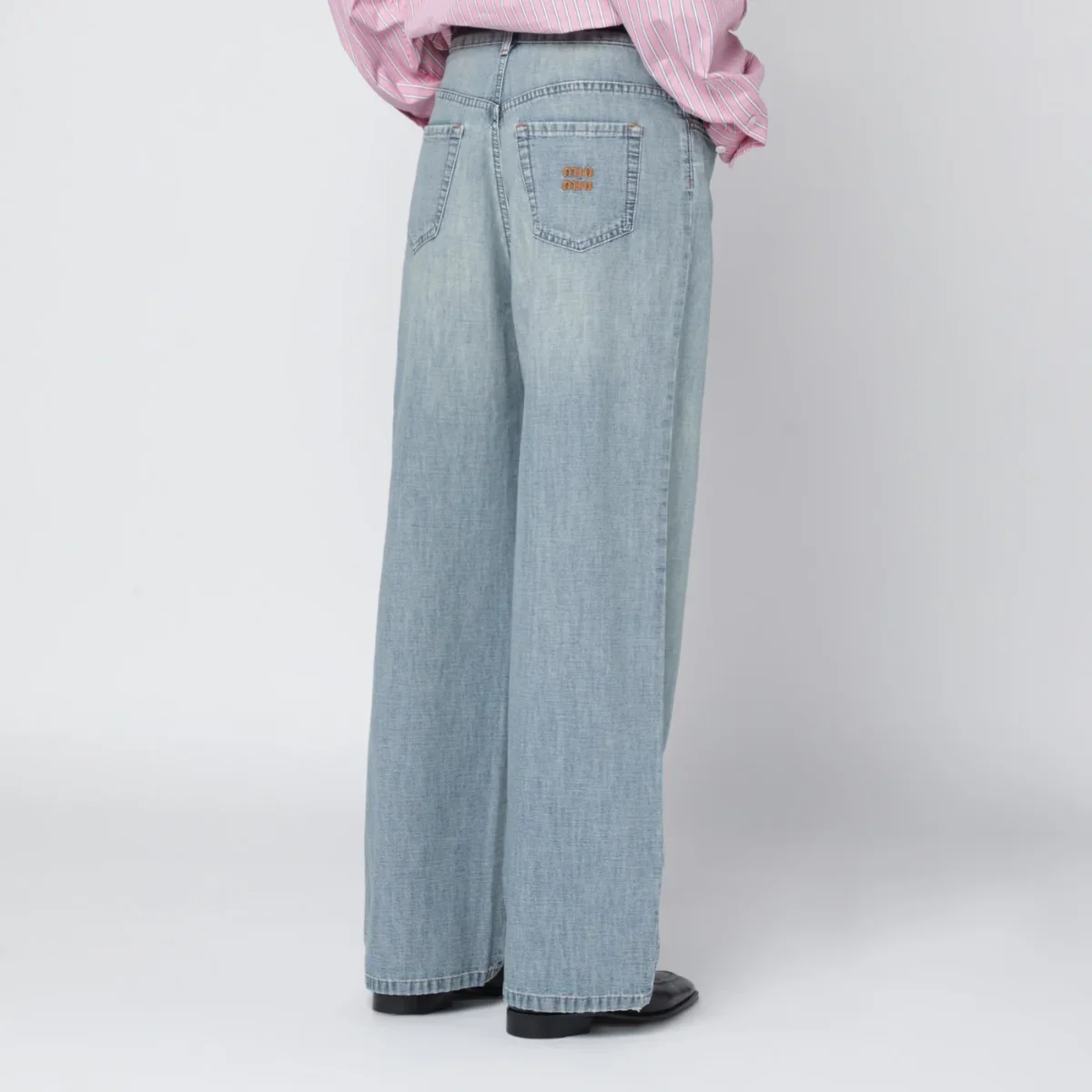 Jeans di Miu Miu in denim di cotone chambray celeste• trattamento stone washed• fit loose• vita alta• chiusura con zip e bottone• impunture a contrasto• tasche stondate frontali• tasche a toppa posteriori• logo ricamato sul retro