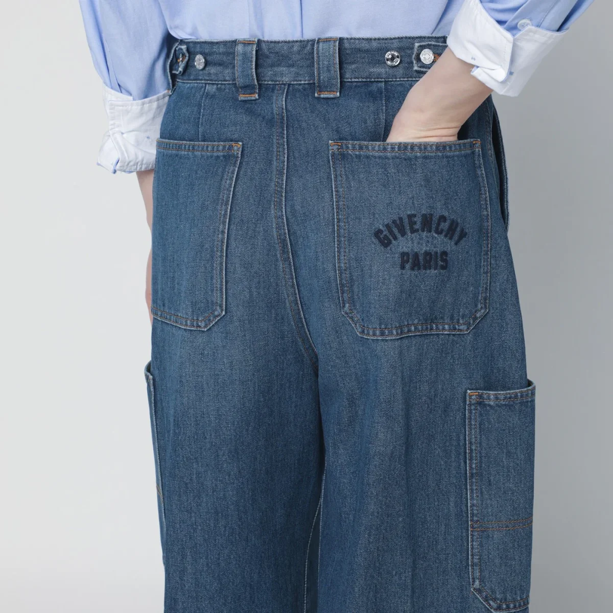 Jeans di Givenchy in denim di cotone blu medio effetto leggermente slavato• gamba cropped• chiusura frontale con zip e bottone• vita regolabile con bottoni• passanti• tre tasche anteriori• due tasche laterali•due tasche posteriori di cui una con ricamo logo lettering