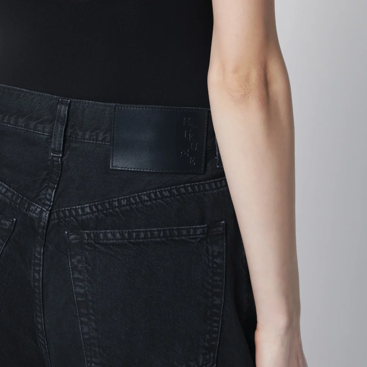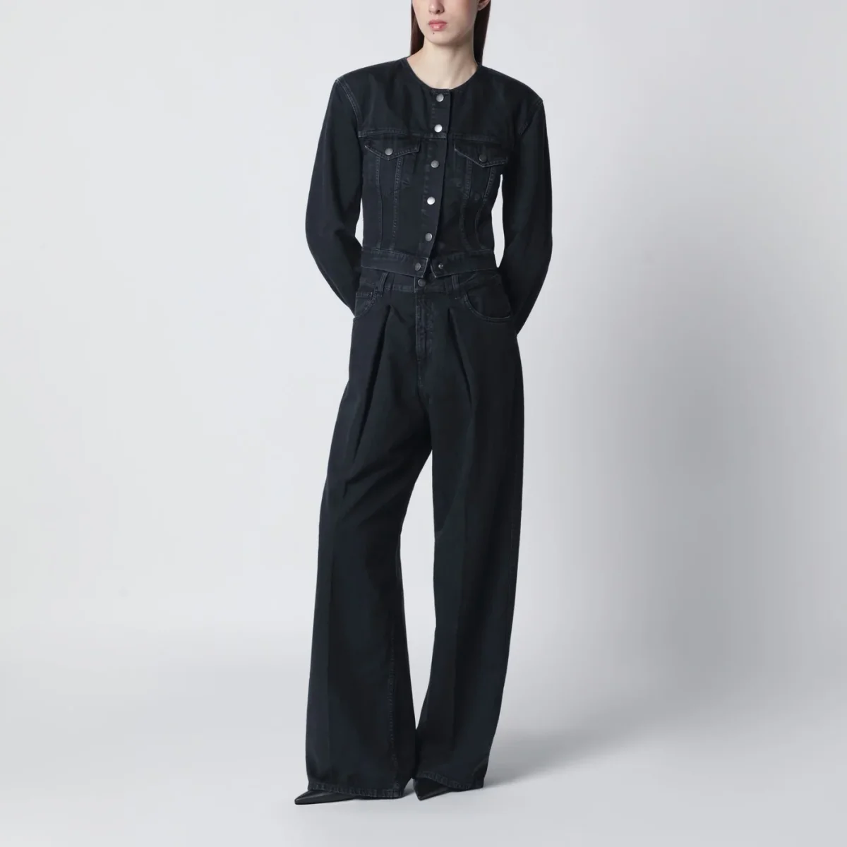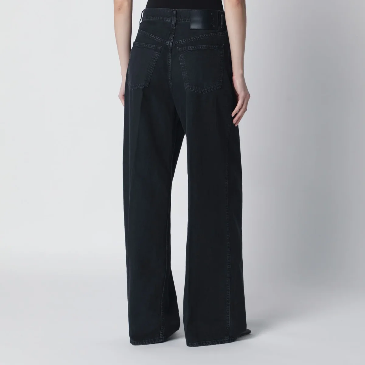Jeans ampio di Haikure in denim di cotone color carbone• vita bassa con passanti• pieghe sul davanti• chiusura frontale con zip e bottone• cinque tasche classiche• silhouette architettonica voluminosa• patch logo posteriore