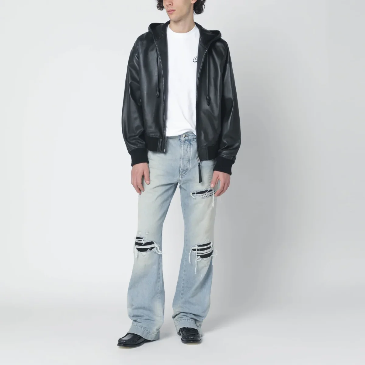Jeans di Amiri in denim di cotone blu chiaro effetto slavato• usure localizzate• chiusura frontale con zip e bottone• passanti in vita• cinque tasche classiche• patch logo posteriore• strappi sul davanti• bottoni a scatto alla caviglia