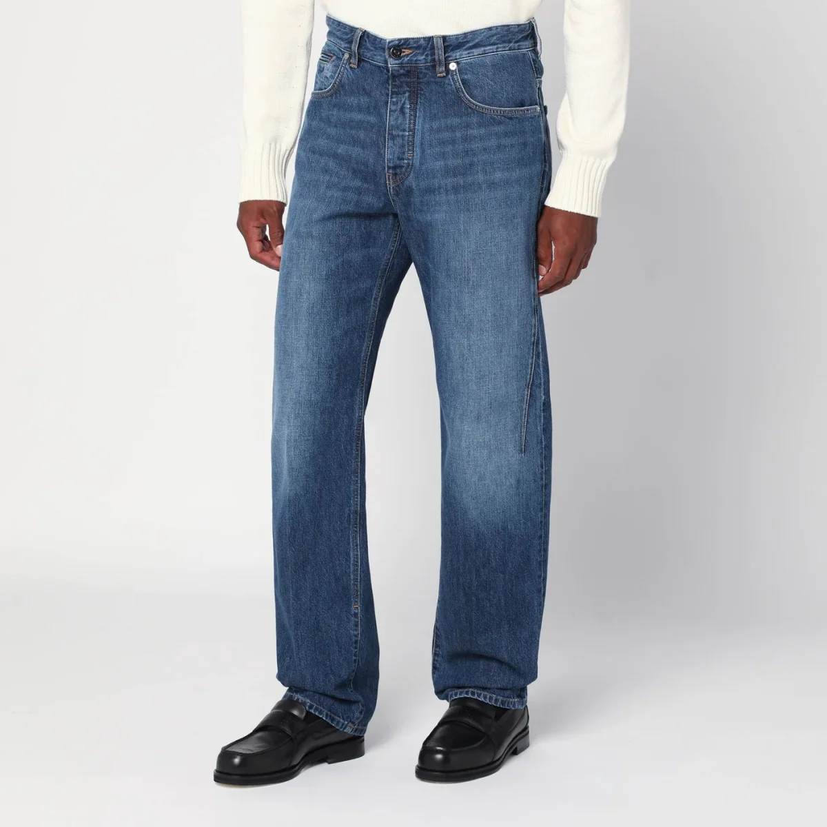 Jeans dritto di Givenchy in denim di cotone blu scuro effetto slavato, caratterizzato da chiusura frontale con zip e bottone, passanti in vita, cinque tasche classiche, ricamo logo lettering su tasca posteriore e patch logo sul retro.