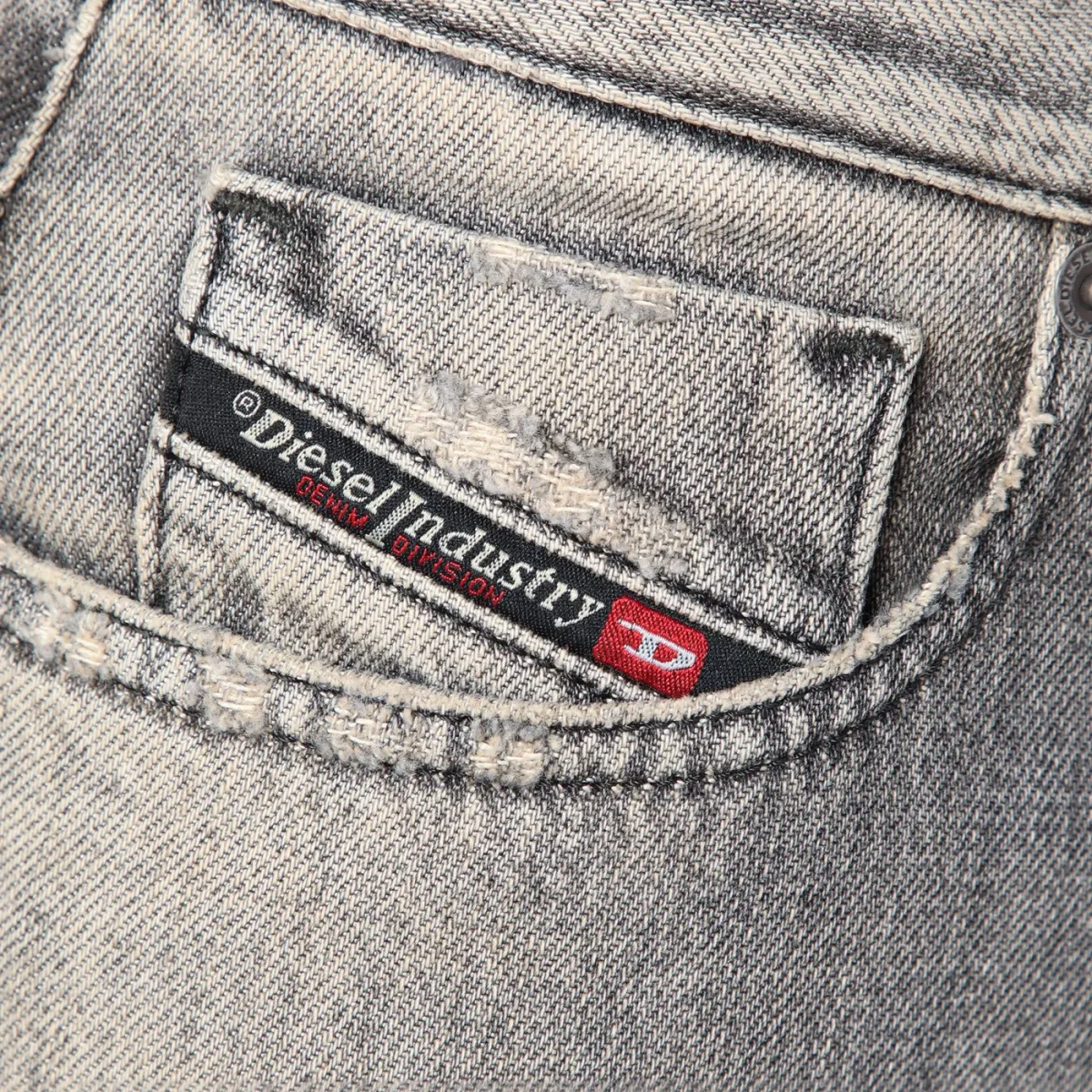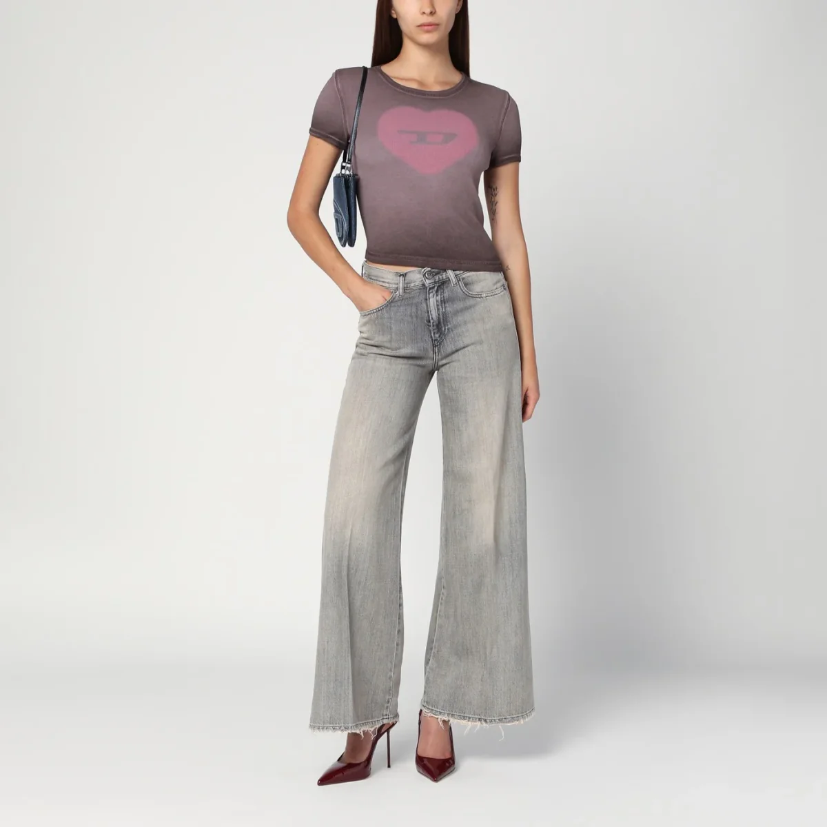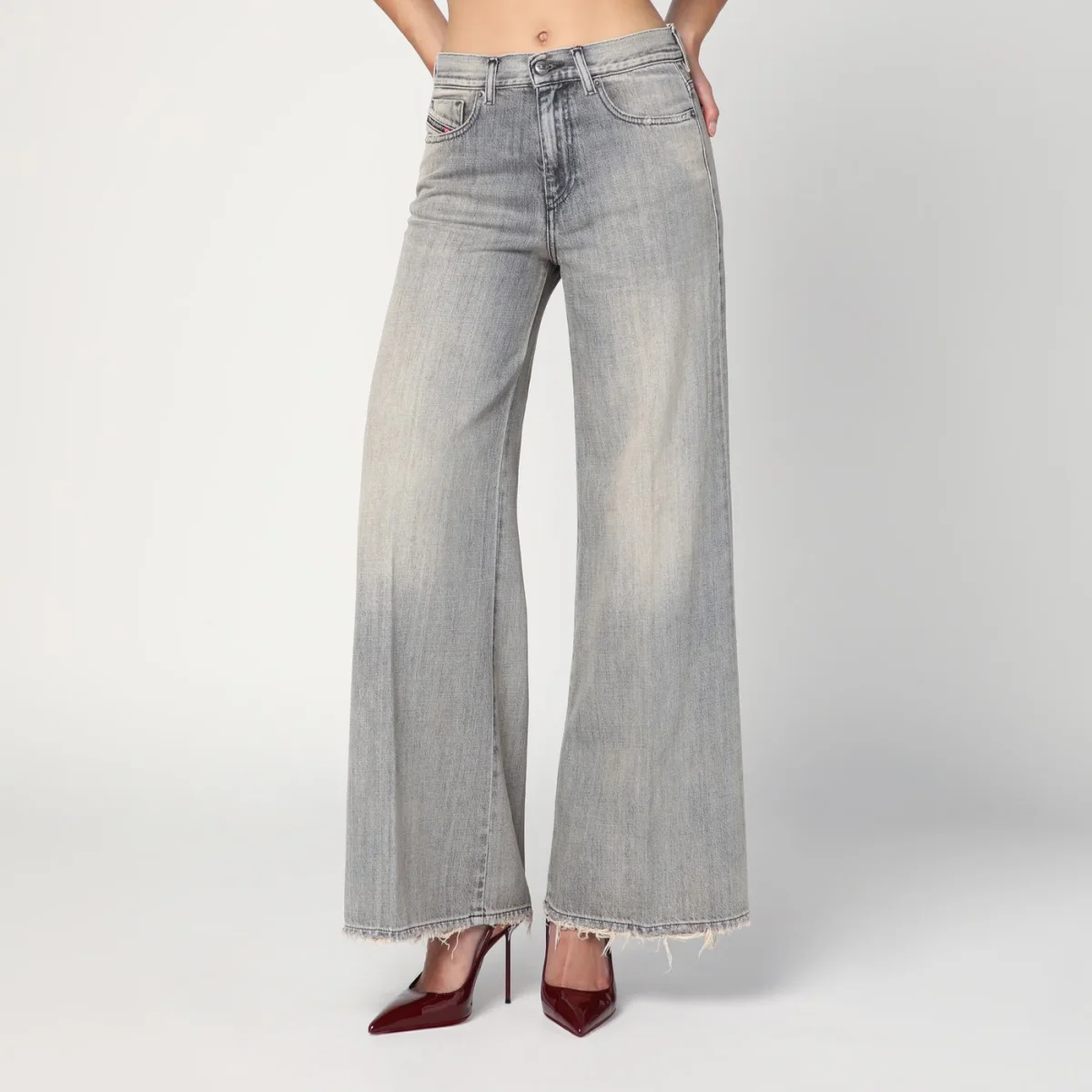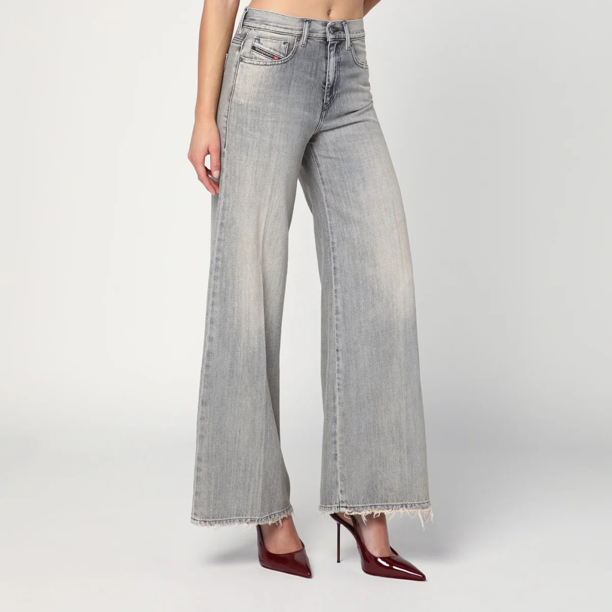 Jeans flared di Diesel in denim di misto cotone grigio effetto slavato, caratterizzato da chiusura frontale con zip e bottone, passanti in vita, cinque tasche classiche, ricamo logo sul retro, patch logo posteriore e orlo con dettagli sfrangiati.