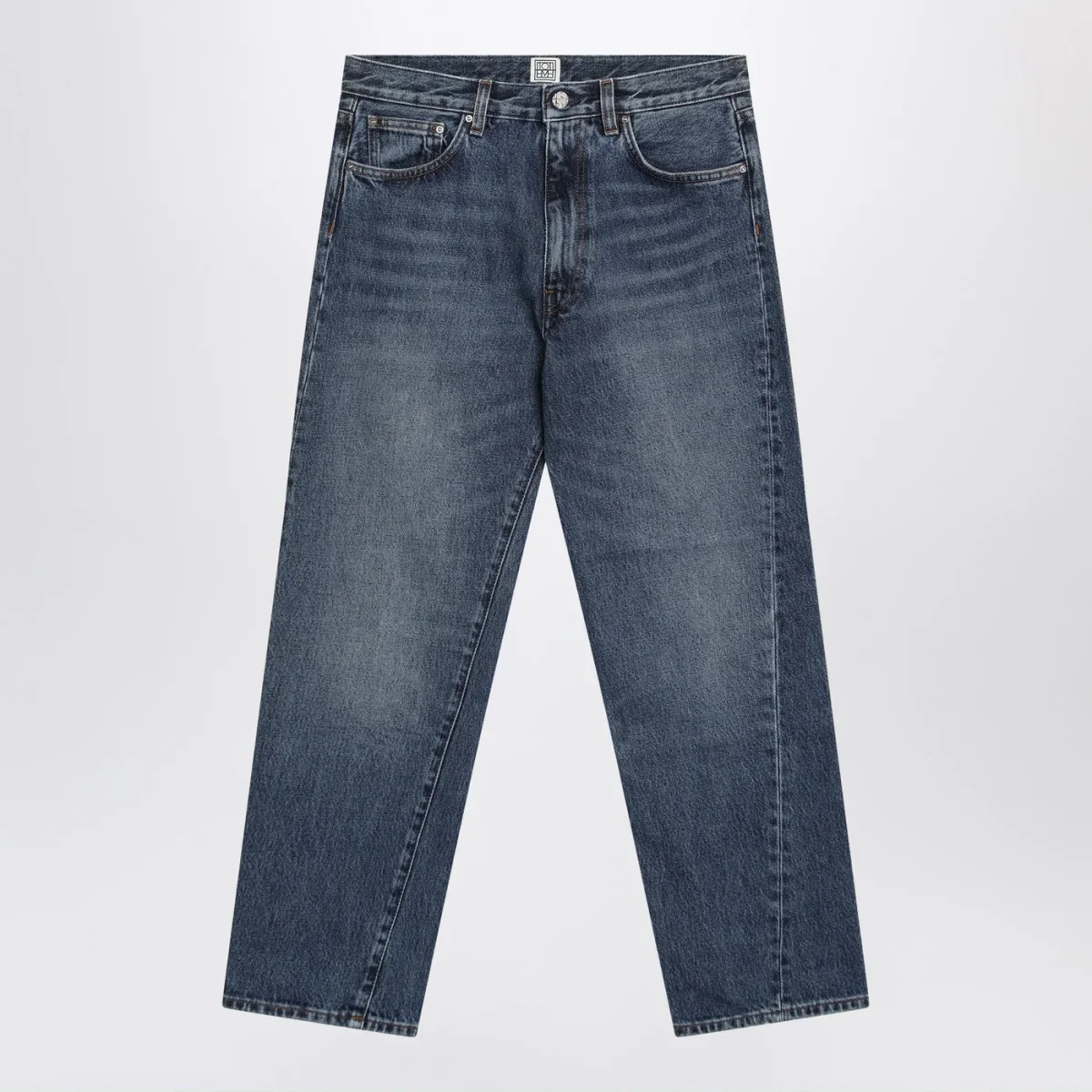 Jeans in denim di cotone blu slavato di TOTEME con passanti per cintura, cinque tasche classiche, chiusura frontale con zip e bottone e patch con logo sul retro.
