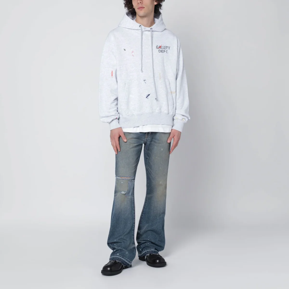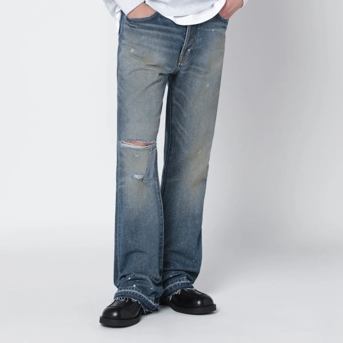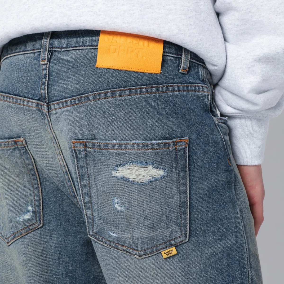 Jeans di Gallery Dept. in denim di cotone blu indaco effetto slavato, caratterizzati da strappi e toppe, usure localizzate, chiusura frontale con zip e bottone, passanti in vita, cinque tasche classiche e patch logo posteriore.