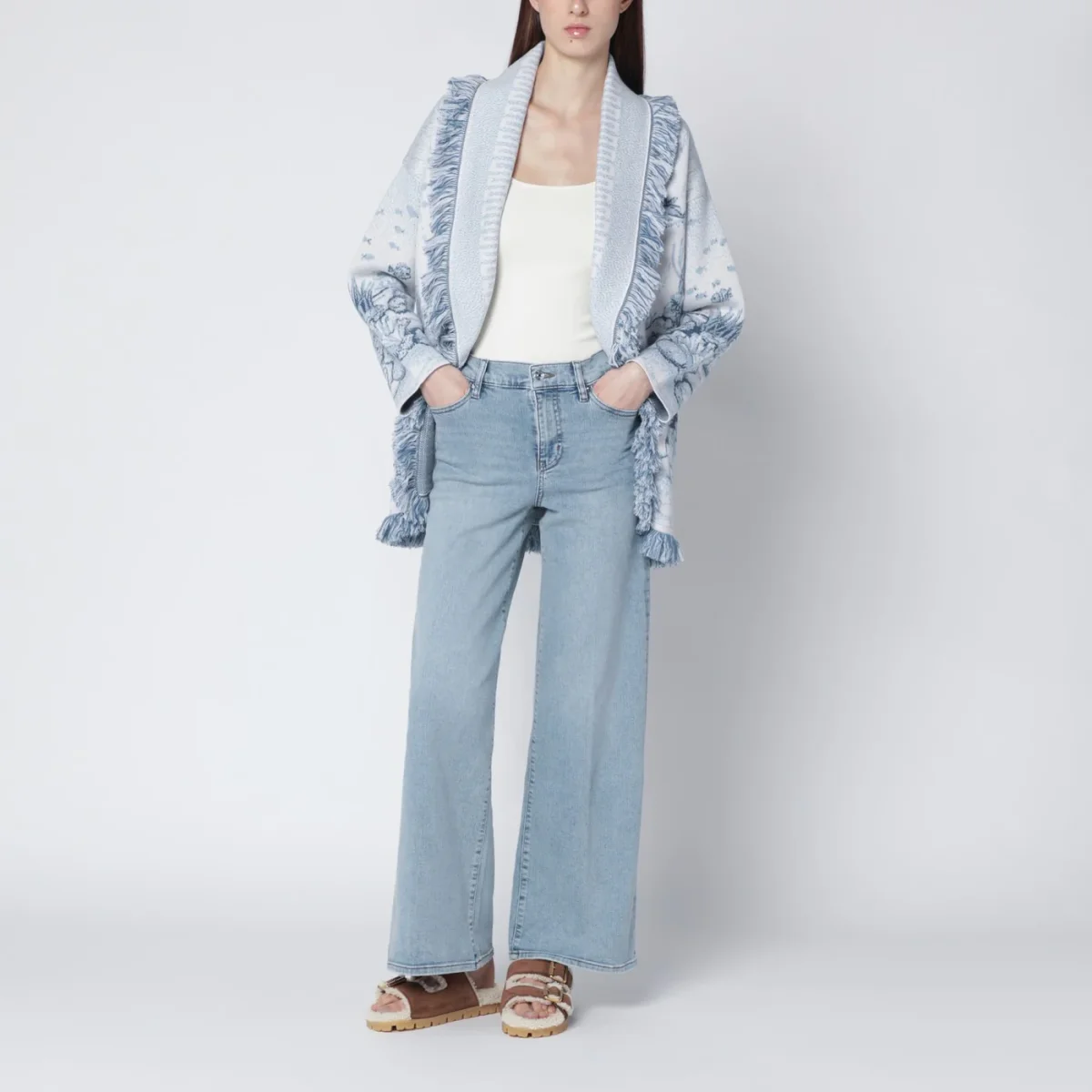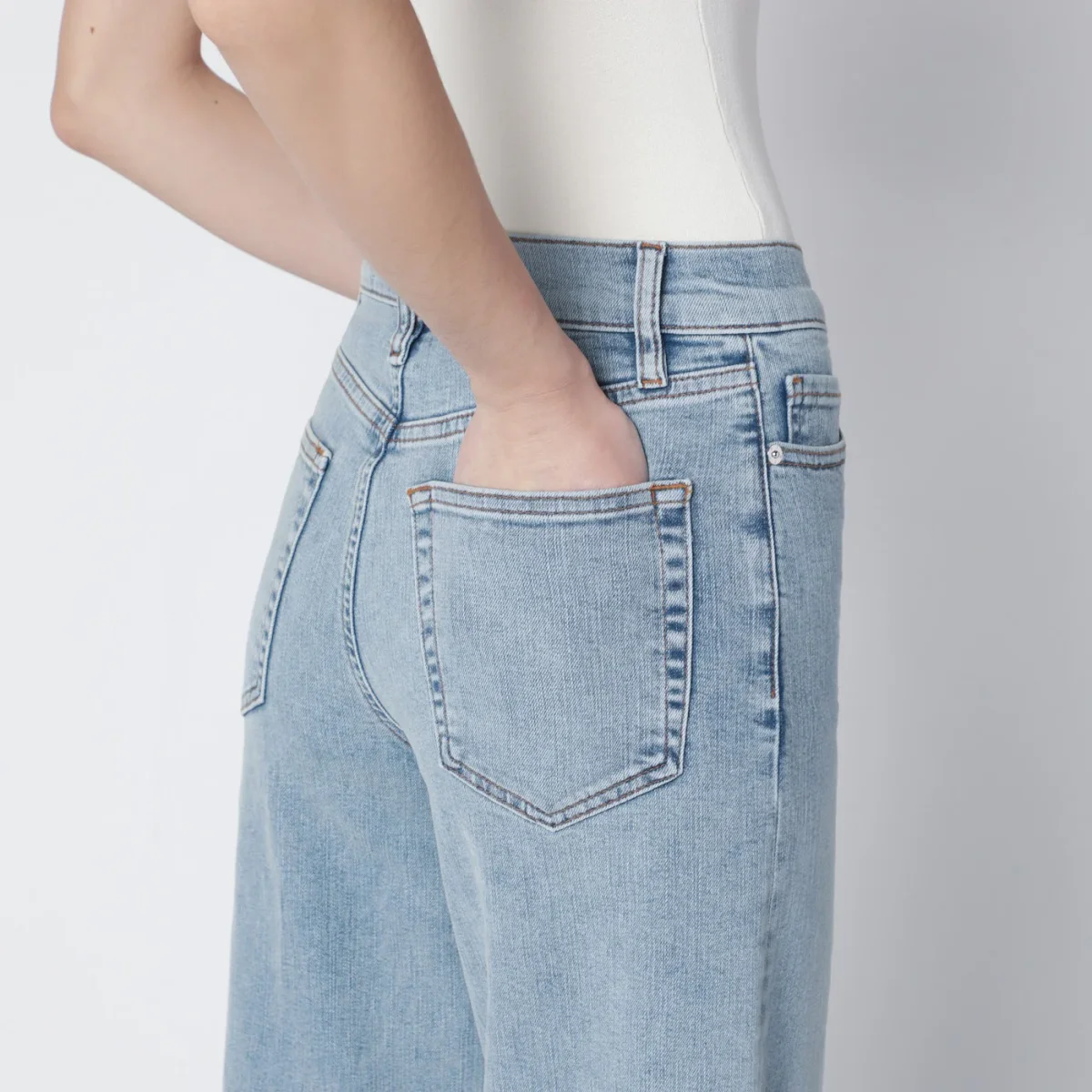 Jeans a palazzo di Frame in denim di cotone super stretch color azzurro Tribute• chiusura frontale con zip e bottone• passanti per cintura• cinque tasche classiche• vita alta con passanti