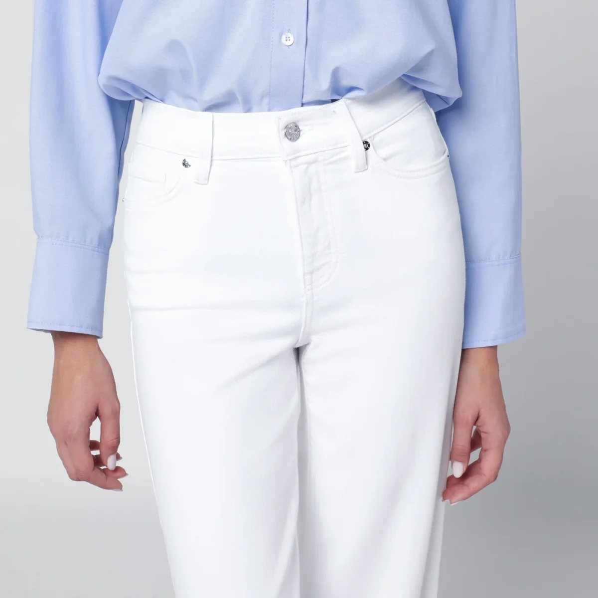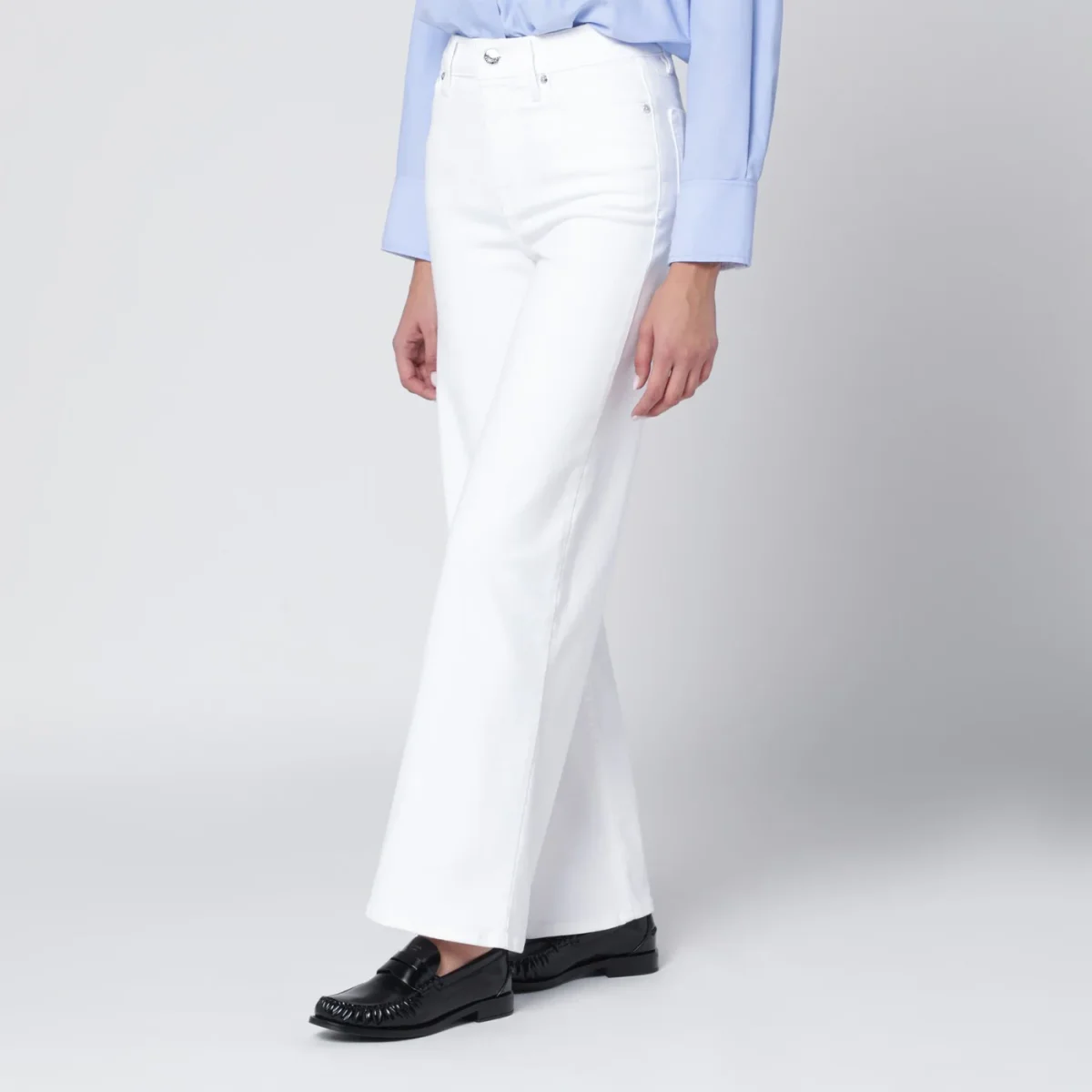 Jeans a palazzo di Frame in denim super stretch bianco• chiusura frontale con zip e bottone• passanti per cintura• cinque tasche classiche• vita alta con passanti