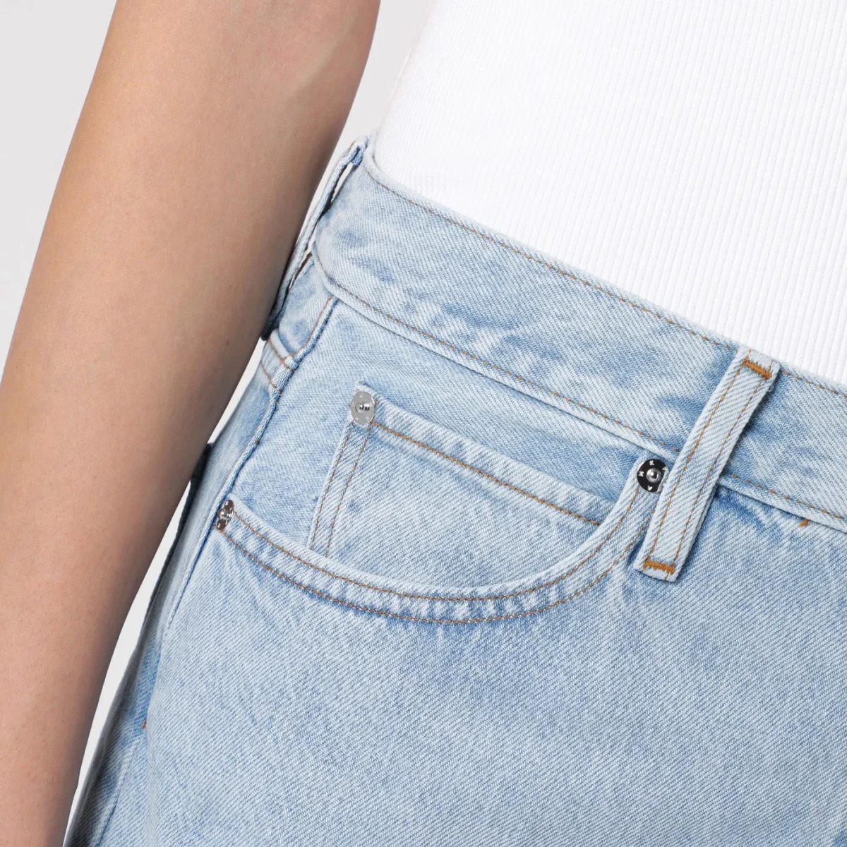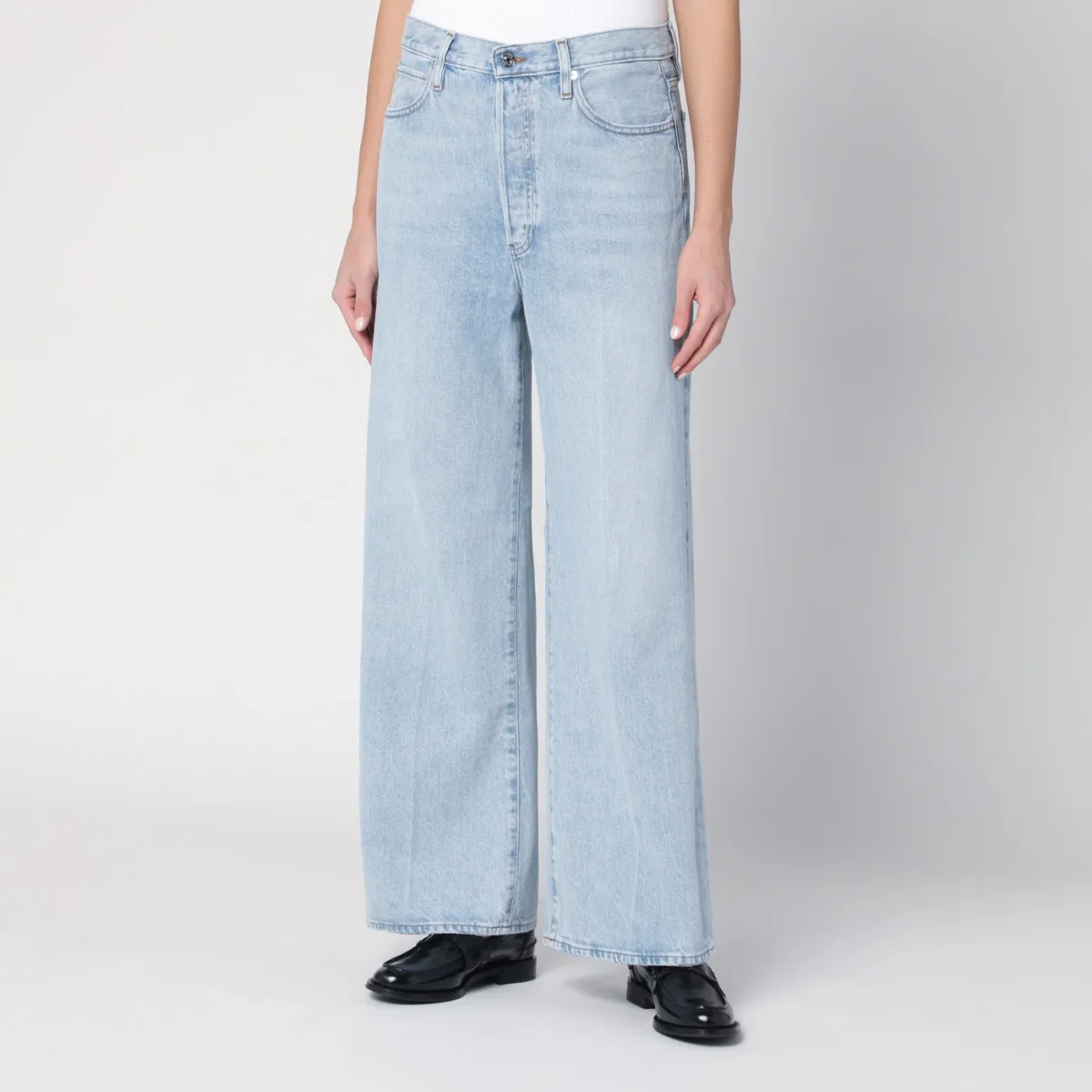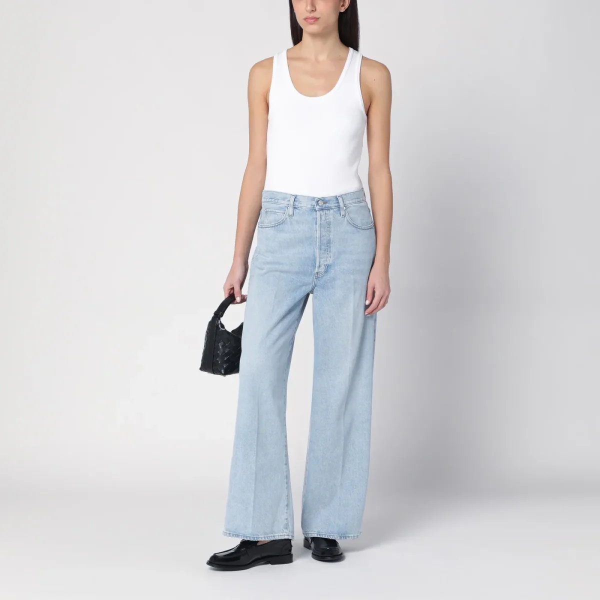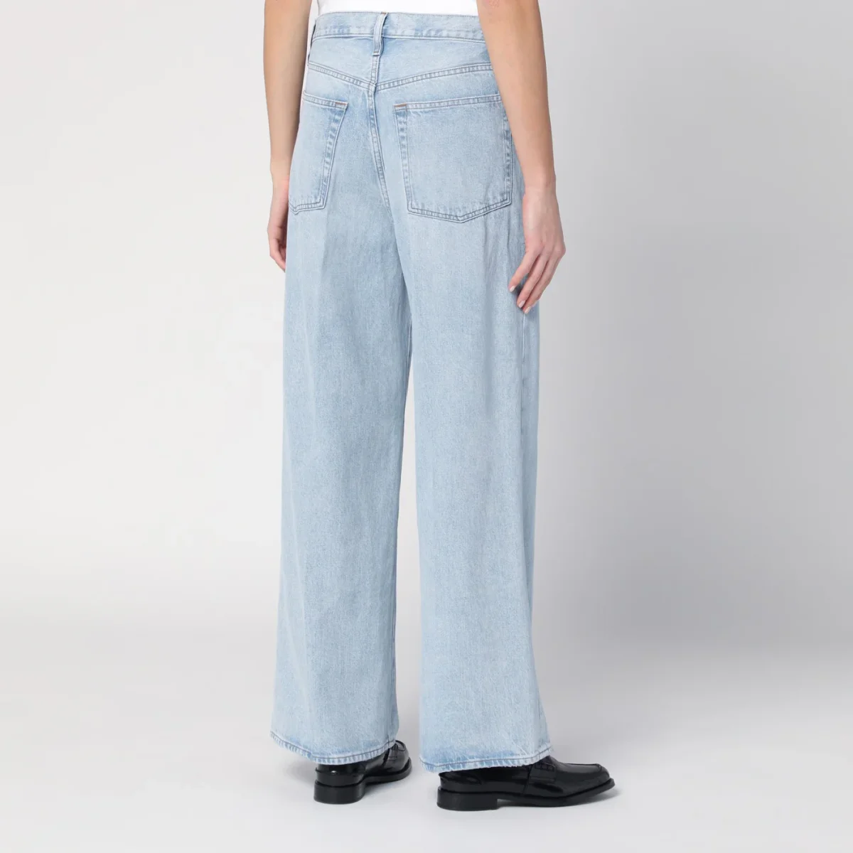 Jeans ampio di Frame in denim biologico e lyocell riciclato azzurro, caratterizzato da chiusura frontale con zip e bottone, passanti per cintura, cinque tasche classiche e vita alta.