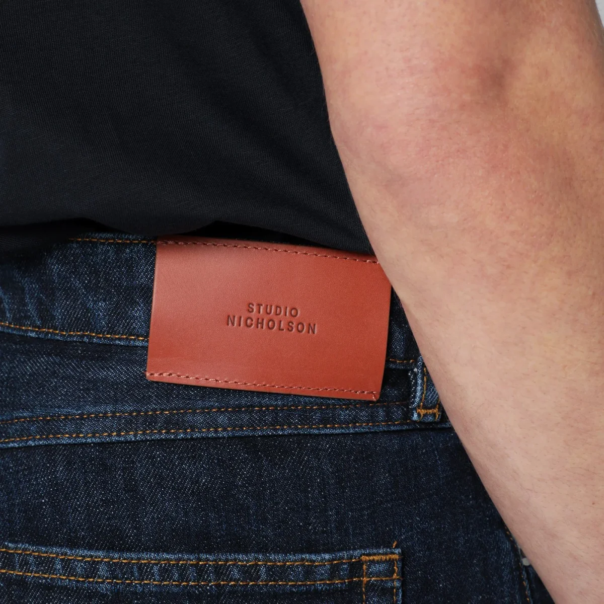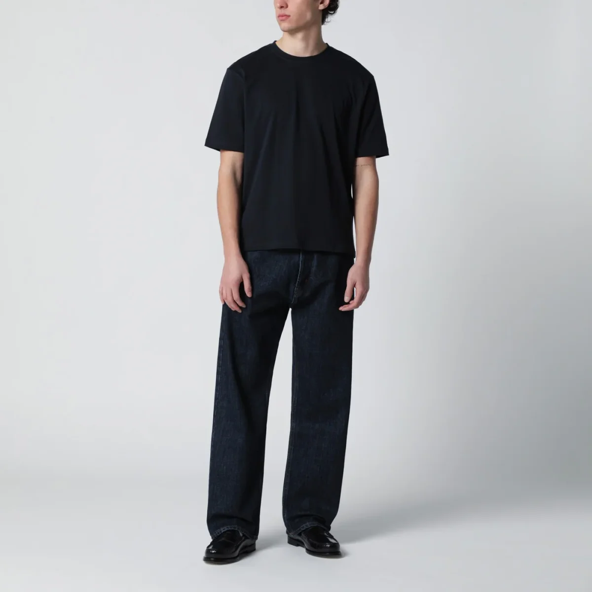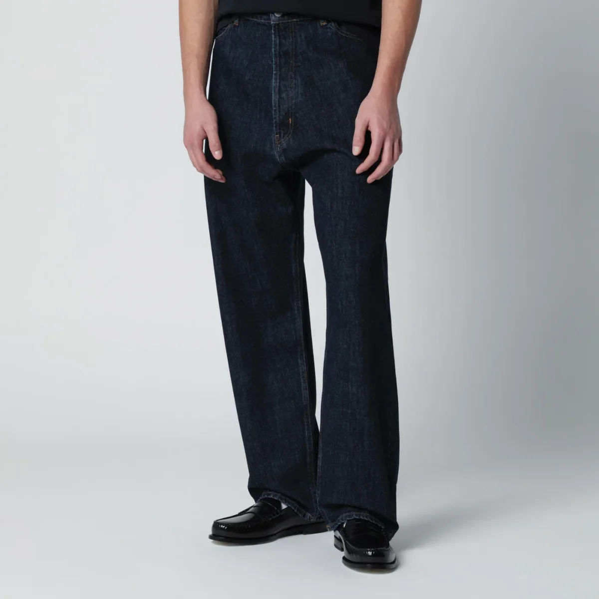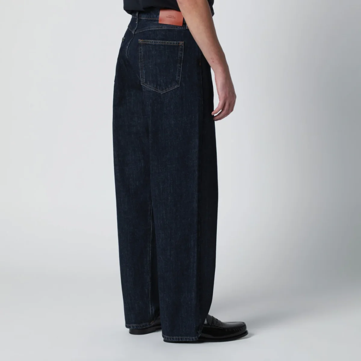 Jeans di Studio Nicholson in denim di cotone blu indaco, caratterizzati da taglio ampio e generoso sulla coscia, cinque tasche classiche, cavallo basso, chiusura frontale con zip e bottone, passanti in vita e cuciture a contrasto.