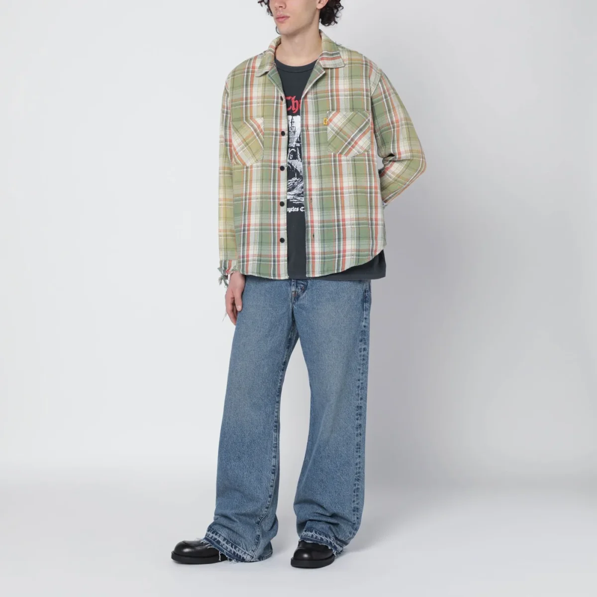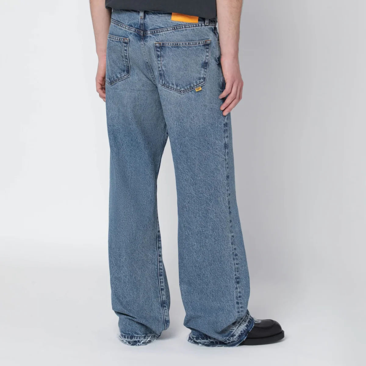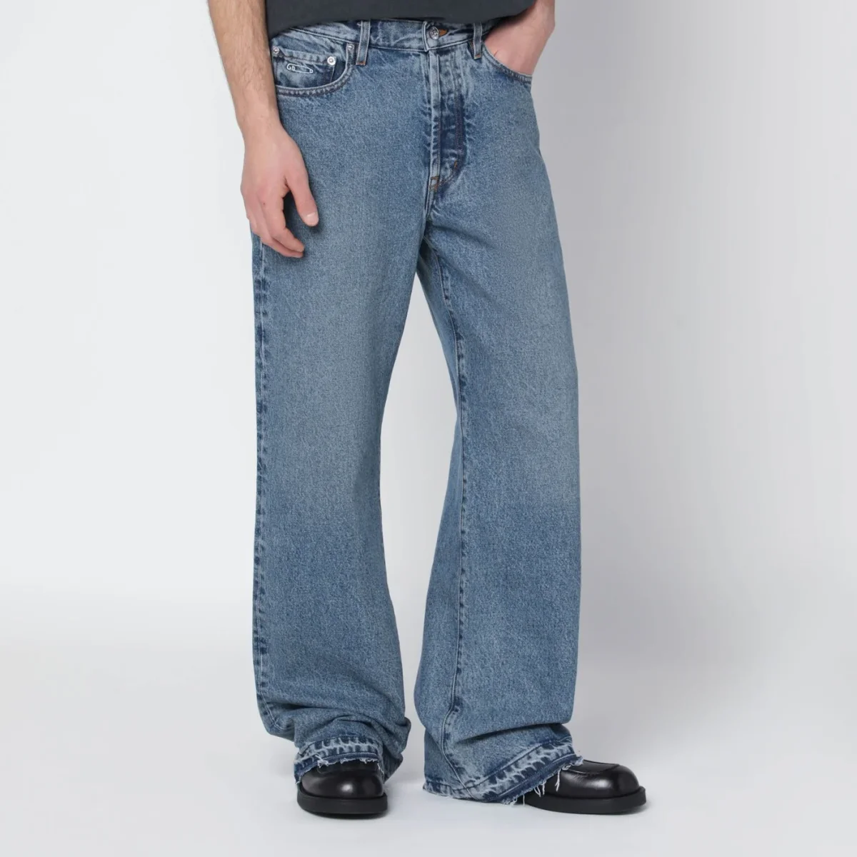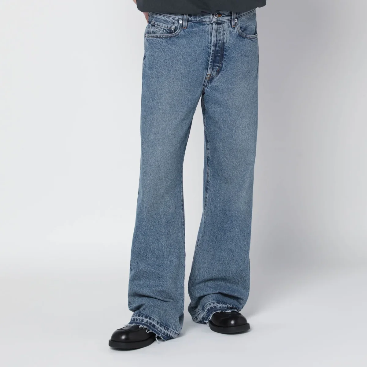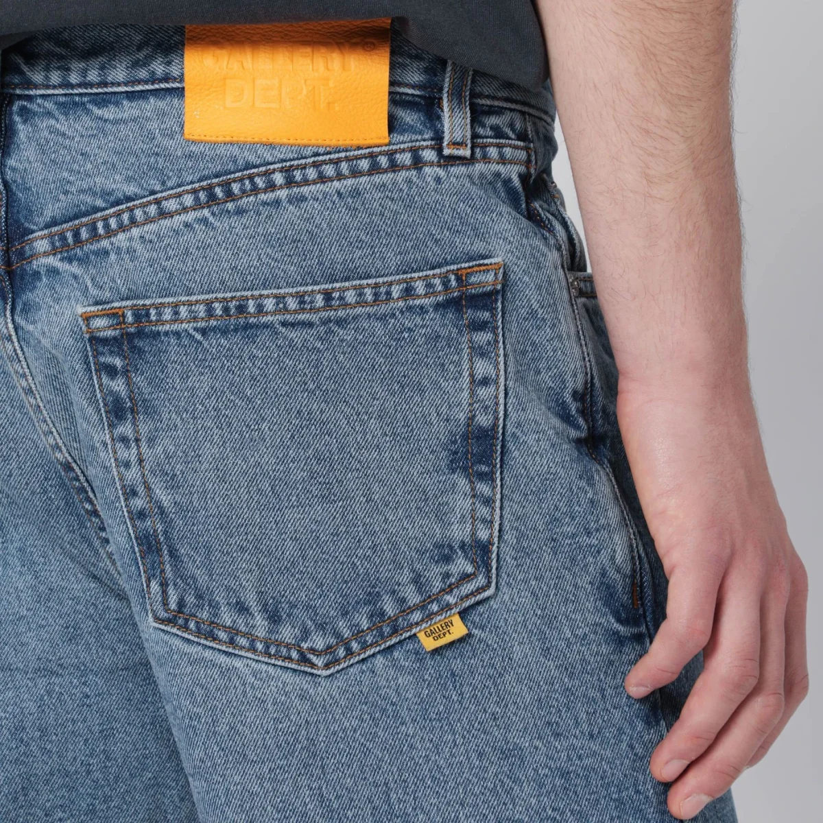 Jeans di Gallery Dept. in denim di cotone blu indaco medio, caratterizzati da chiusura frontale con zip e bottone, passanti in vita, cinque tasche classiche, patch logo posteriore, orlo a taglio vivo e spilla GD ricamata sul taschino portamonete.