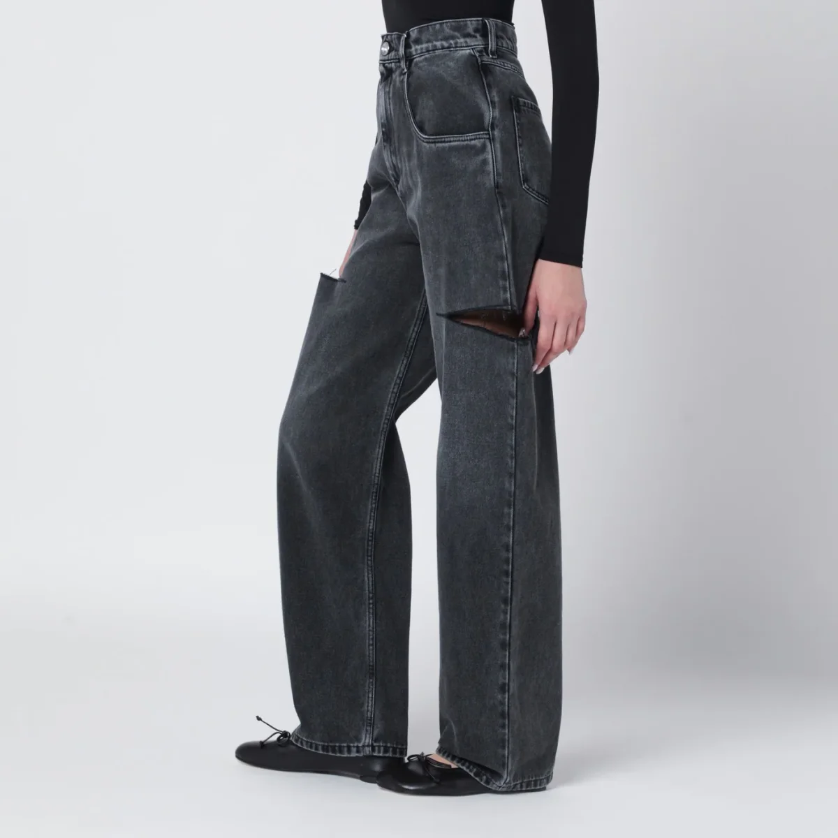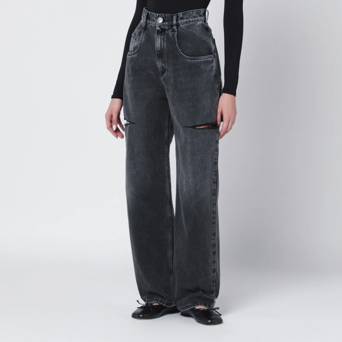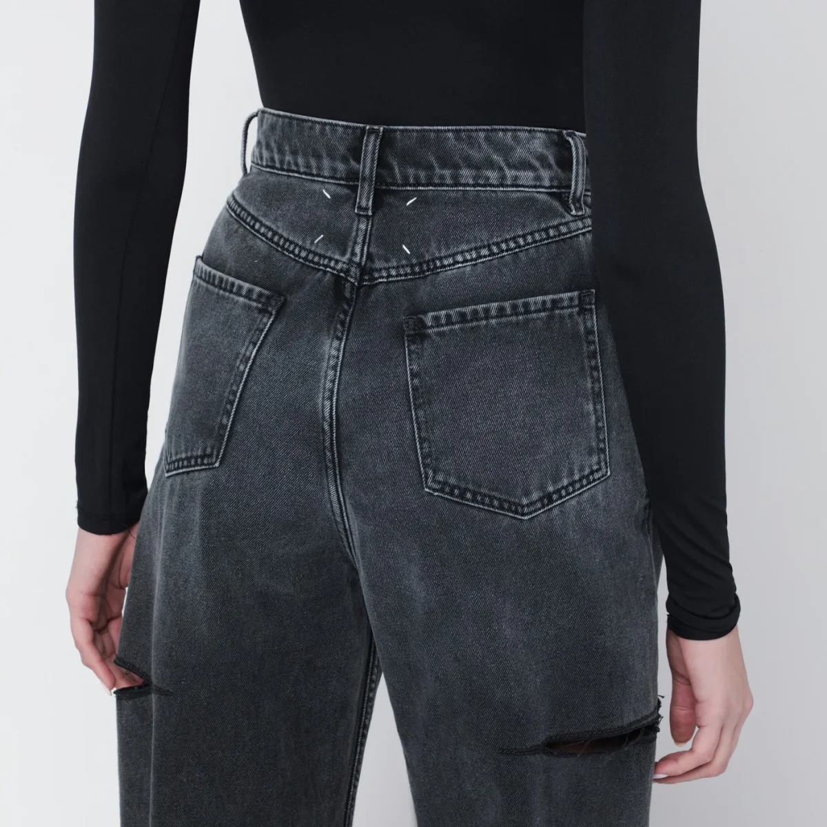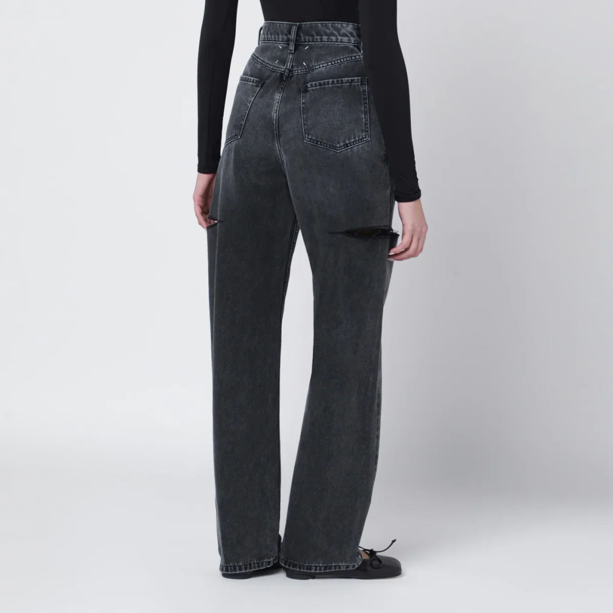 Jeans di Maison Margiela in denim di cotone nero effetto slavato• chiusura frontale con zip e bottone• vita alta con passanti• cinque tasche classiche• dettagli con strappi ai lati• logo Four Stitches sul retro