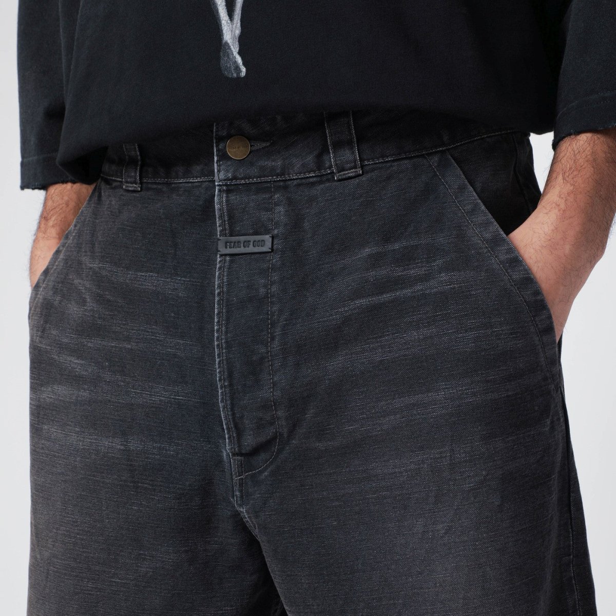 Jeans di Fear of God in denim di cotone nero effetto slavato, caratterizzato da passanti in vita, due tasche laterali, due tasche posteriori e chiusura con zip e bottone con etichetta con logo impresso sul davanti.