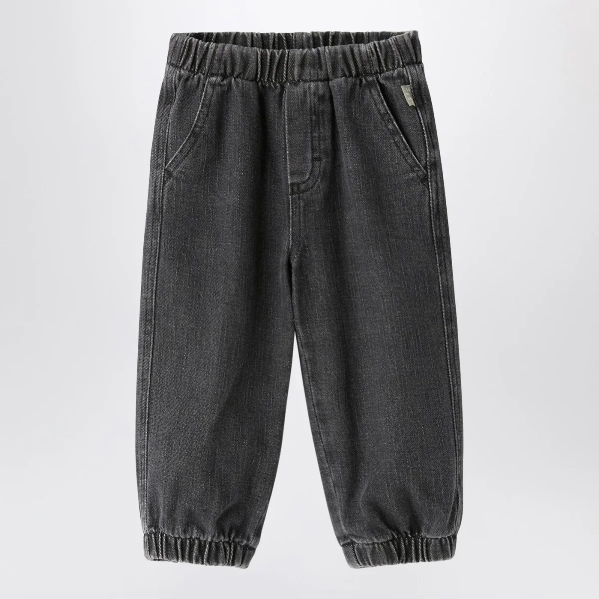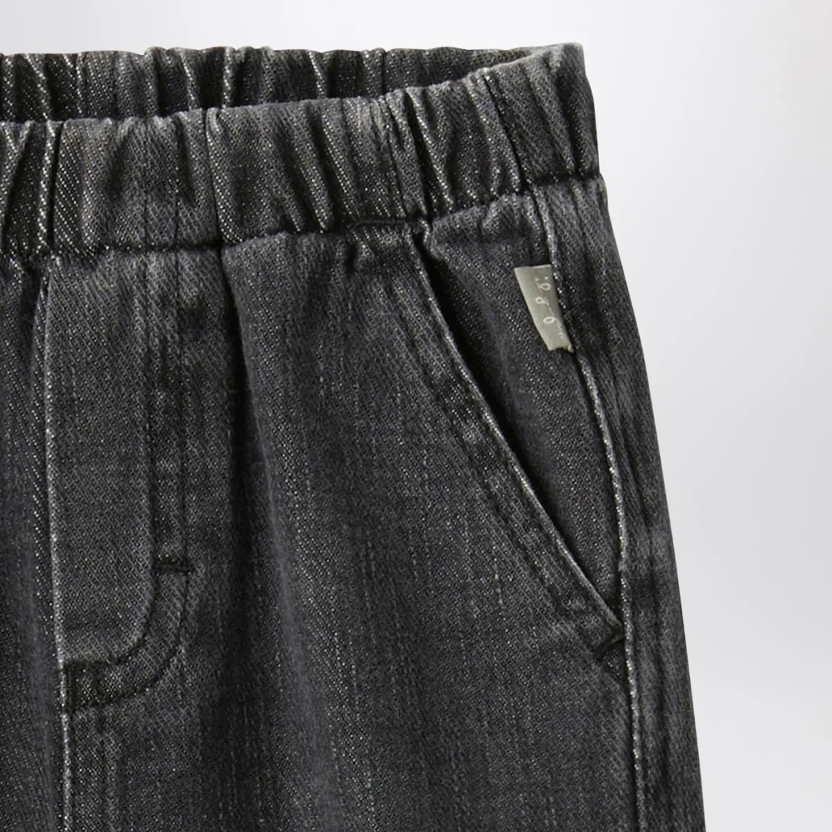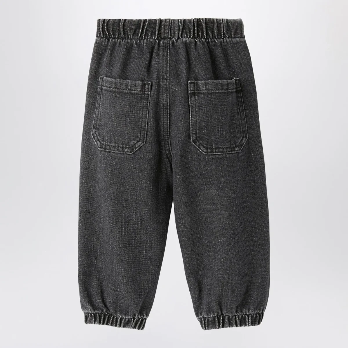 Jeans de Il Gufo in denim di cotone nero slavato, caratterizzato da vita elasticizzata, due tasche a filetto laterali con patch logo, due tasche sul retro e caviglie elasticizzate.